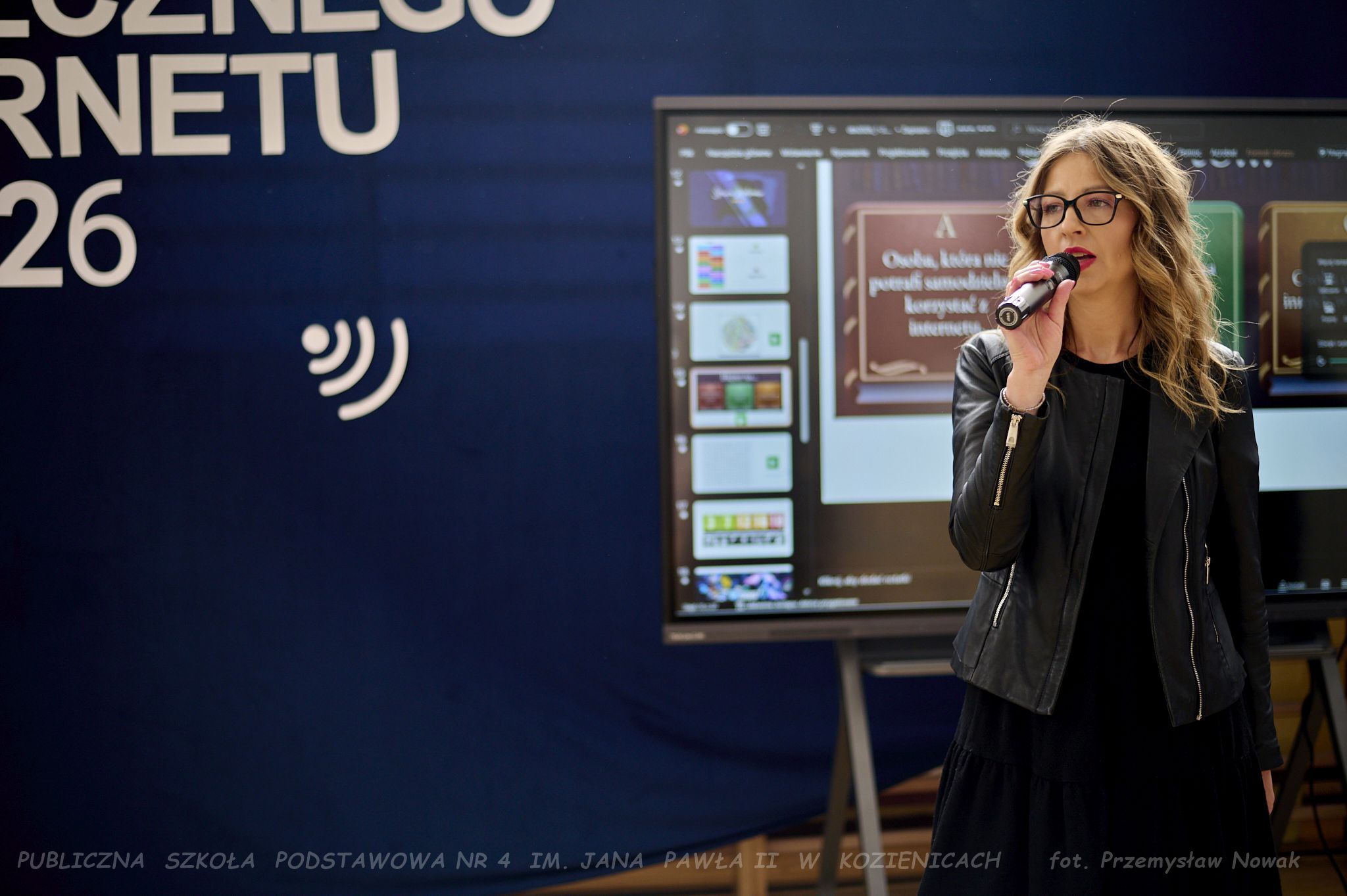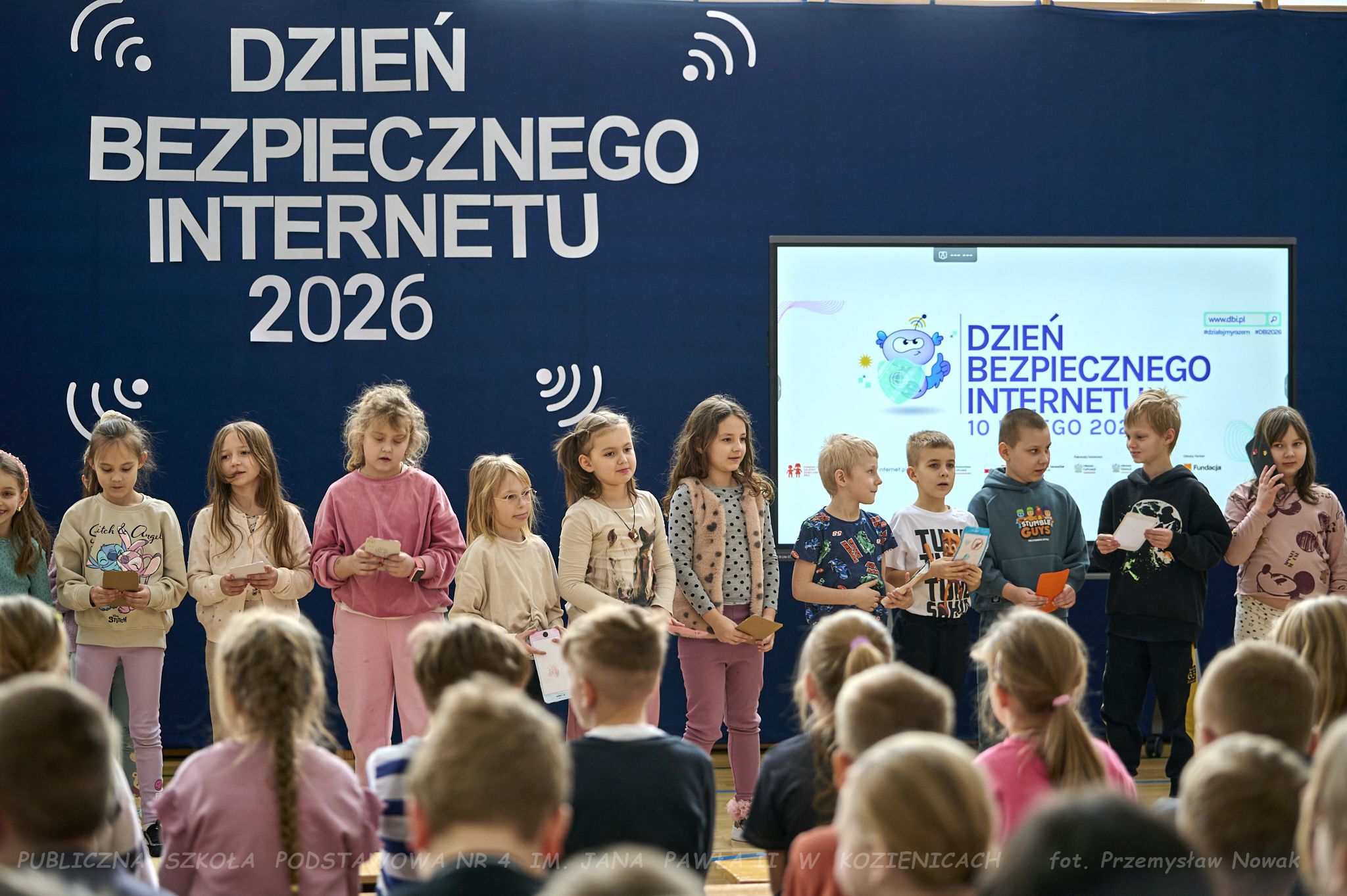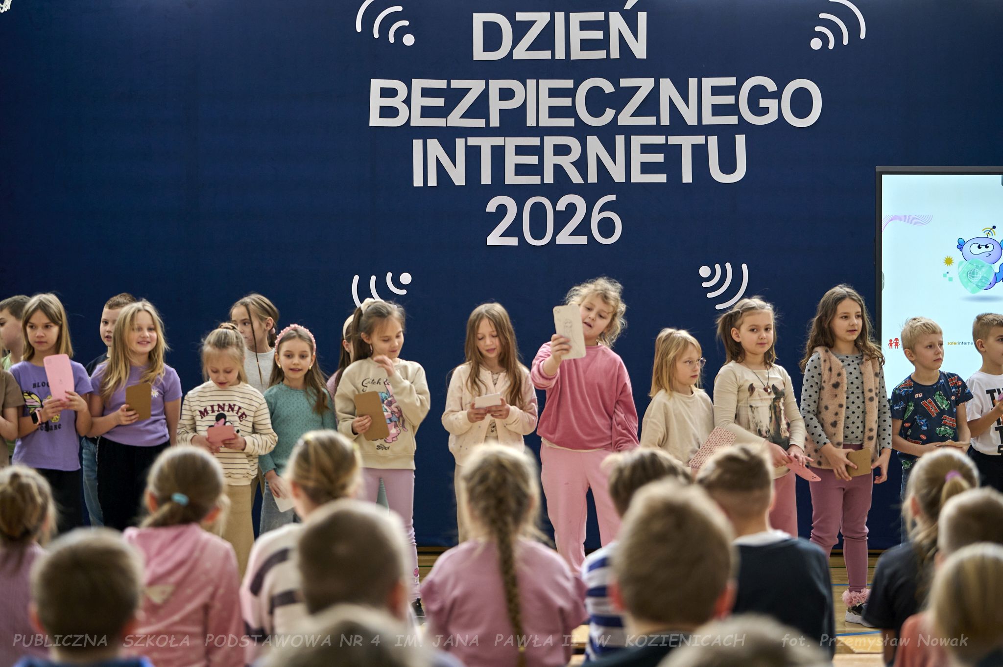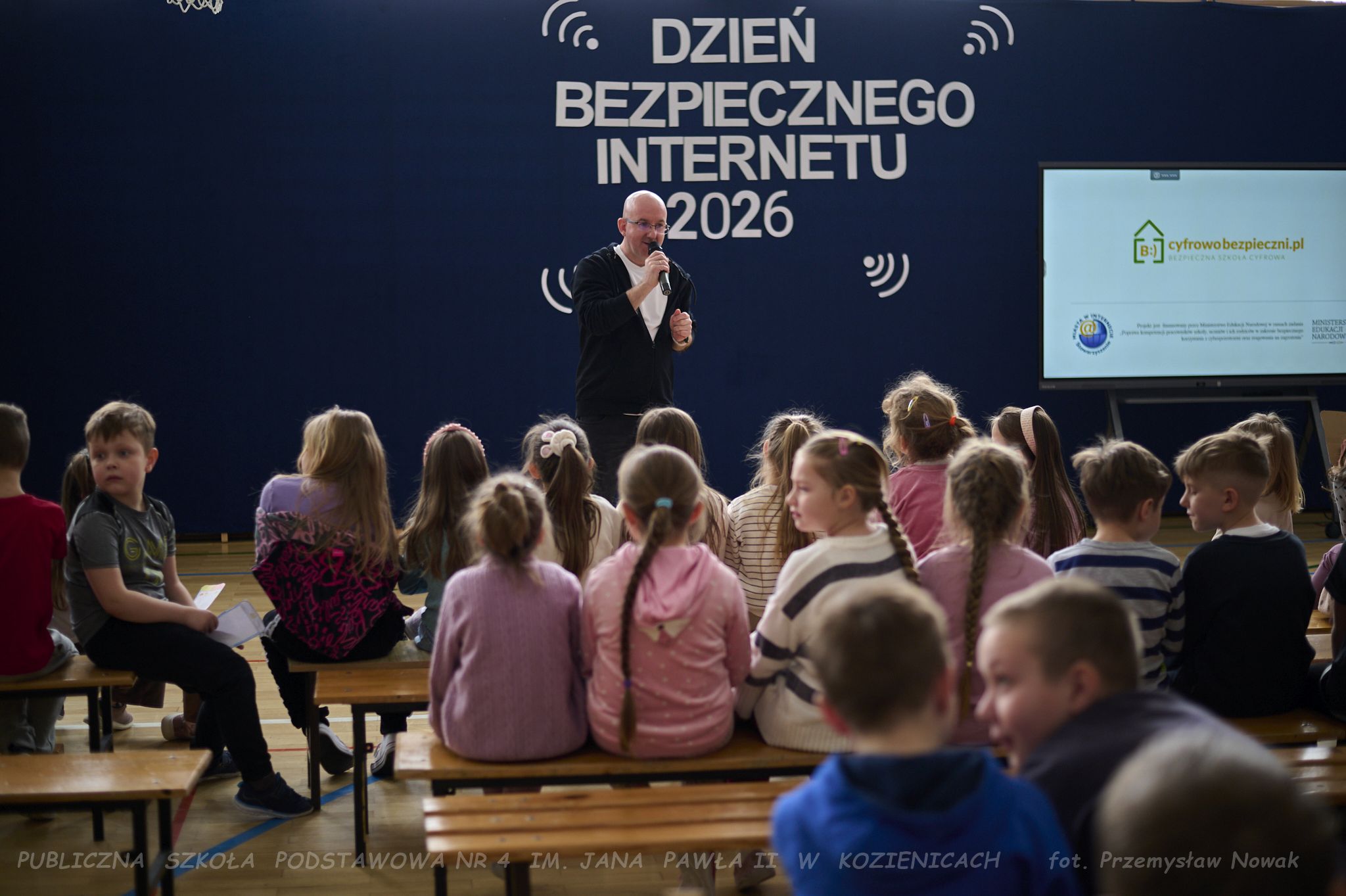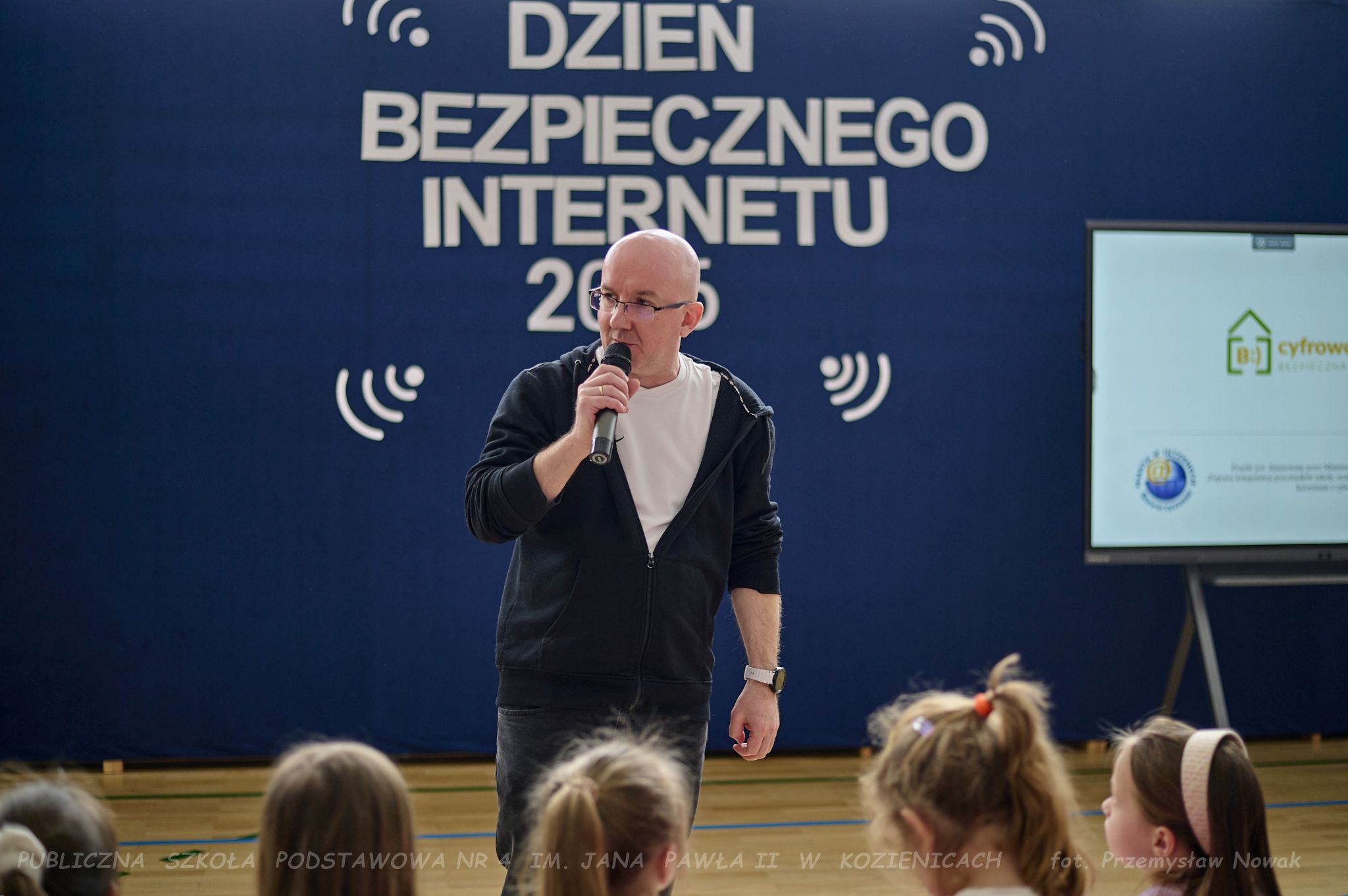 i przedstawił organizatorów wydarzenia: panią Joannę Lenarczyk, panią Małgorzatę Sienkiewicz oraz pana Sebastiana Kotlarka. Dzieci z klasy 1a i 1c zaśpiewały piosenkę “Z internetem Świat jest bliski”, a następnie spotkanie poprowadził nauczyciel informatyki