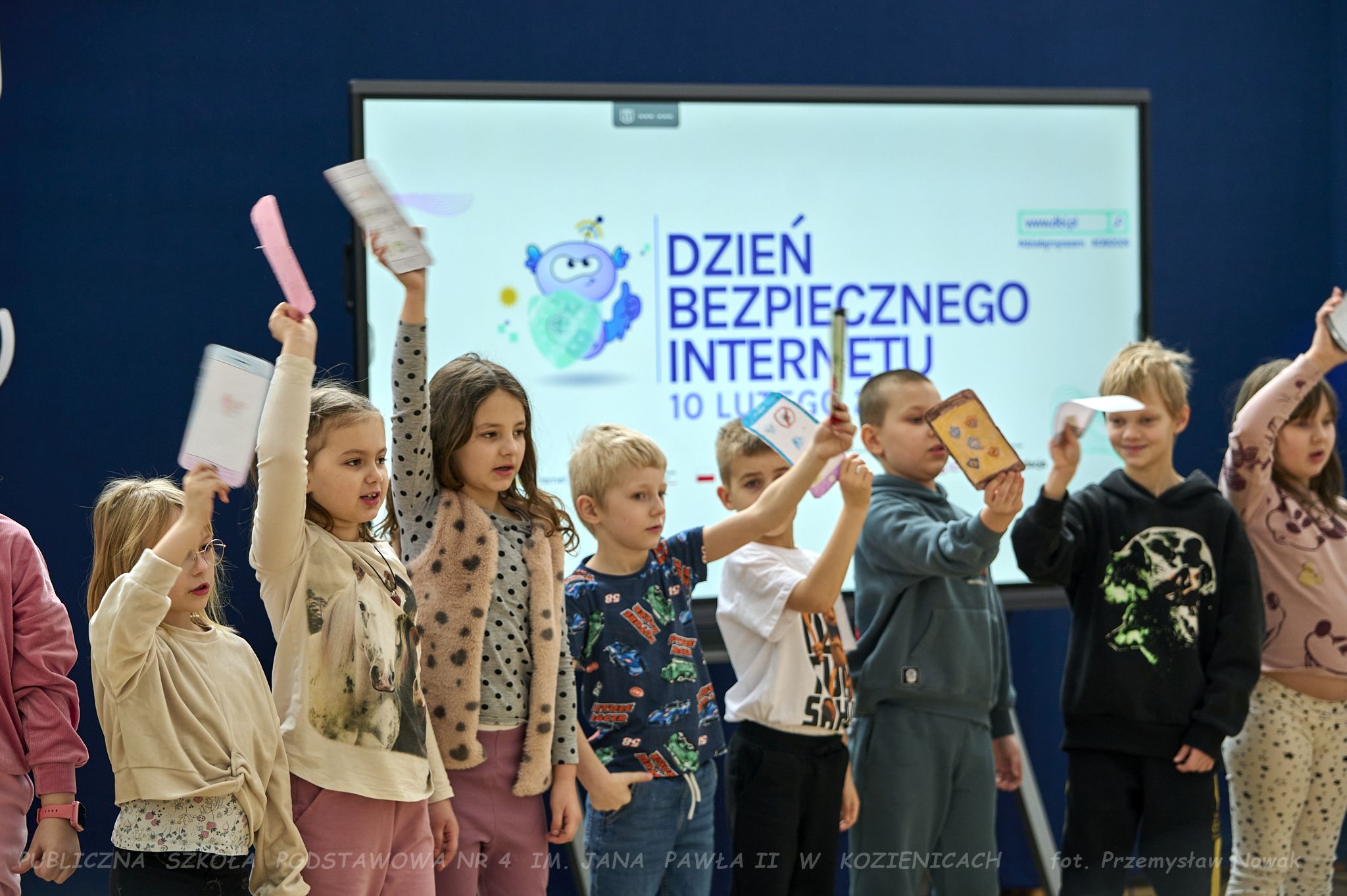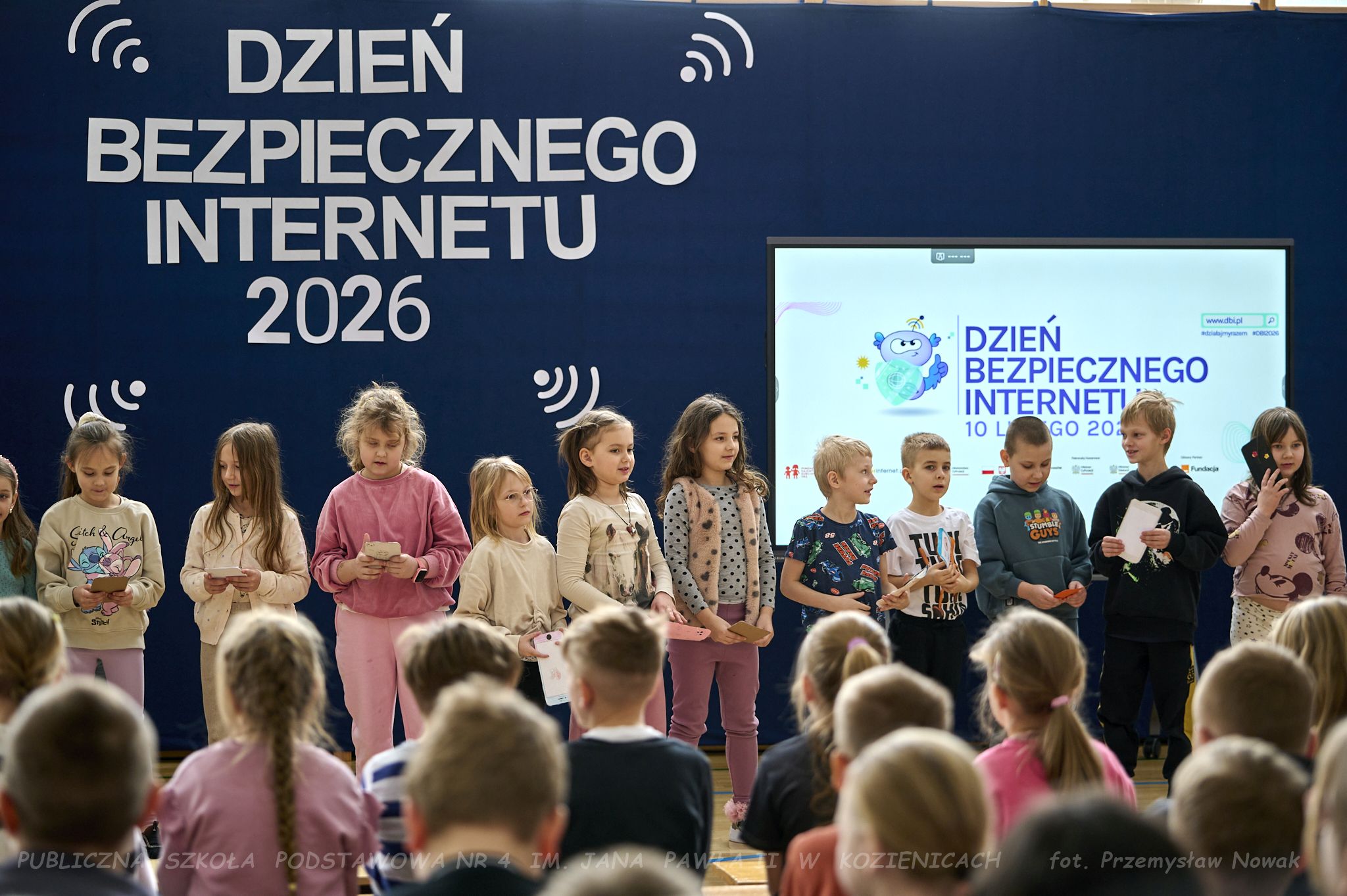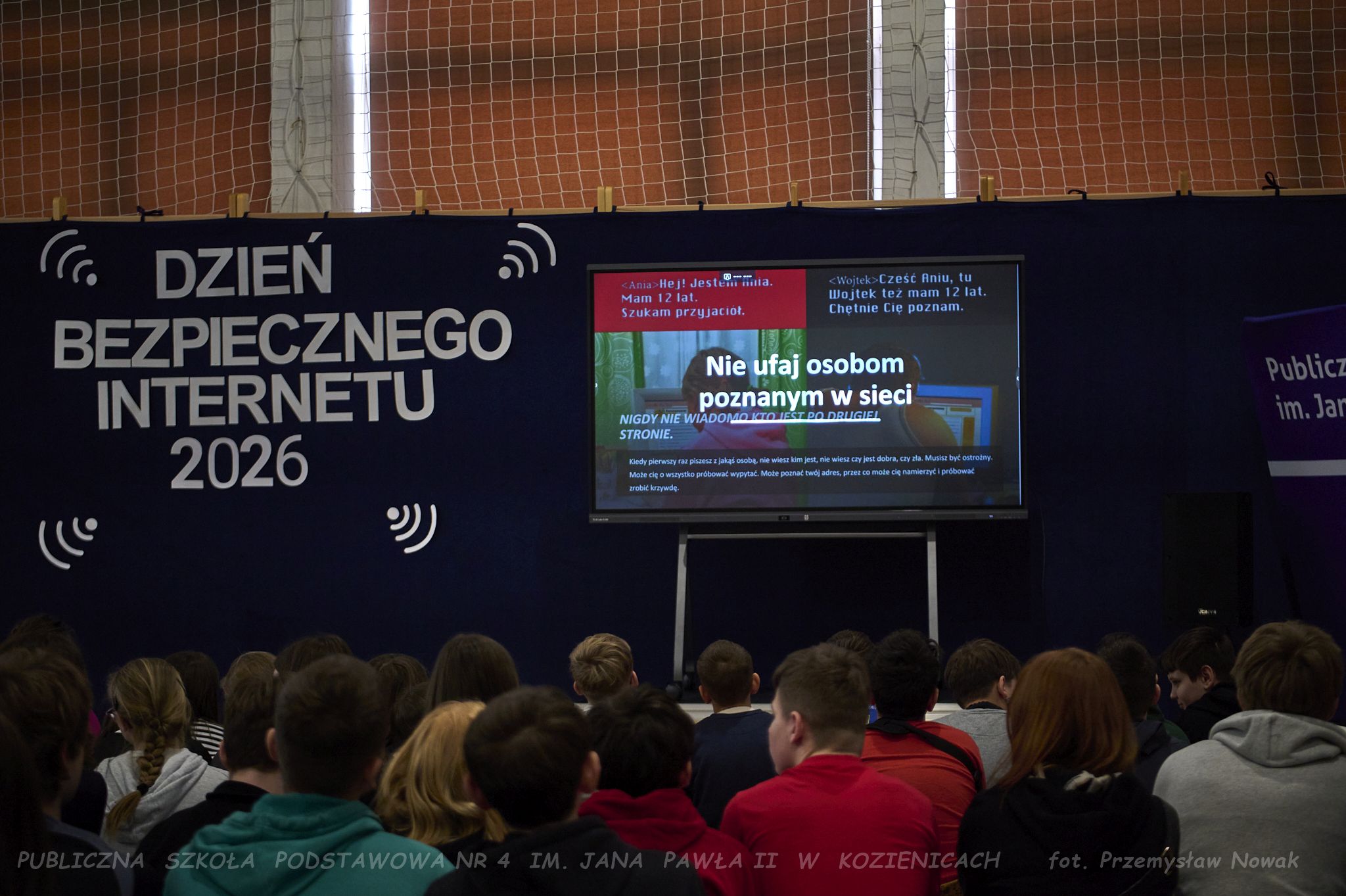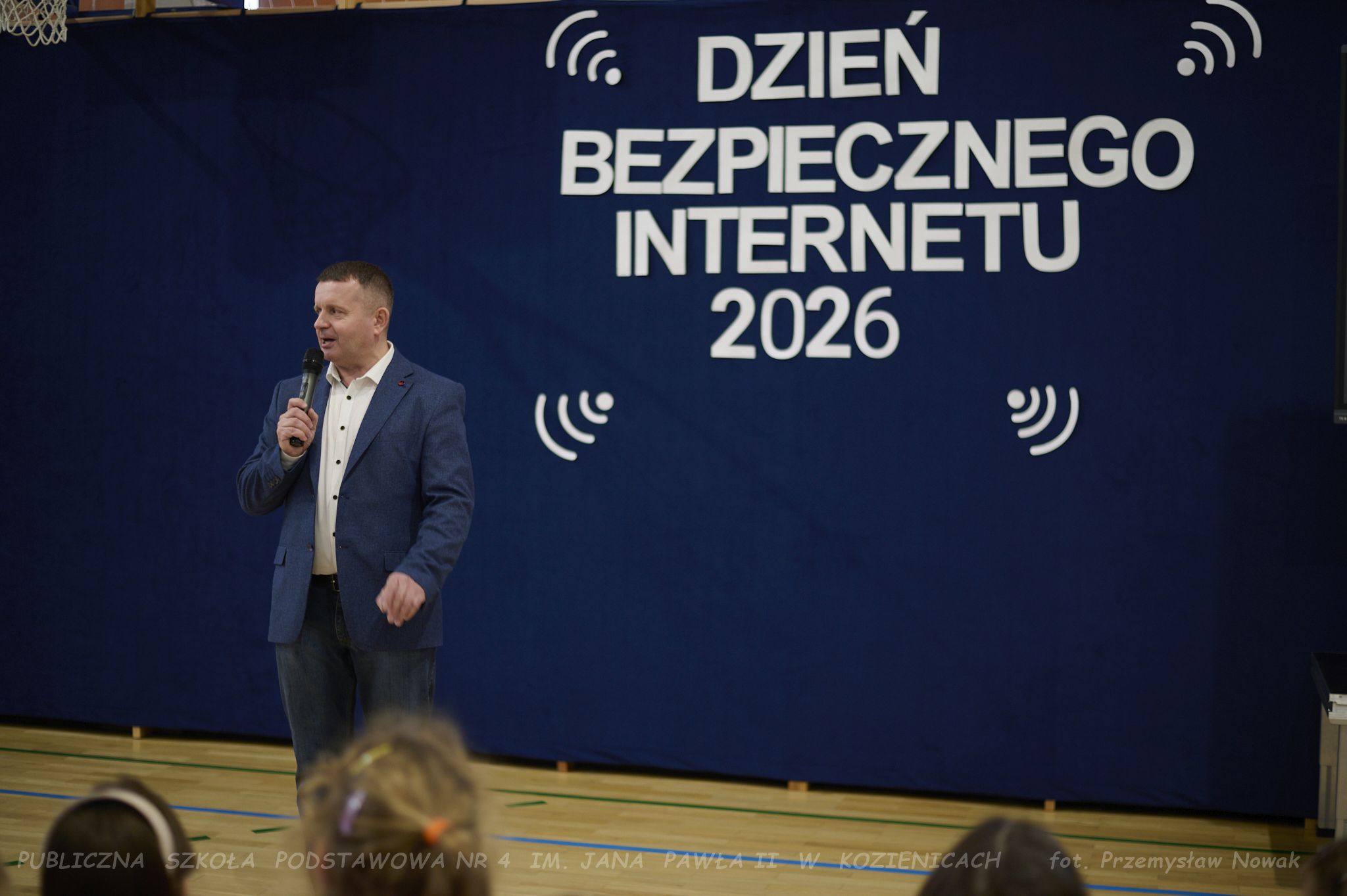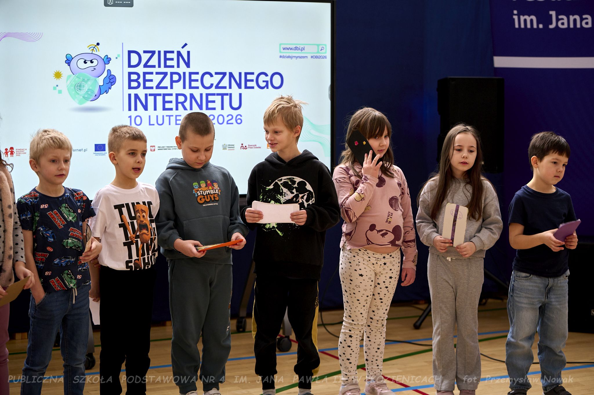 i przedstawił organizatorów wydarzenia: panią Joannę Lenarczyk, panią Małgorzatę Sienkiewicz oraz pana Sebastiana Kotlarka. Dzieci z klasy 1a i 1c zaśpiewały piosenkę “Z internetem Świat jest bliski”, a następnie spotkanie poprowadził nauczyciel informatyki