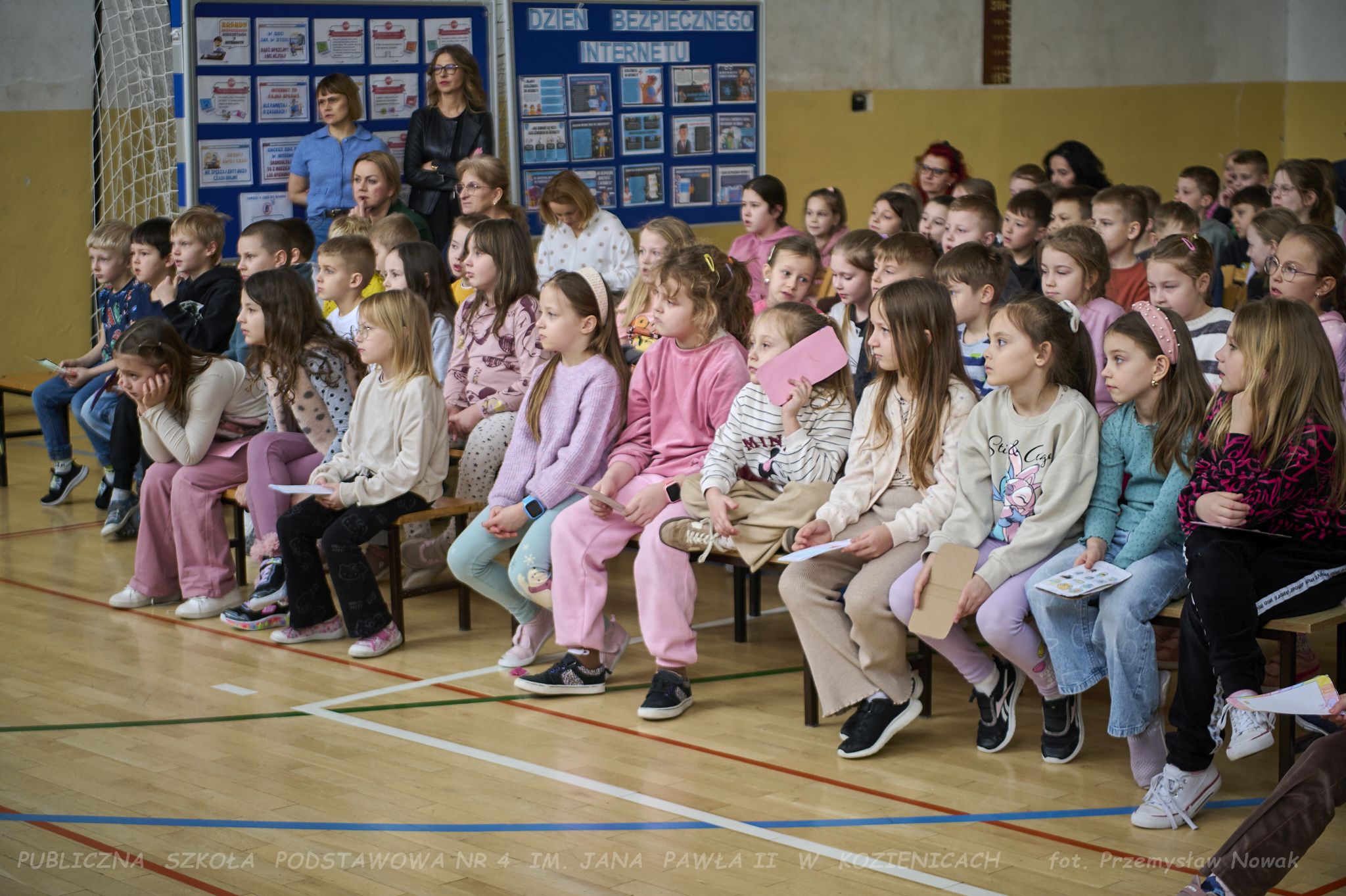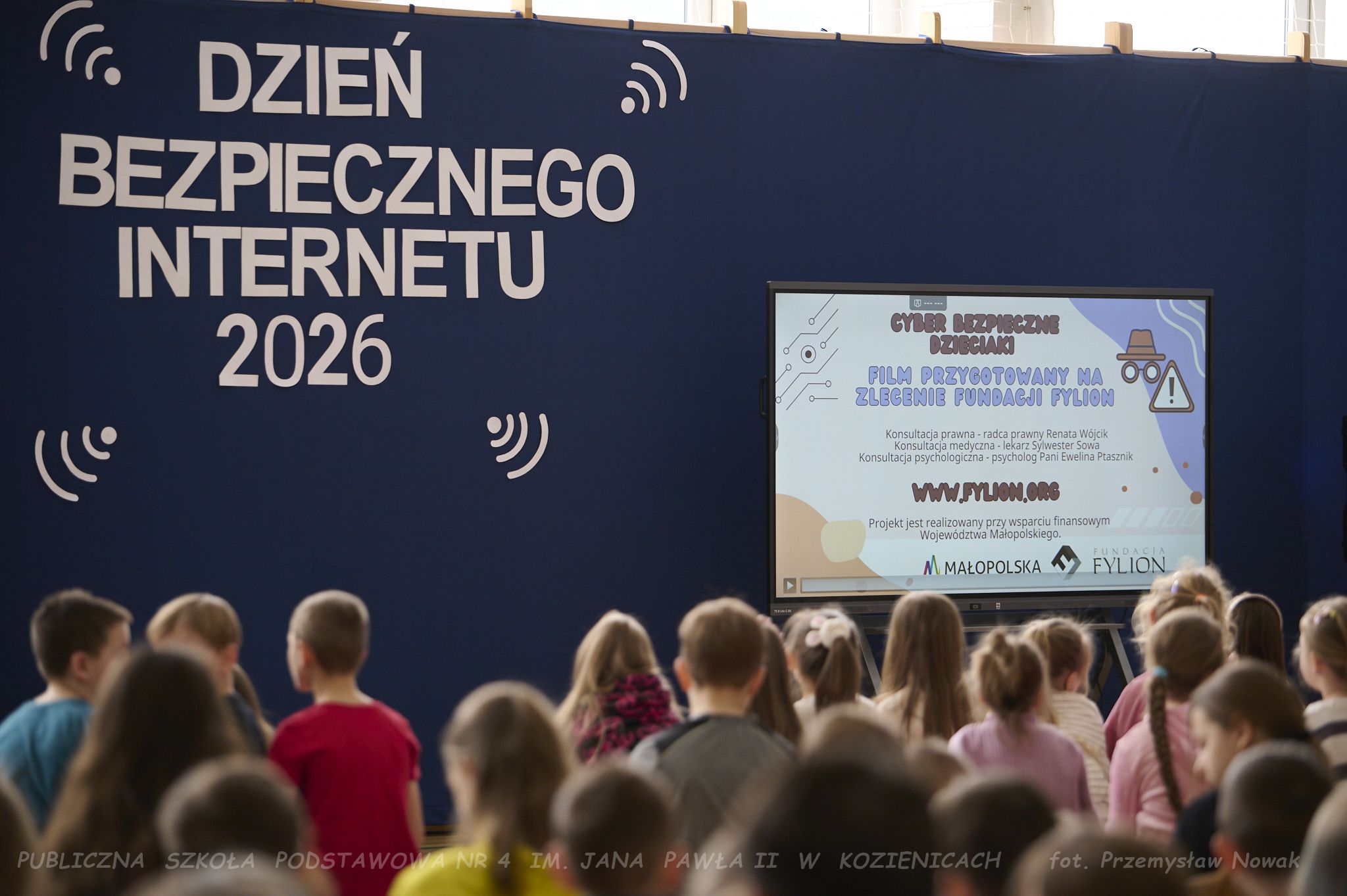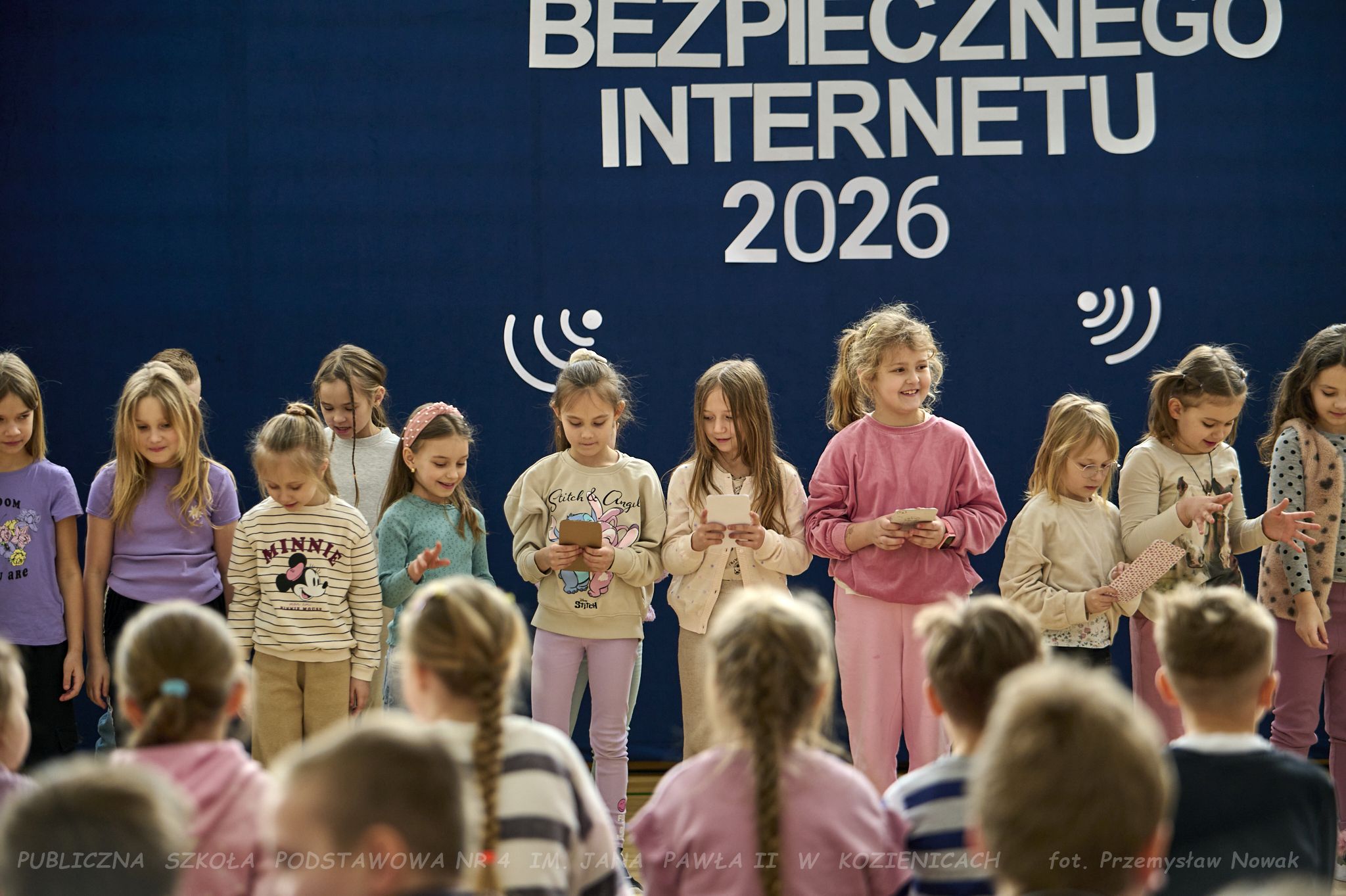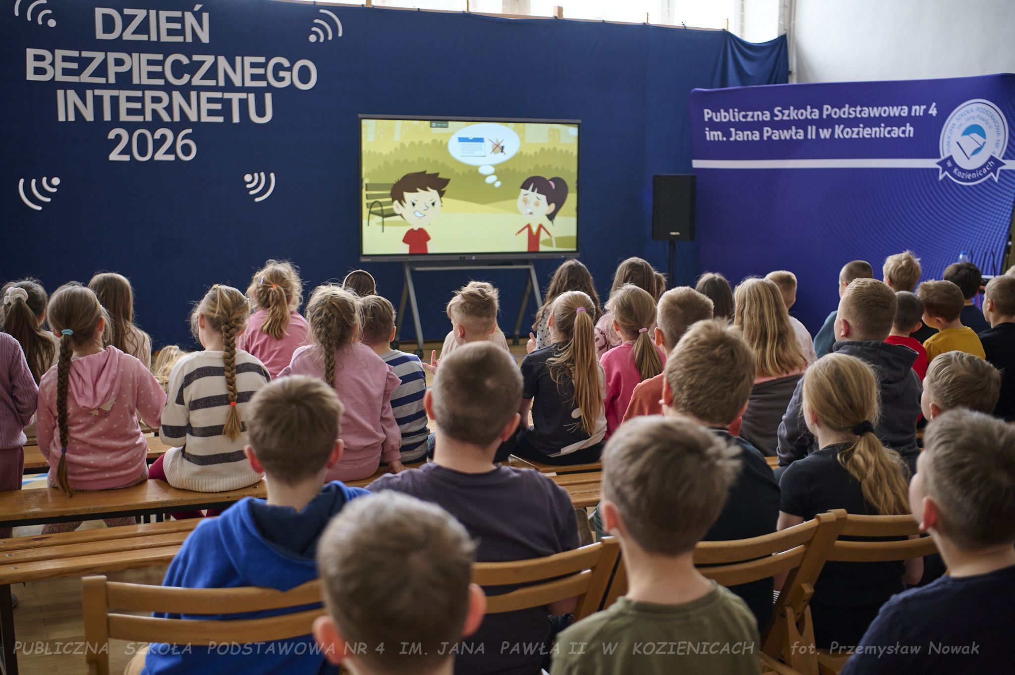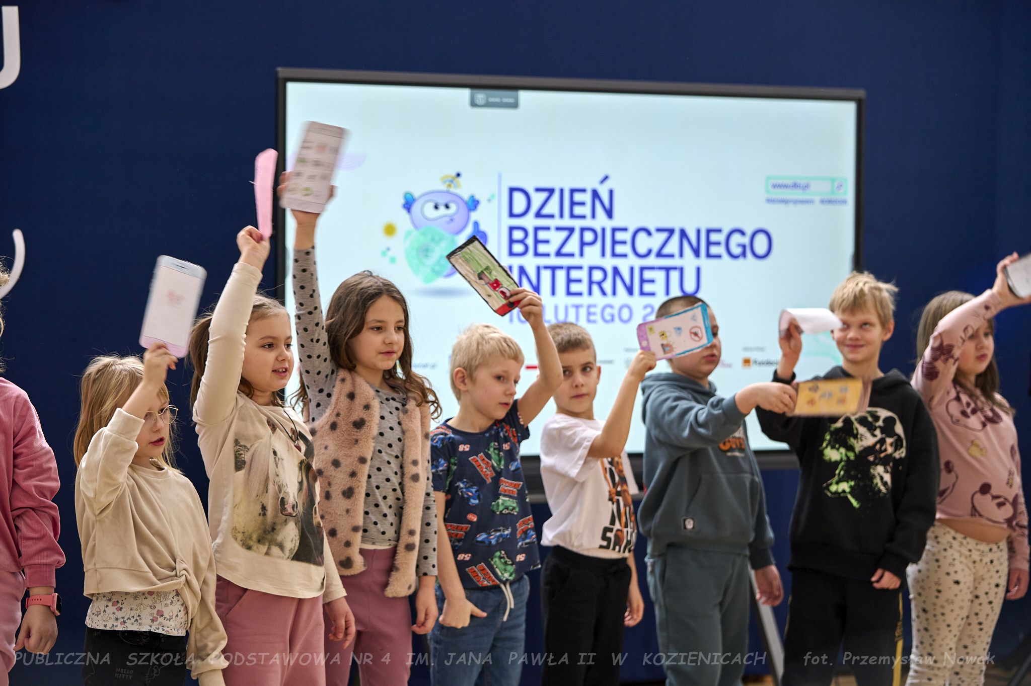 i przedstawił organizatorów wydarzenia: panią Joannę Lenarczyk, panią Małgorzatę Sienkiewicz oraz pana Sebastiana Kotlarka. Dzieci z klasy 1a i 1c zaśpiewały piosenkę “Z internetem Świat jest bliski”, a następnie spotkanie poprowadził nauczyciel informatyki