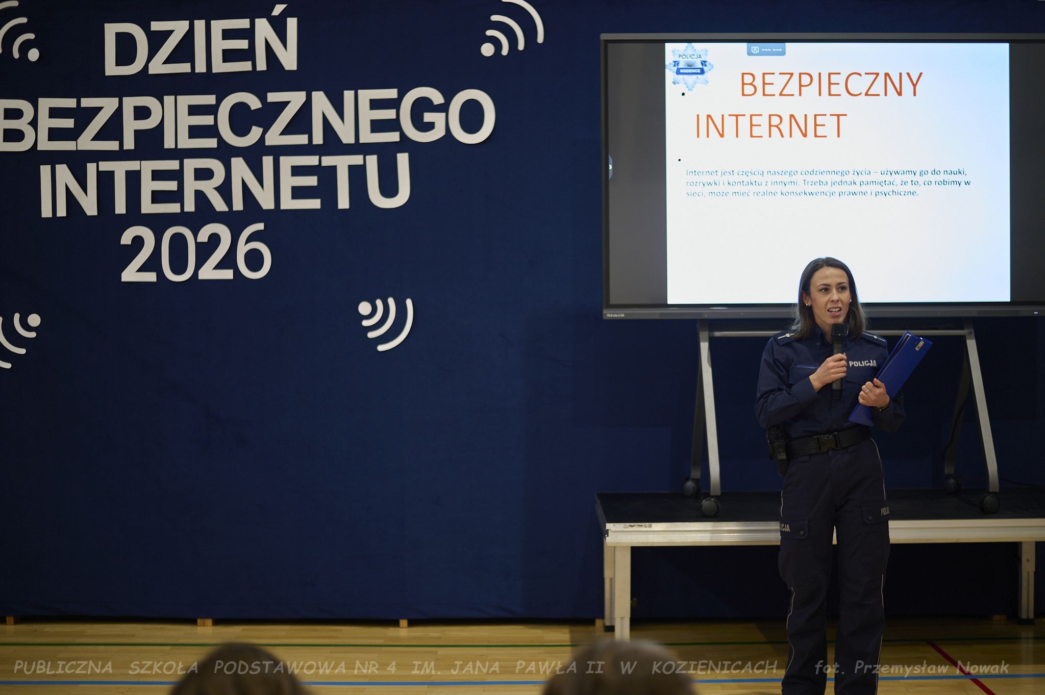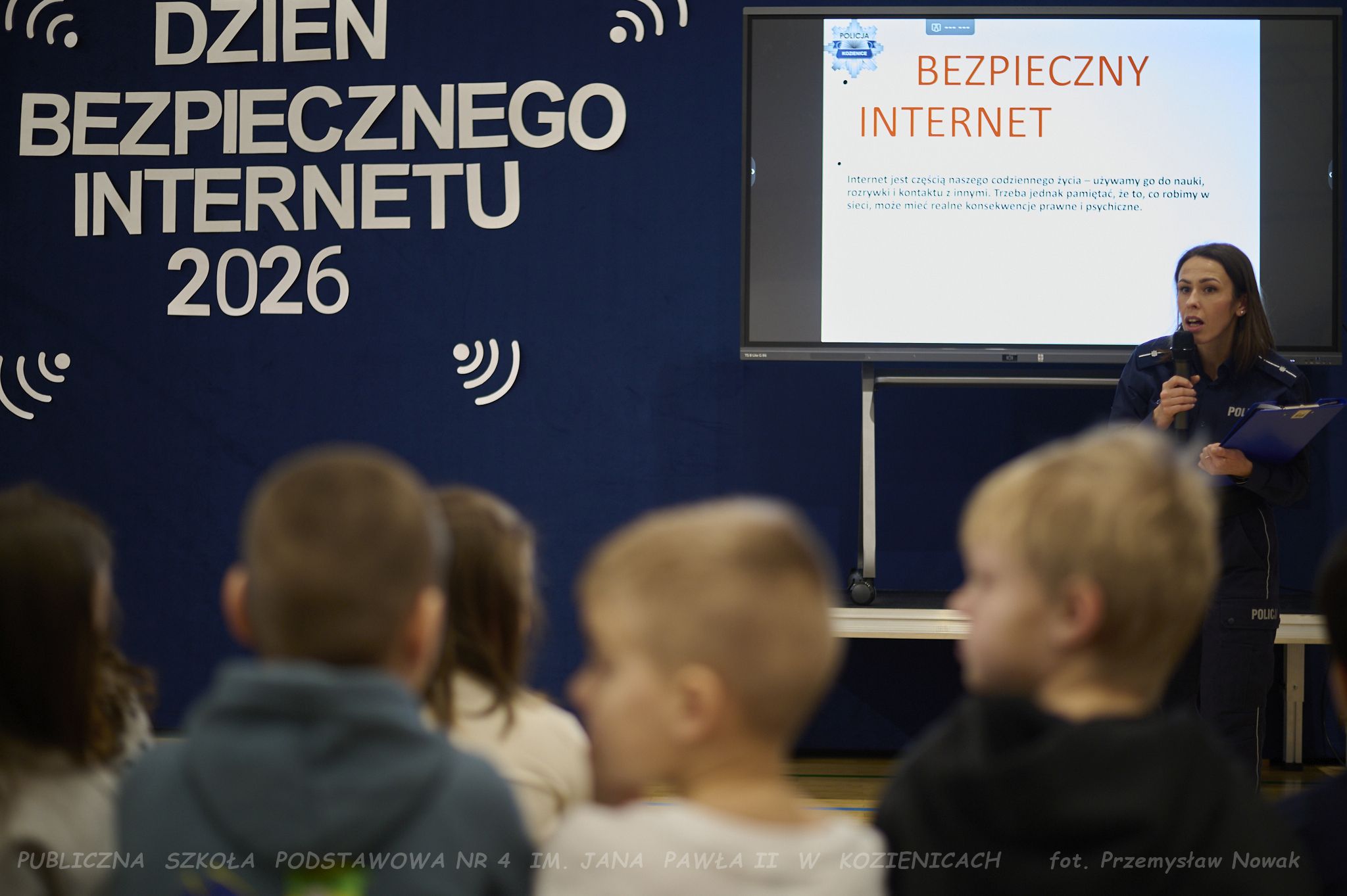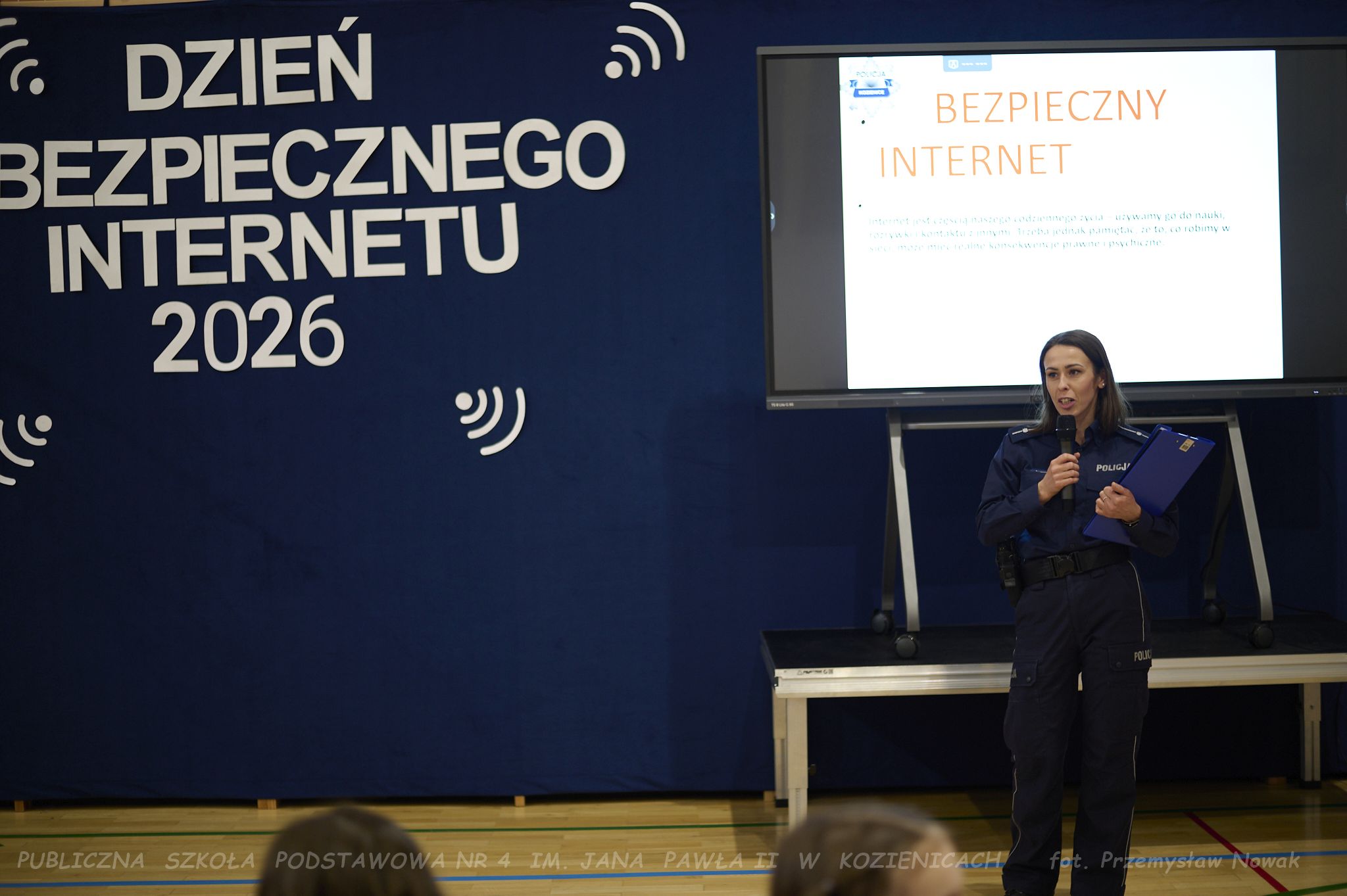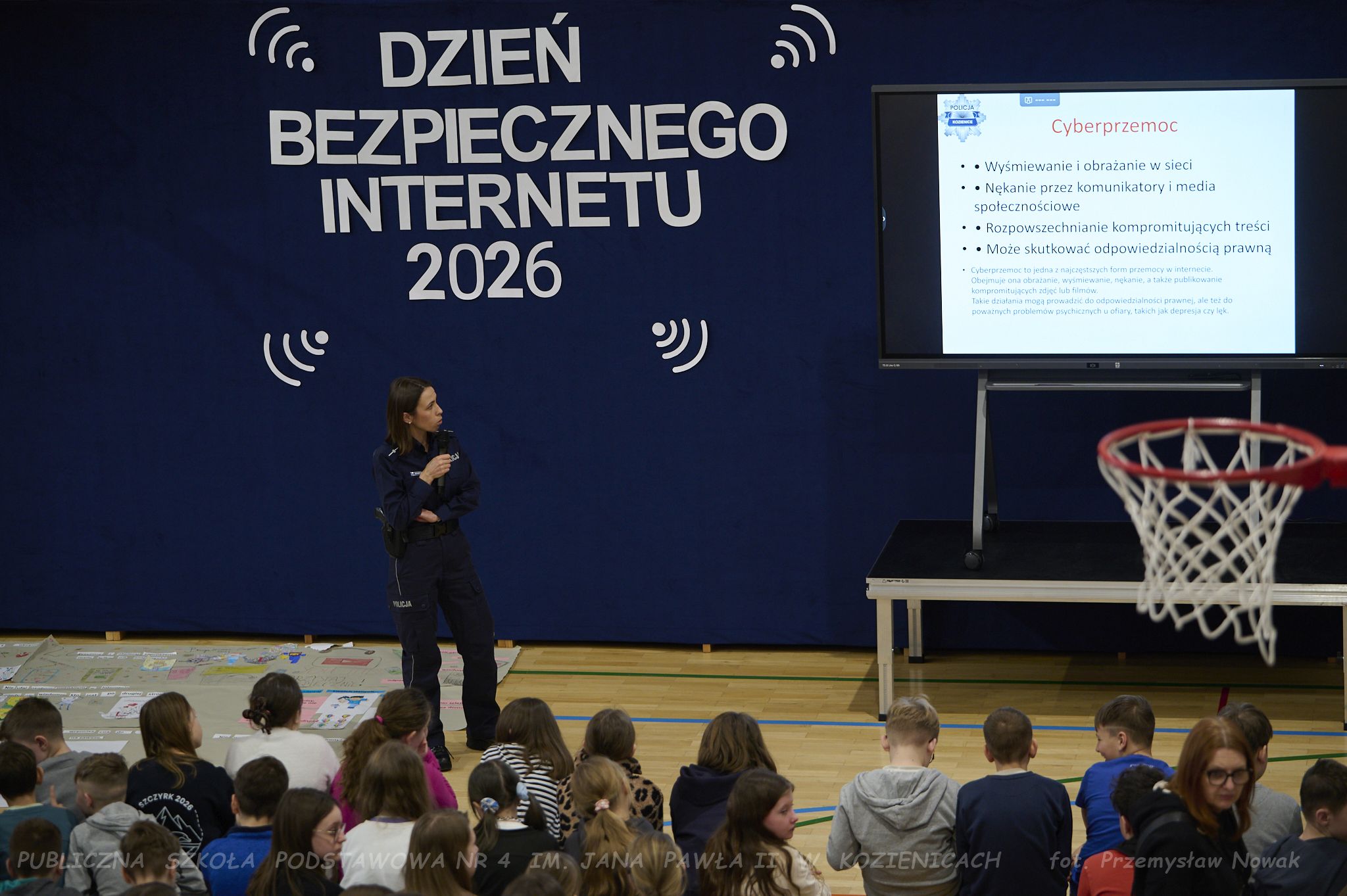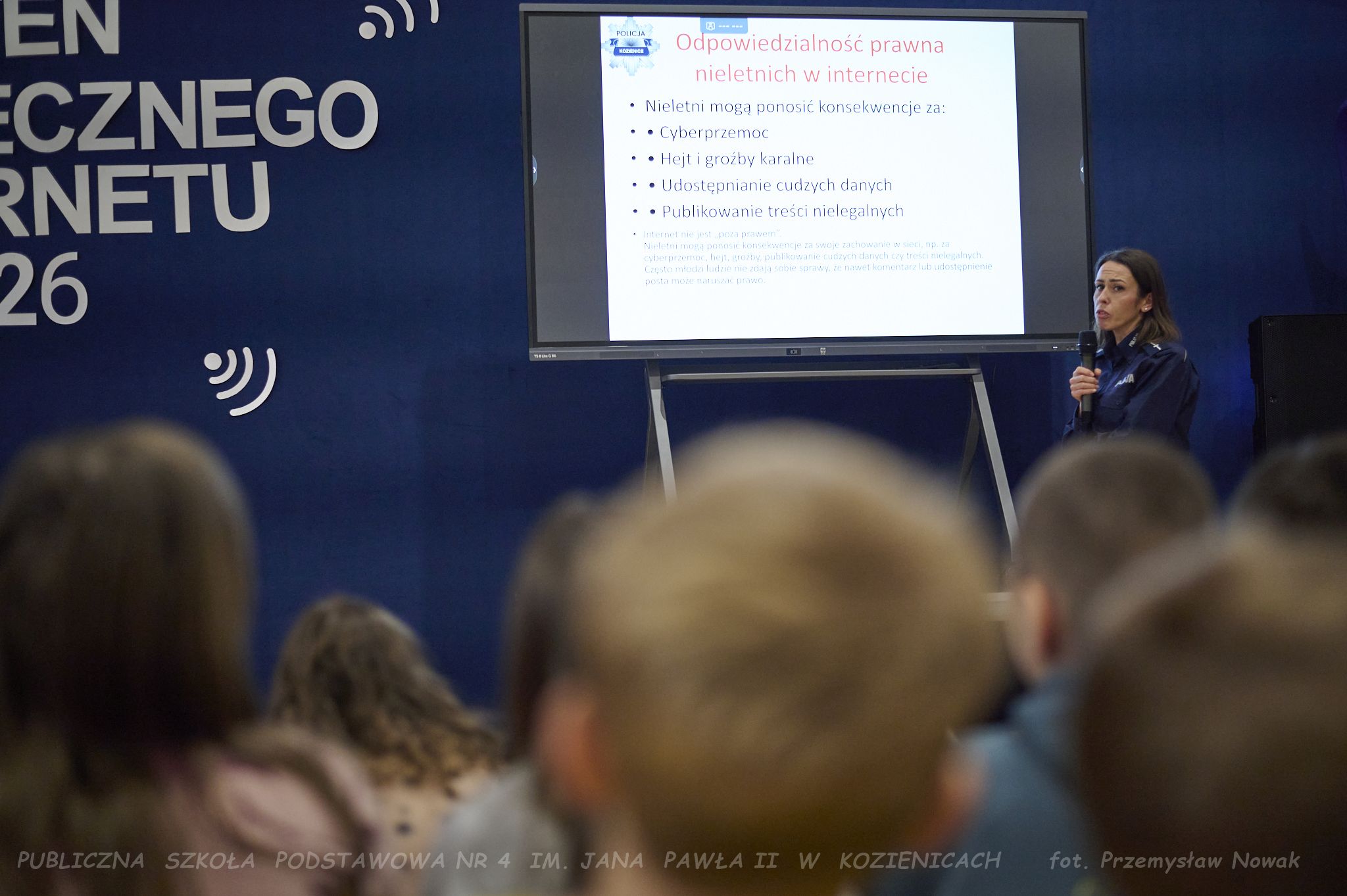 młodsza aspirant Ewa Marczewska, która opowiedziała uczniom – zarówno młodszym, jak i starszym – o konsekwencjach nieprzestrzegania zasad bezpieczeństwa, etyki w sieci, zjawisku cyberprzemocy oraz innych ważnych zagadnieniach.