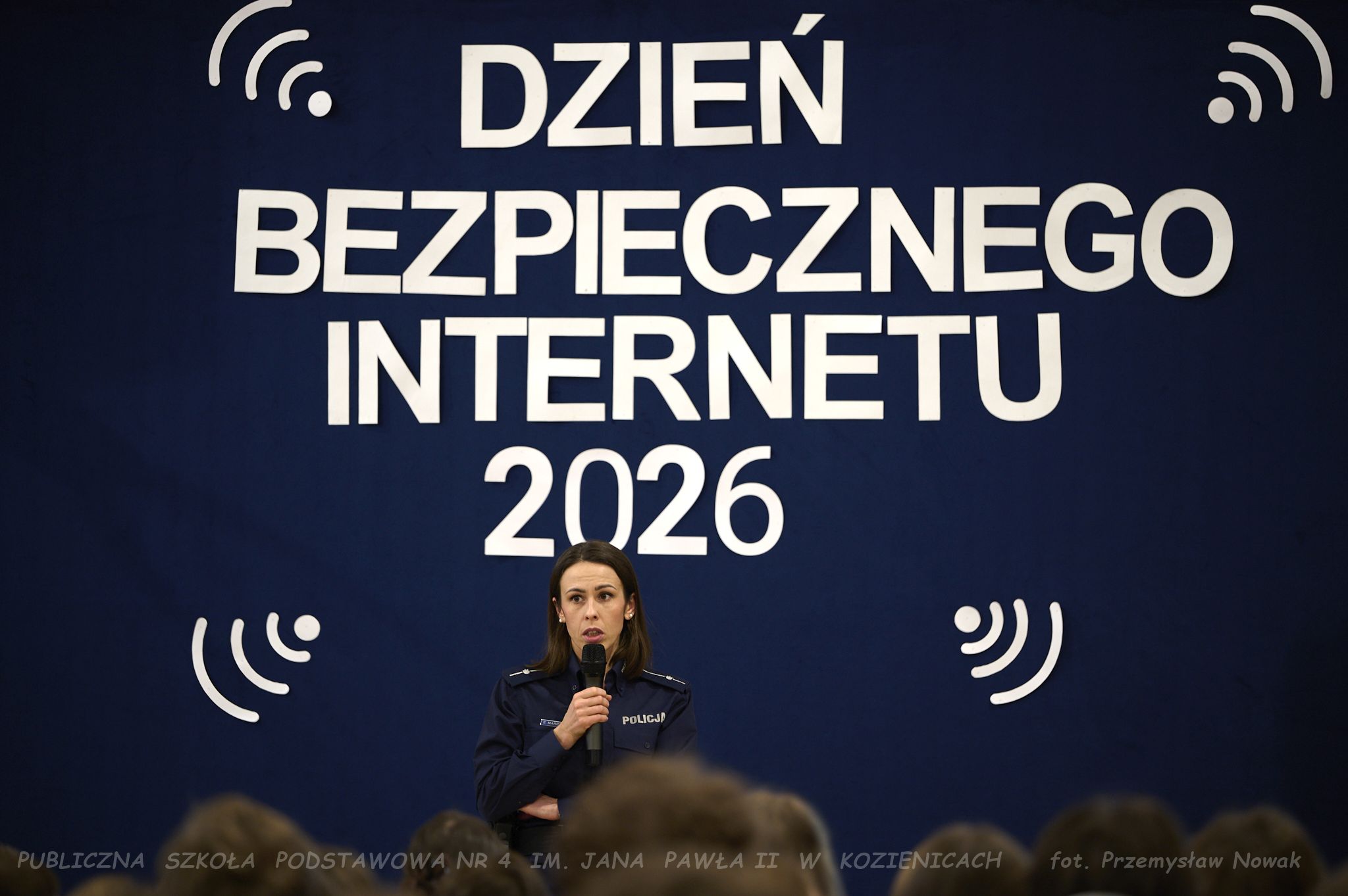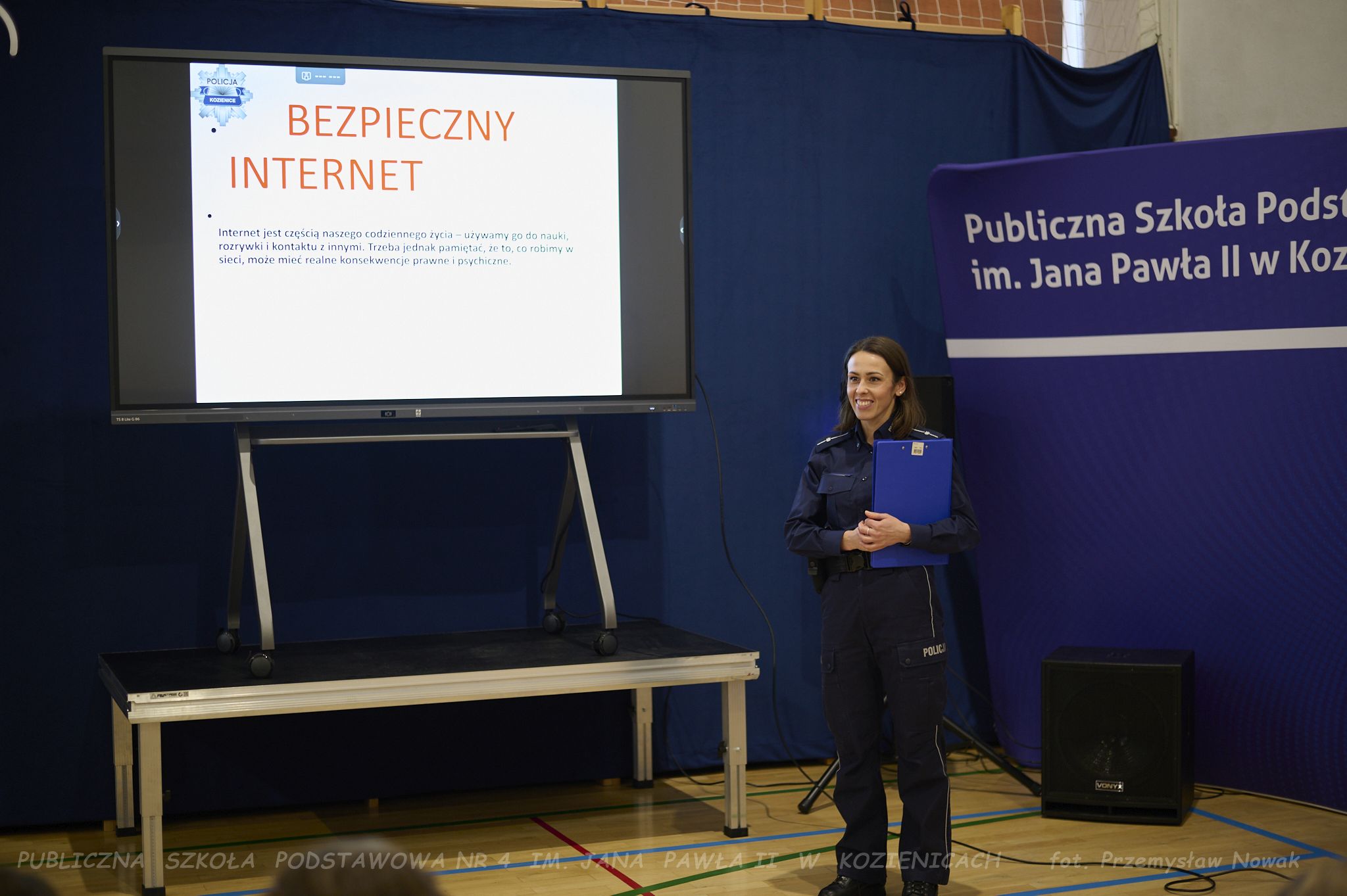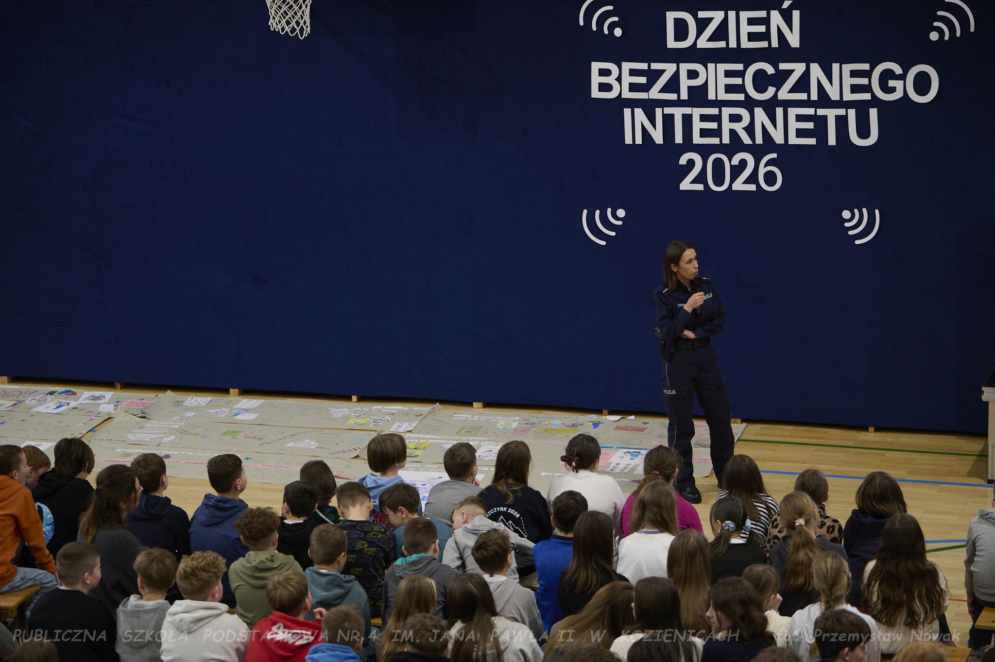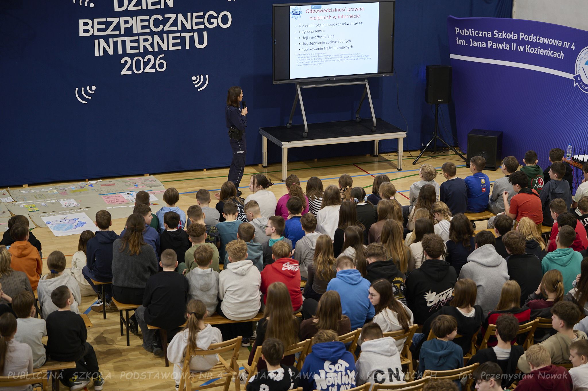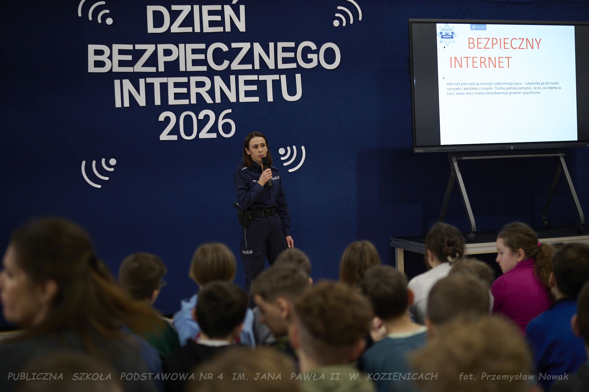 młodsza aspirant Ewa Marczewska, która opowiedziała uczniom – zarówno młodszym, jak i starszym – o konsekwencjach nieprzestrzegania zasad bezpieczeństwa, etyki w sieci, zjawisku cyberprzemocy oraz innych ważnych zagadnieniach.