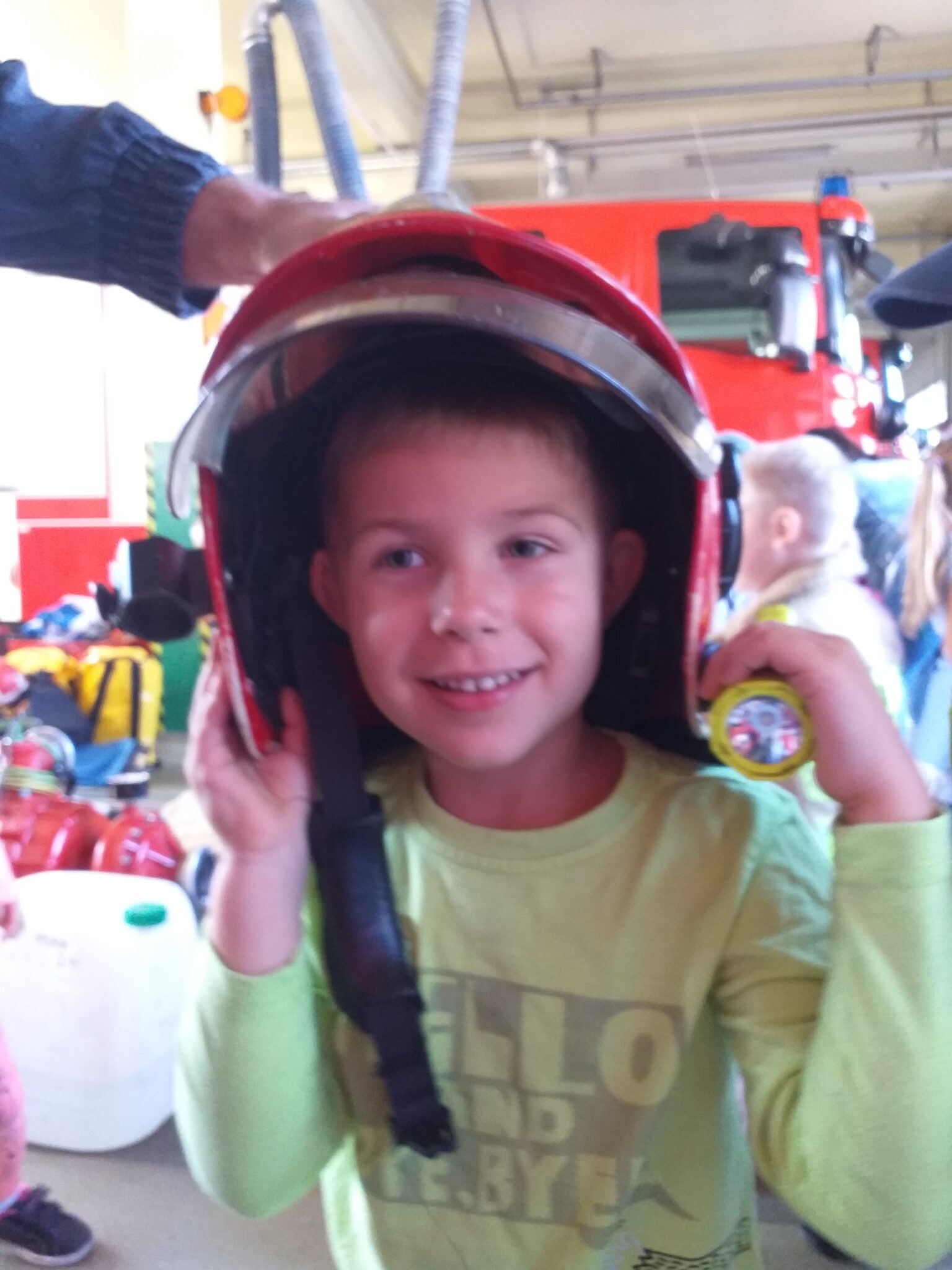 Panowie strażacy bardzo ciekawie opowiadali o swojej pracy oraz o akcjach, w jakich brali udział. Dzieci dowiedziały się, że strażacy nie tylko gaszą pożary ,ale również pomagają w czasie powodzi, usuwają skutki wypadków samochodowych, sprzątają połamane przez wichury drzewa. Przedszkolaki miały okazję zobaczyć wóz strażacki wraz z całym wyposażeniem, zapoznać się ze sprzętem gaśniczym i strojem, w jaki ubierają się do akcji. Przez chwilę wszystkie dzieci mogły poczuć się jak strażacy, przymierzając hełm wraz z całym mundurem strażackim czy wsiadając do wozu strażackiego. Po spotkaniu większość dzieci stwierdziła, że w przyszłości chce zostać strażakami. Czas pokaże czy tak będzie?