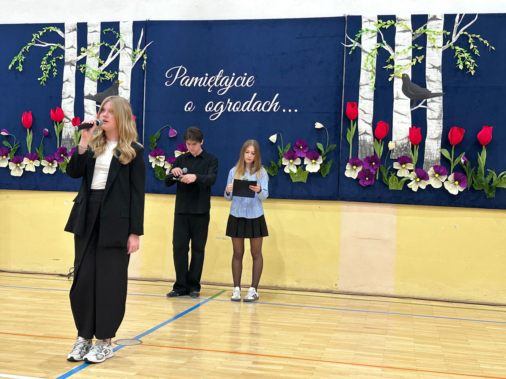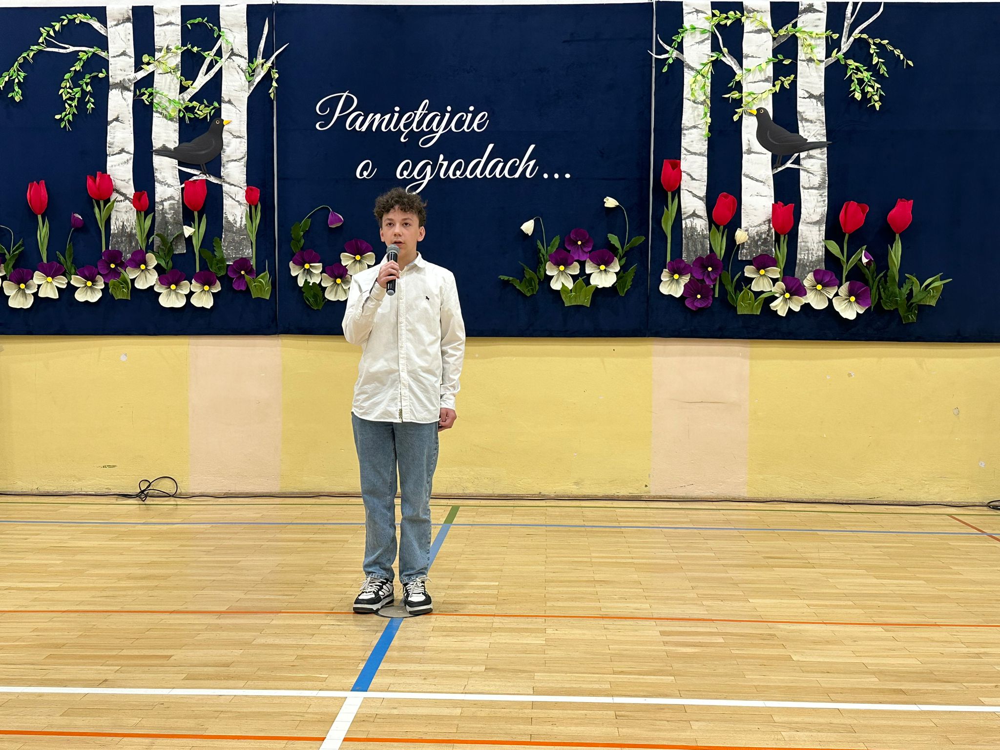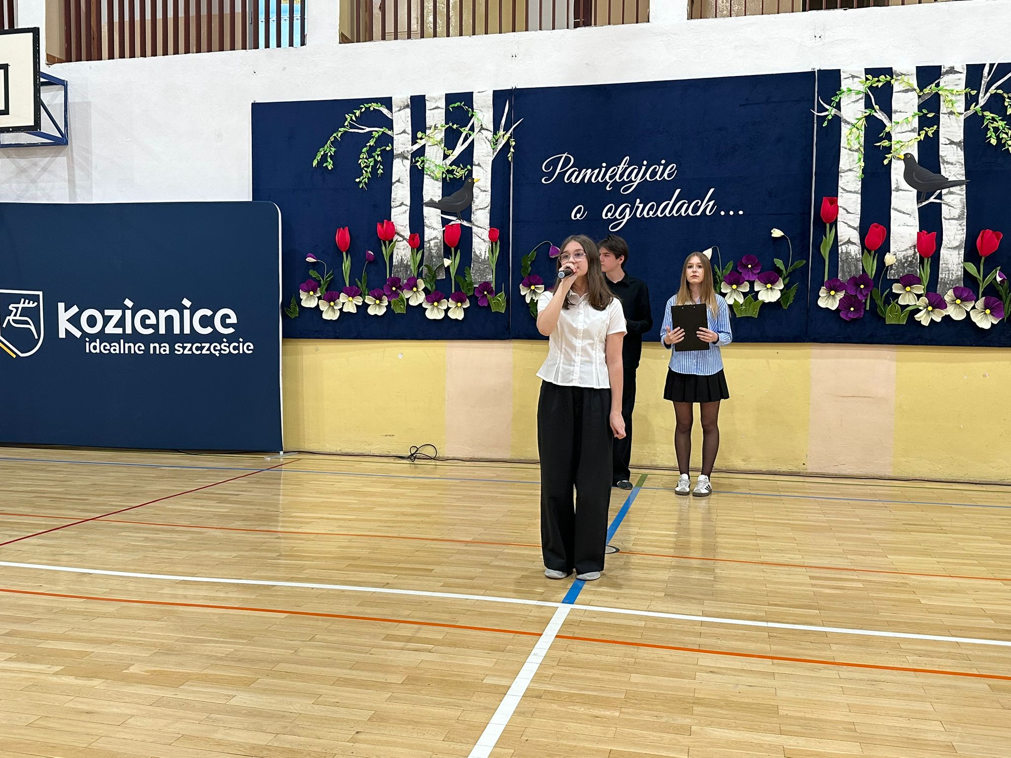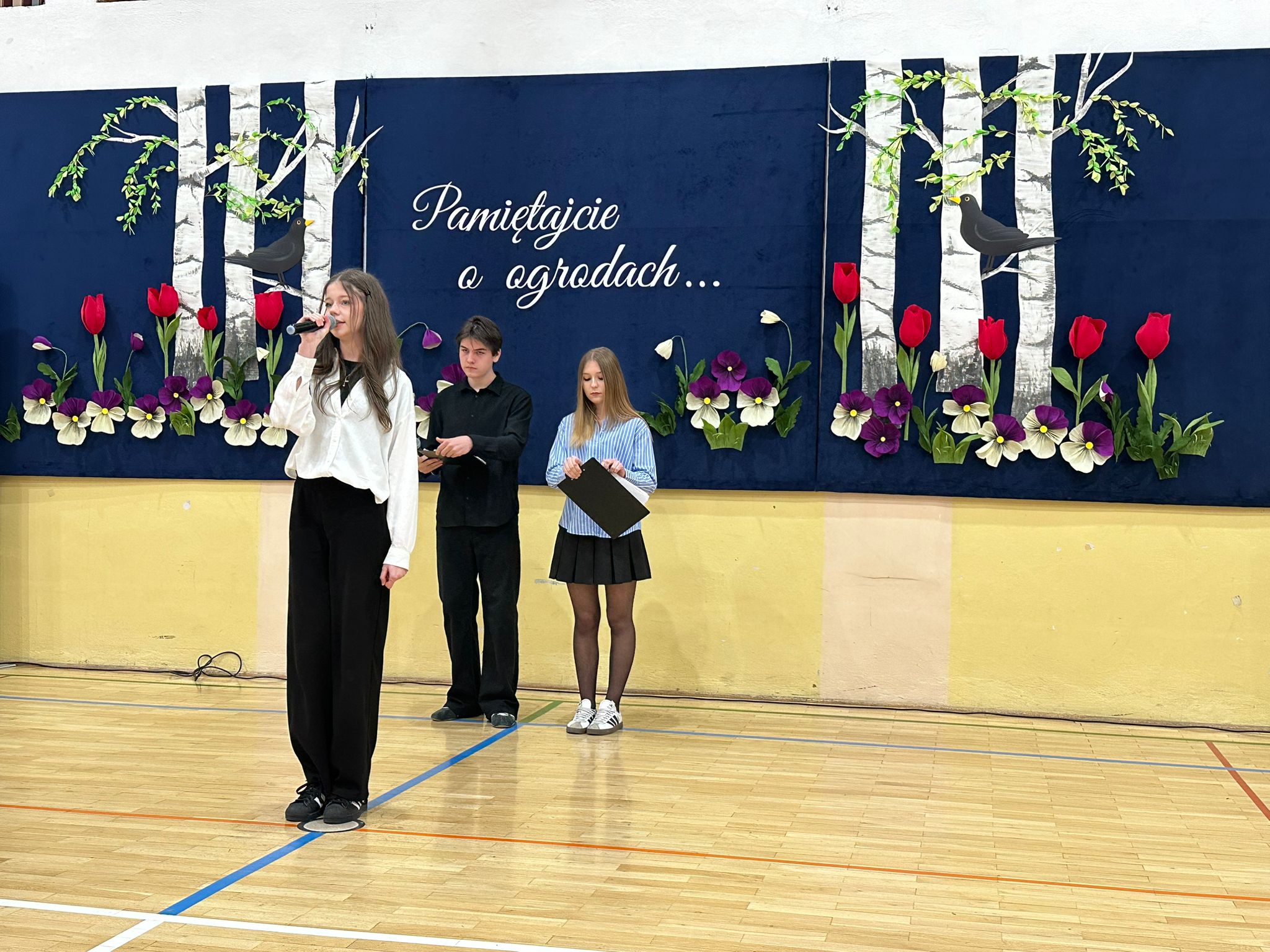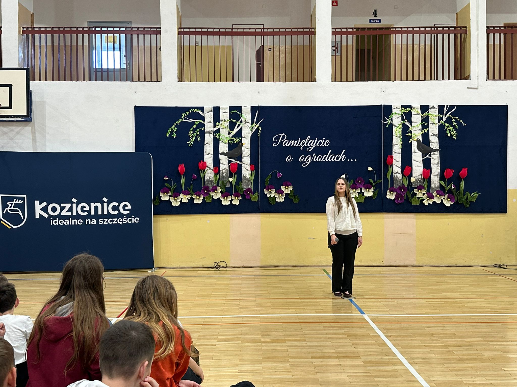 Punktem kulminacyjnym podjętych działań był montaż słowno-muzyczny, który odbył się w czwartek 23 kwietnia. Występ artystyczny „Pamiętajcie o ogrodach…” był wyjątkowym wydarzeniem, które skłoniło widzów zgromadzonych w sali gimnastycznej do refleksji nad pięknem natury, harmonią świata oraz miejscem człowieka w przyrodzie. Odbiorcami spektaklu byli Dyrektor Pan Andrzej Suwała, Wicedyrektor Pani Magdalena Prygiel, Dyrektor Wydziału Edukacji Urzędu Miejskiego w Kozienicach Pani Małgorzata Wolszczak, Doradca metodyczny MSCDN Wydział w Radomiu Pani Anna Janowska, Przewodniczący Rady Rodziców Pan Łukasz Słyk, nauczyciele oraz uczniowie klas IV – VIII naszej szkoły. Program łączył w sobie różnorodne formy wyrazu – poezję, muzykę, elementy teatralne oraz taniec – tworząc spójną i poruszającą całość. Motyw ogrodu, obecny w całym przedstawieniu, symbolizował nie tylko naturę, ale także życie człowieka oraz wartości takie jak: dobro, spokój, pamięć i wrażliwość. Występujący z dużym zaangażowaniem młodzi aktorzy zaprezentowali swoje umiejętności, oddając nastrój radości, refleksji i nostalgii, a jednocześnie przypominając o codziennej potrzebie troski o otaczający nas świat.