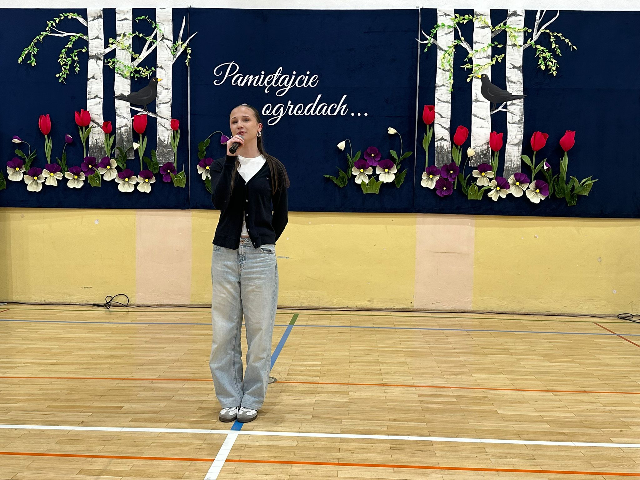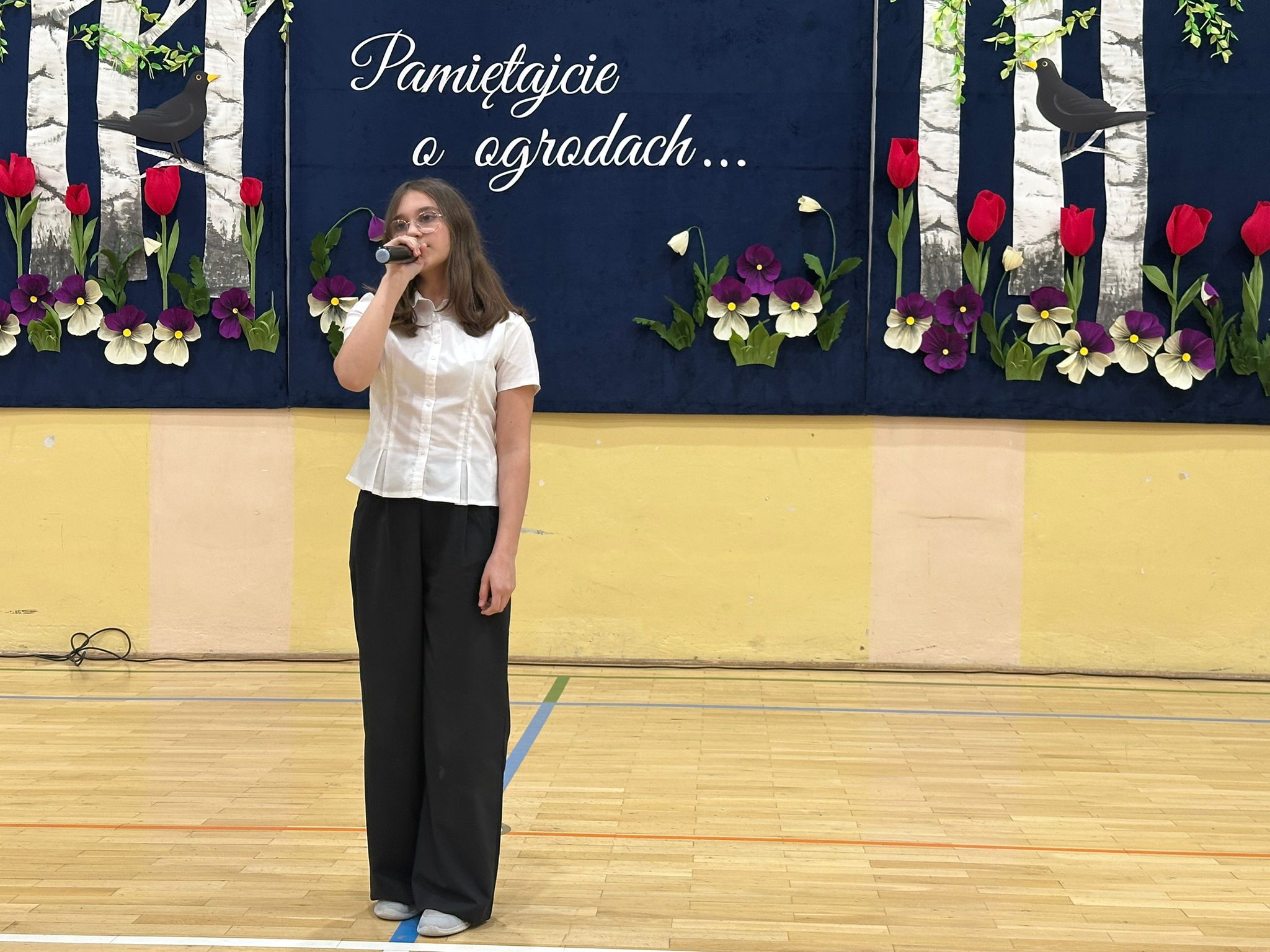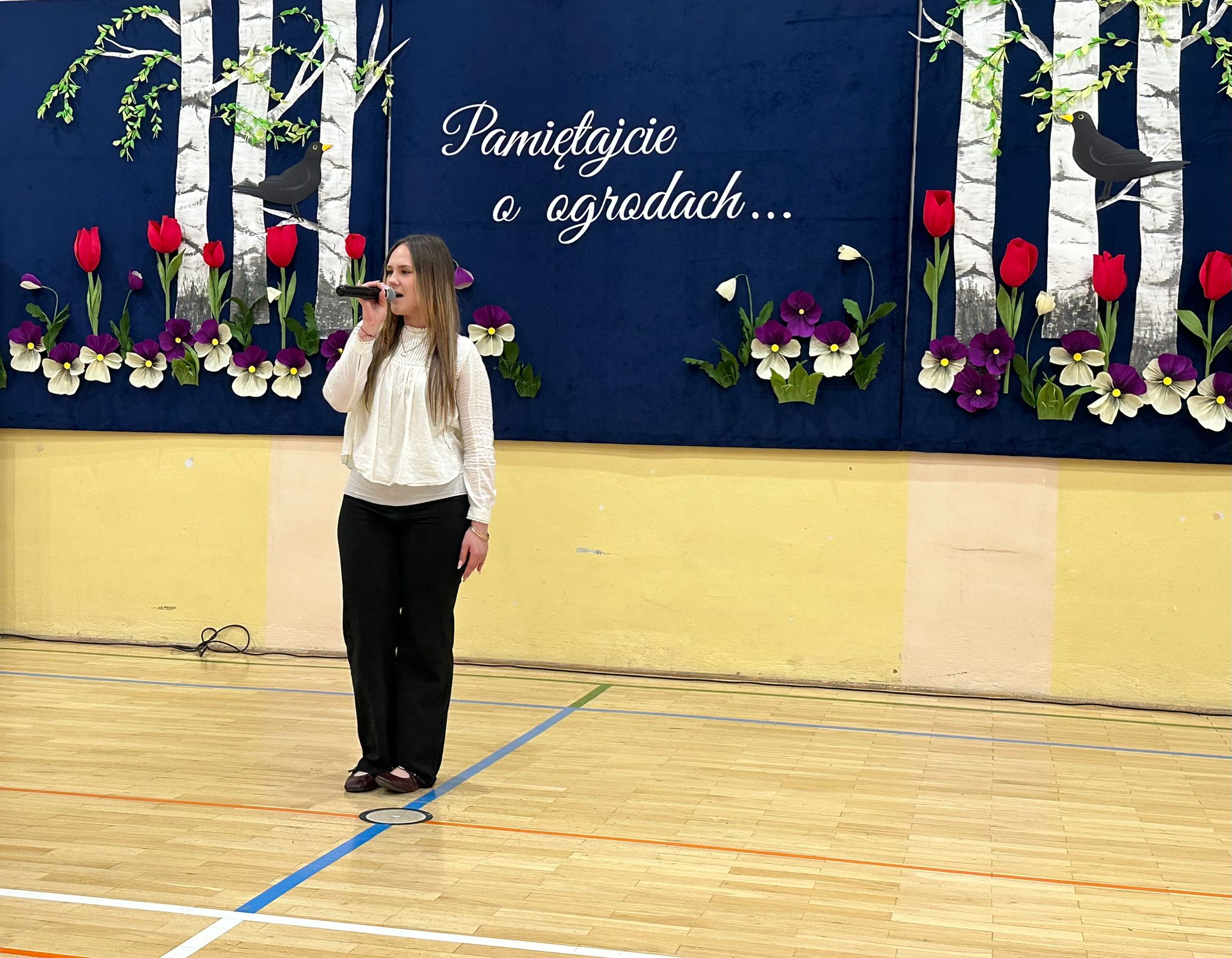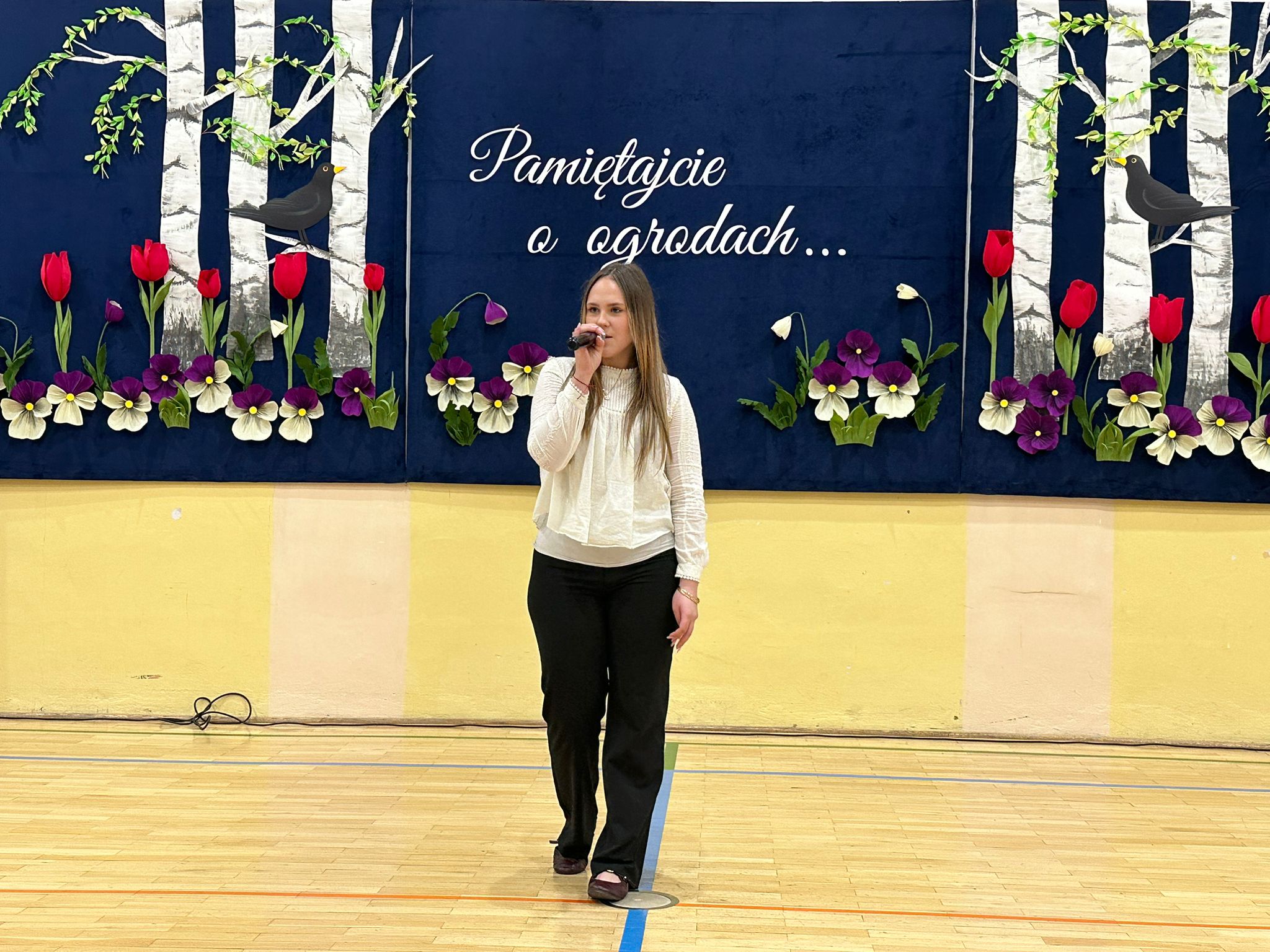 Punktem kulminacyjnym podjętych działań był montaż słowno-muzyczny, który odbył się w czwartek 23 kwietnia. Występ artystyczny „Pamiętajcie o ogrodach…” był wyjątkowym wydarzeniem, które skłoniło widzów zgromadzonych w sali gimnastycznej do refleksji nad pięknem natury, harmonią świata oraz miejscem człowieka w przyrodzie. Odbiorcami spektaklu byli Dyrektor Pan Andrzej Suwała, Wicedyrektor Pani Magdalena Prygiel, Dyrektor Wydziału Edukacji Urzędu Miejskiego w Kozienicach Pani Małgorzata Wolszczak, Doradca metodyczny MSCDN Wydział w Radomiu Pani Anna Janowska, Przewodniczący Rady Rodziców Pan Łukasz Słyk, nauczyciele oraz uczniowie klas IV – VIII naszej szkoły. Program łączył w sobie różnorodne formy wyrazu – poezję, muzykę, elementy teatralne oraz taniec – tworząc spójną i poruszającą całość. Motyw ogrodu, obecny w całym przedstawieniu, symbolizował nie tylko naturę, ale także życie człowieka oraz wartości takie jak: dobro, spokój, pamięć i wrażliwość. Występujący z dużym zaangażowaniem młodzi aktorzy zaprezentowali swoje umiejętności, oddając nastrój radości, refleksji i nostalgii, a jednocześnie przypominając o codziennej potrzebie troski o otaczający nas świat.