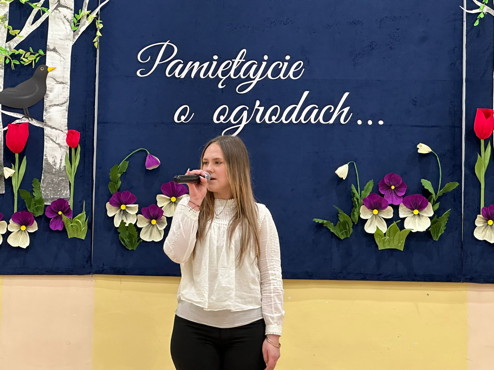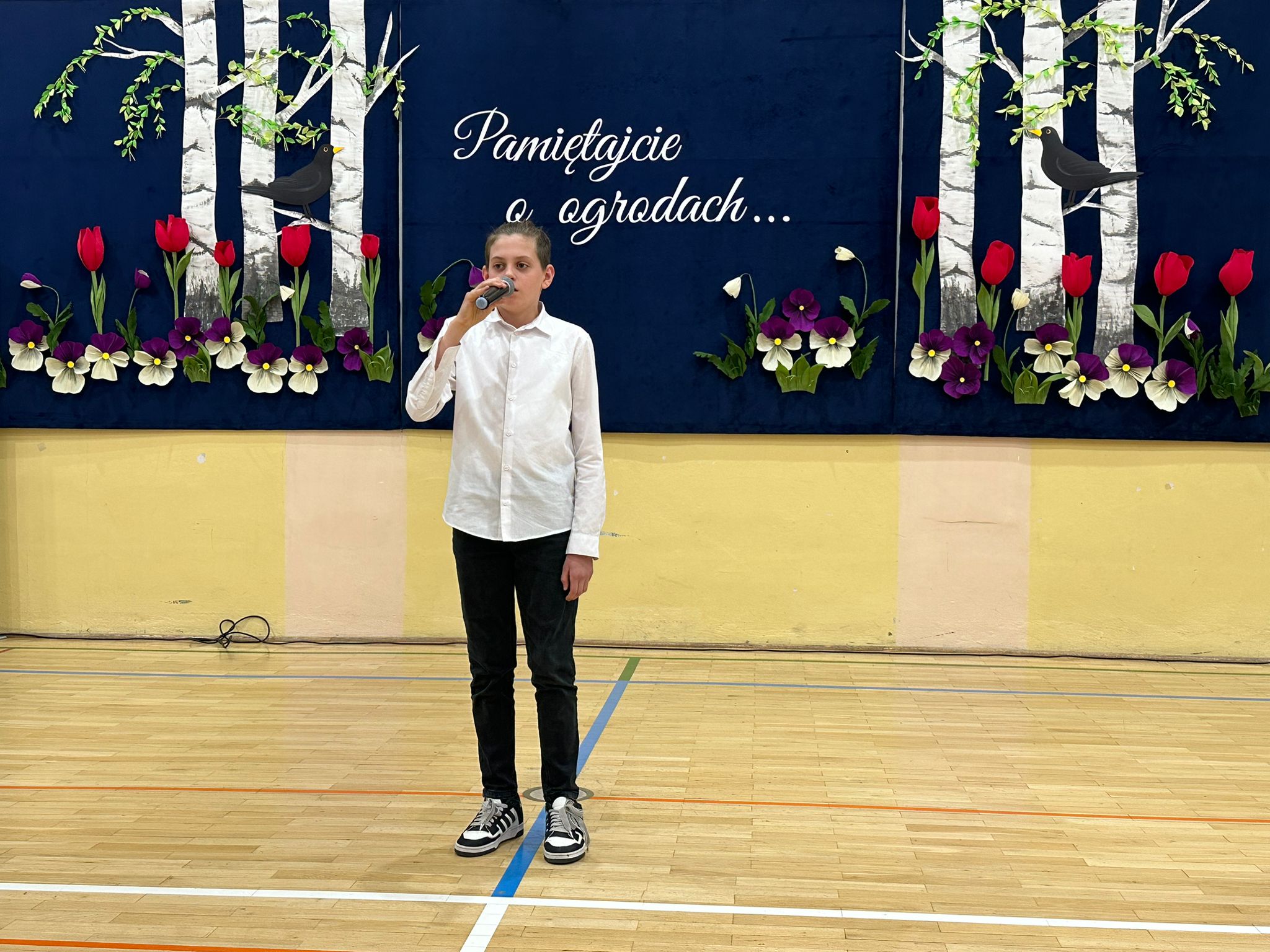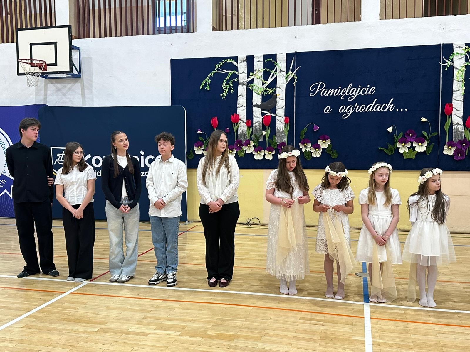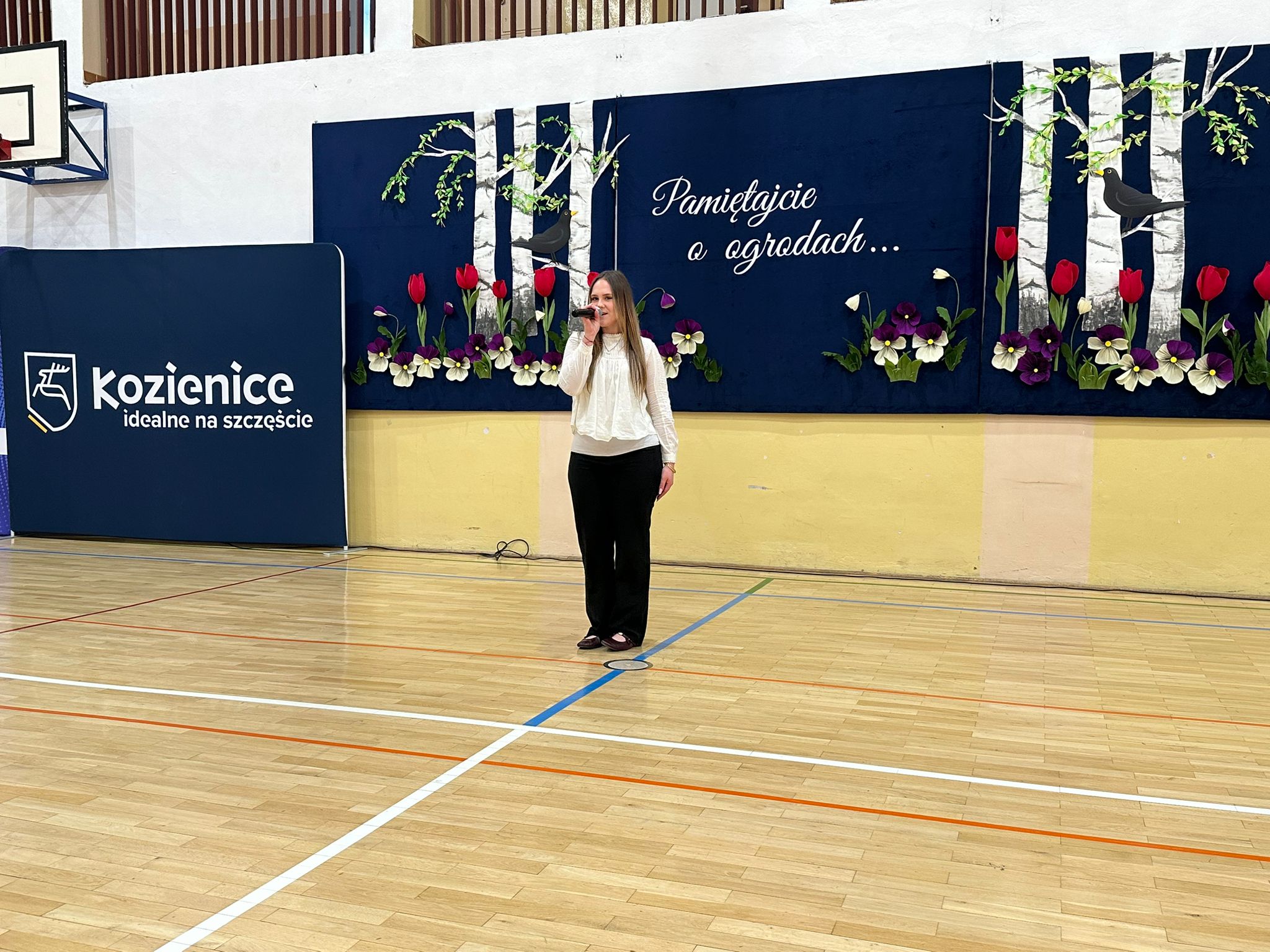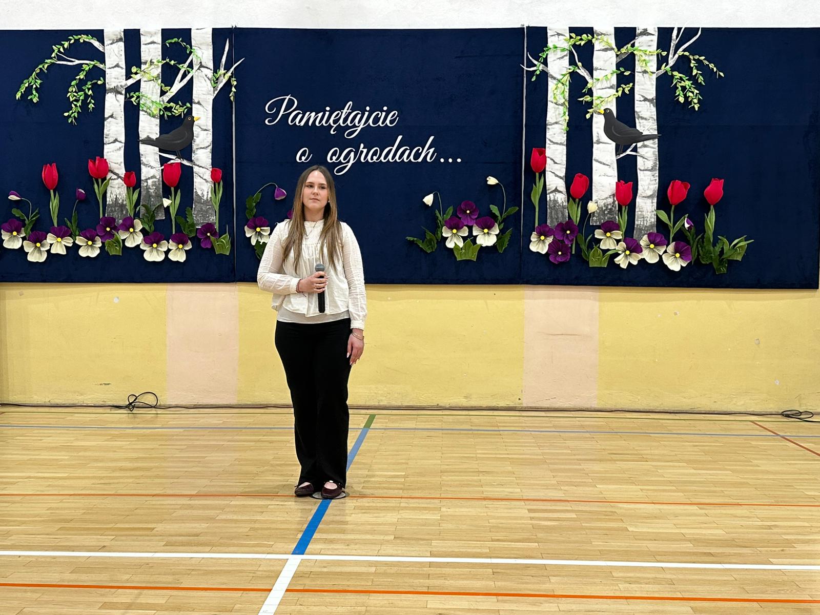 Punktem kulminacyjnym podjętych działań był montaż słowno-muzyczny, który odbył się w czwartek 23 kwietnia. Występ artystyczny „Pamiętajcie o ogrodach…” był wyjątkowym wydarzeniem, które skłoniło widzów zgromadzonych w sali gimnastycznej do refleksji nad pięknem natury, harmonią świata oraz miejscem człowieka w przyrodzie. Odbiorcami spektaklu byli Dyrektor Pan Andrzej Suwała, Wicedyrektor Pani Magdalena Prygiel, Dyrektor Wydziału Edukacji Urzędu Miejskiego w Kozienicach Pani Małgorzata Wolszczak, Doradca metodyczny MSCDN Wydział w Radomiu Pani Anna Janowska, Przewodniczący Rady Rodziców Pan Łukasz Słyk, nauczyciele oraz uczniowie klas IV – VIII naszej szkoły. Program łączył w sobie różnorodne formy wyrazu – poezję, muzykę, elementy teatralne oraz taniec – tworząc spójną i poruszającą całość. Motyw ogrodu, obecny w całym przedstawieniu, symbolizował nie tylko naturę, ale także życie człowieka oraz wartości takie jak: dobro, spokój, pamięć i wrażliwość. Występujący z dużym zaangażowaniem młodzi aktorzy zaprezentowali swoje umiejętności, oddając nastrój radości, refleksji i nostalgii, a jednocześnie przypominając o codziennej potrzebie troski o otaczający nas świat.