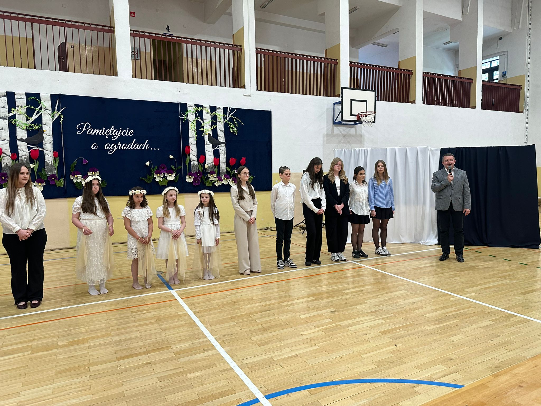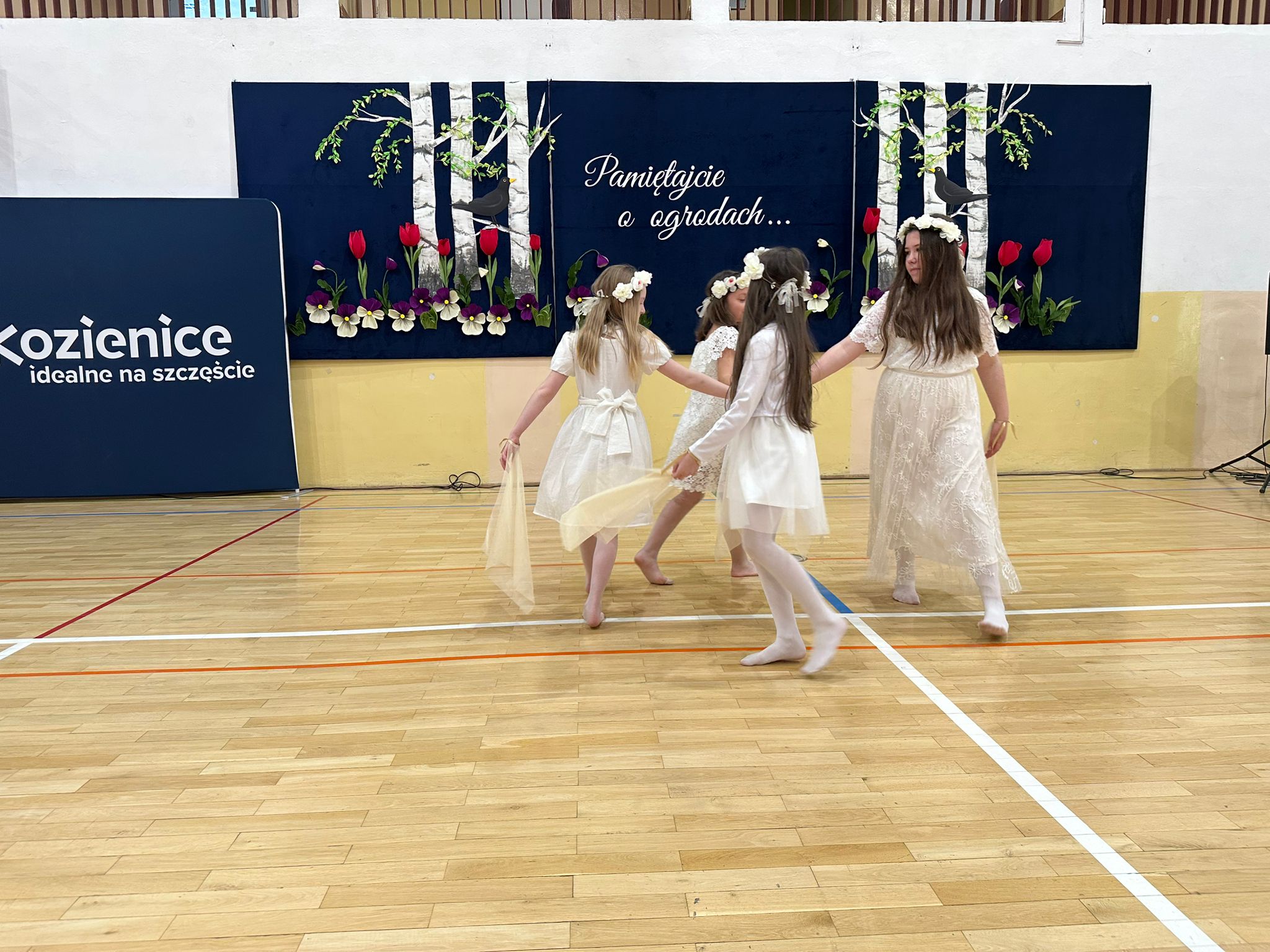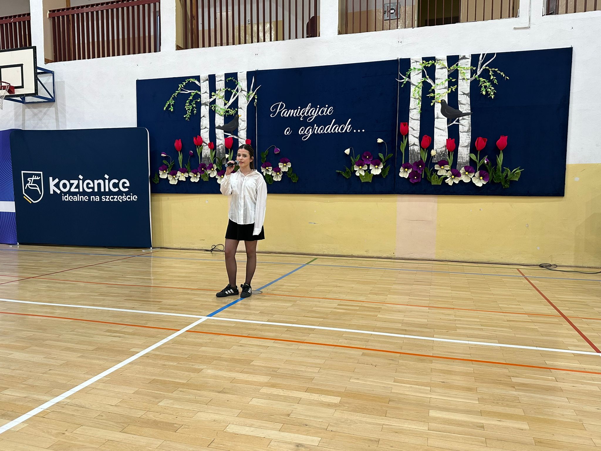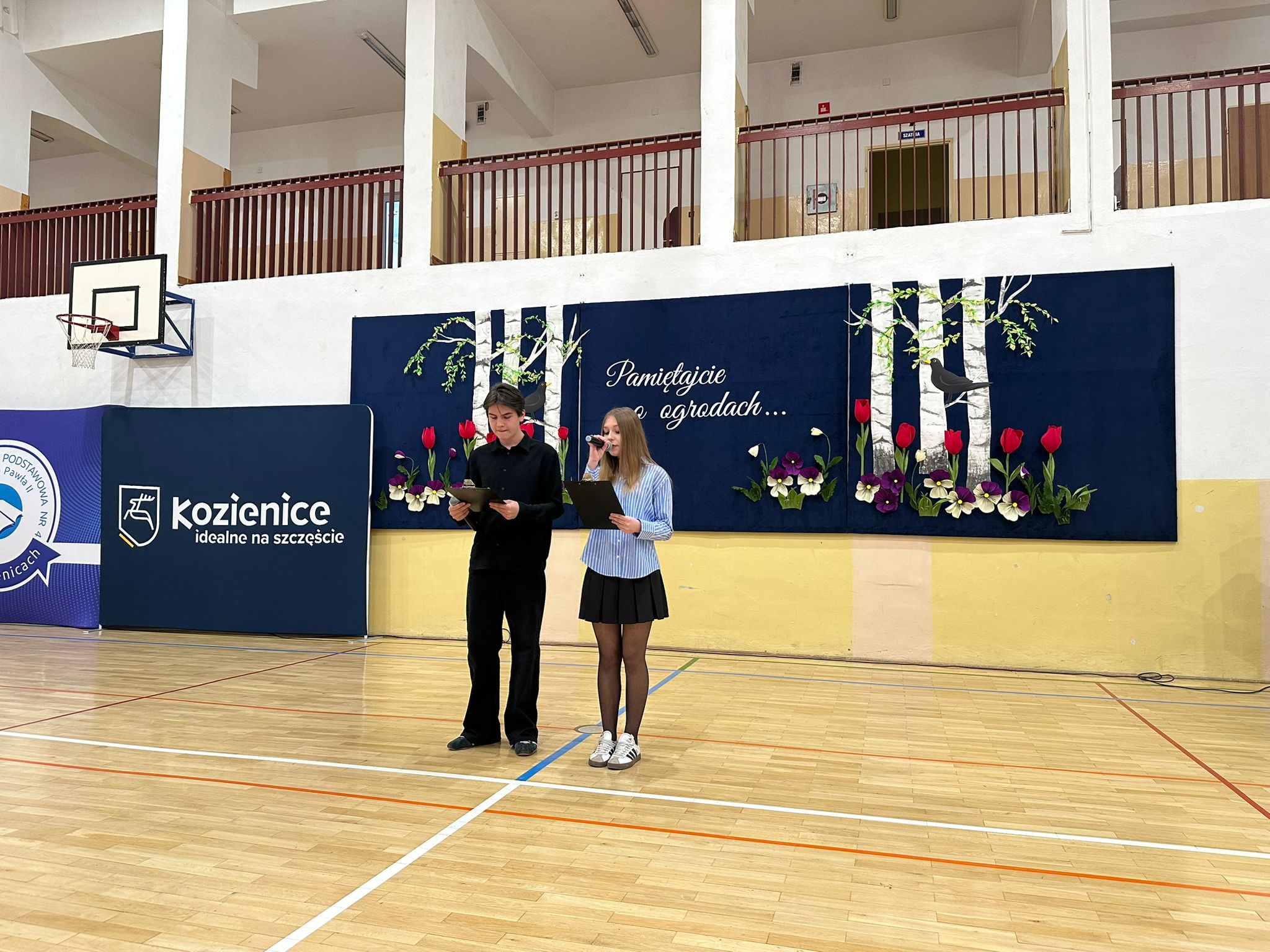 Punktem kulminacyjnym podjętych działań był montaż słowno-muzyczny, który odbył się w czwartek 23 kwietnia. Występ artystyczny „Pamiętajcie o ogrodach…” był wyjątkowym wydarzeniem, które skłoniło widzów zgromadzonych w sali gimnastycznej do refleksji nad pięknem natury, harmonią świata oraz miejscem człowieka w przyrodzie. Odbiorcami spektaklu byli Dyrektor Pan Andrzej Suwała, Wicedyrektor Pani Magdalena Prygiel, Dyrektor Wydziału Edukacji Urzędu Miejskiego w Kozienicach Pani Małgorzata Wolszczak, Doradca metodyczny MSCDN Wydział w Radomiu Pani Anna Janowska, Przewodniczący Rady Rodziców Pan Łukasz Słyk, nauczyciele oraz uczniowie klas IV – VIII naszej szkoły. Program łączył w sobie różnorodne formy wyrazu – poezję, muzykę, elementy teatralne oraz taniec – tworząc spójną i poruszającą całość. Motyw ogrodu, obecny w całym przedstawieniu, symbolizował nie tylko naturę, ale także życie człowieka oraz wartości takie jak: dobro, spokój, pamięć i wrażliwość. Występujący z dużym zaangażowaniem młodzi aktorzy zaprezentowali swoje umiejętności, oddając nastrój radości, refleksji i nostalgii, a jednocześnie przypominając o codziennej potrzebie troski o otaczający nas świat.