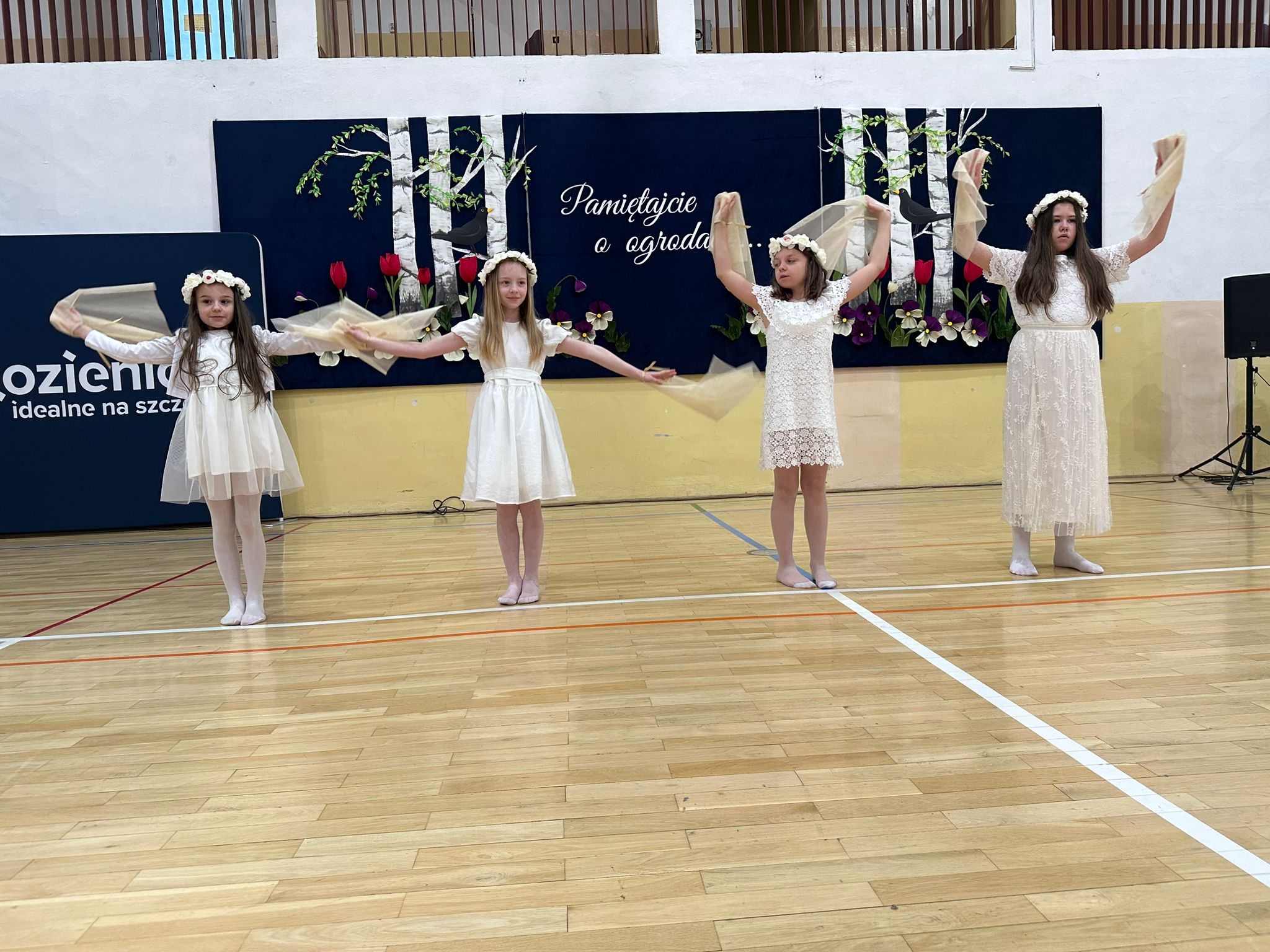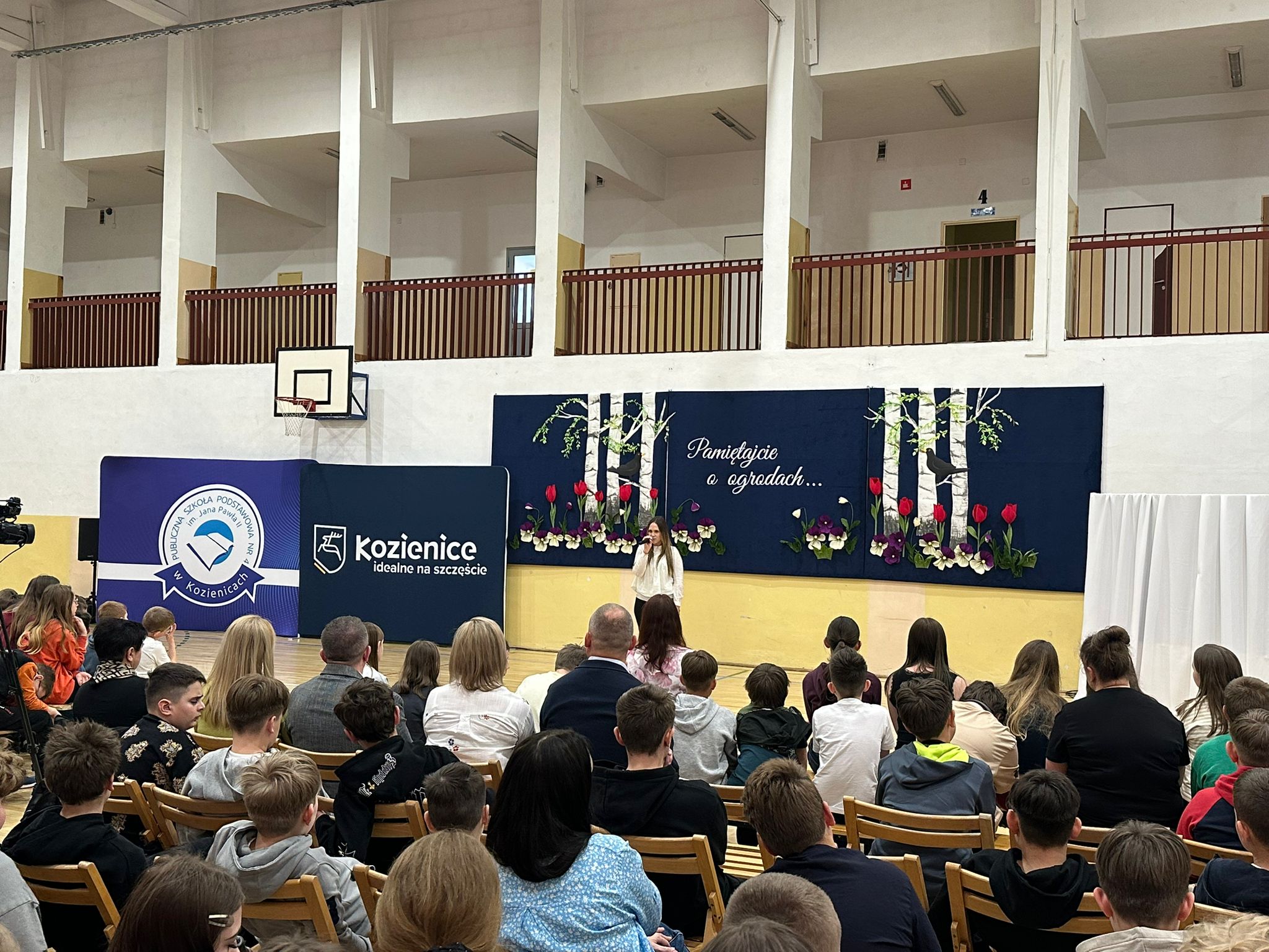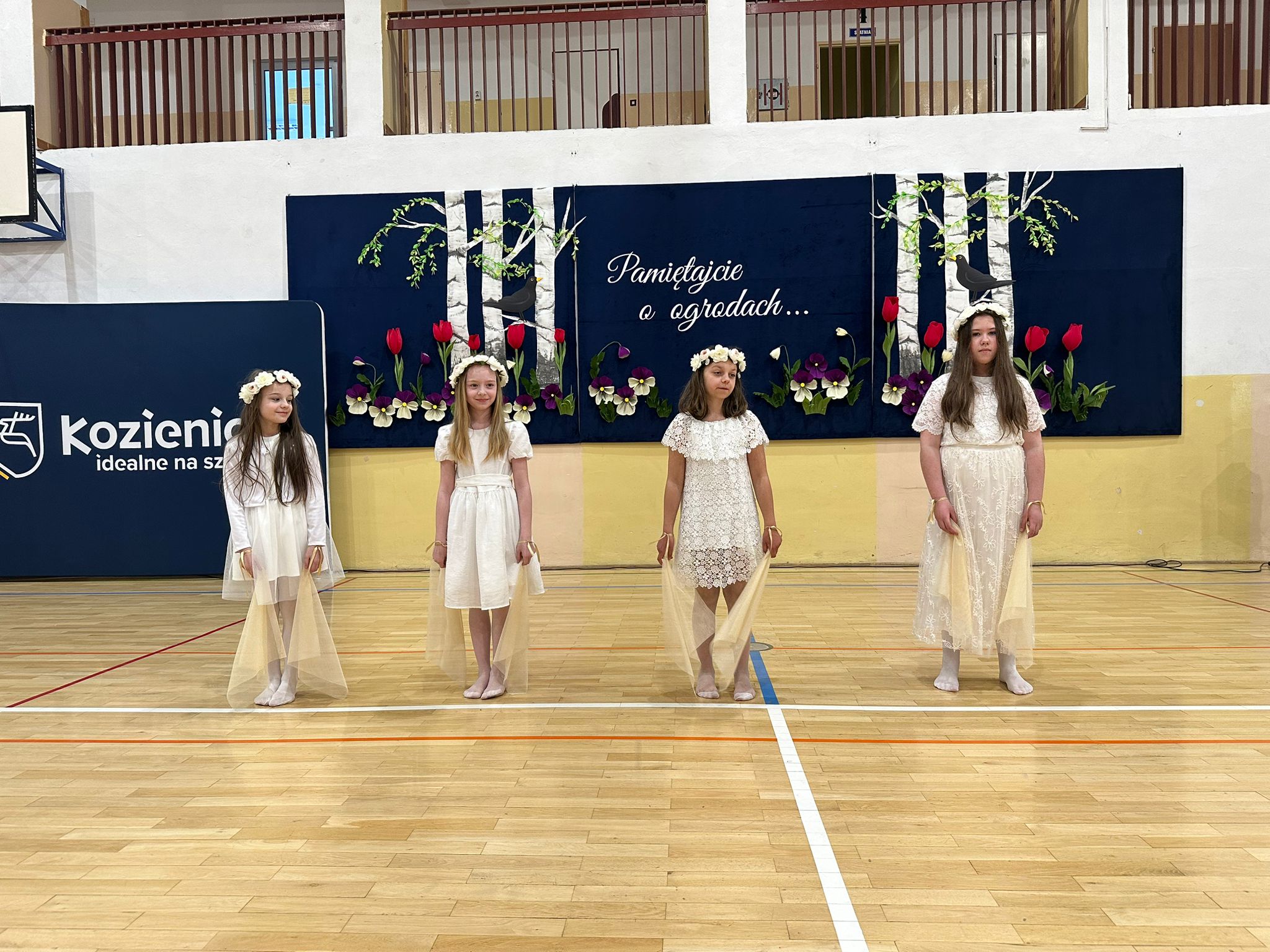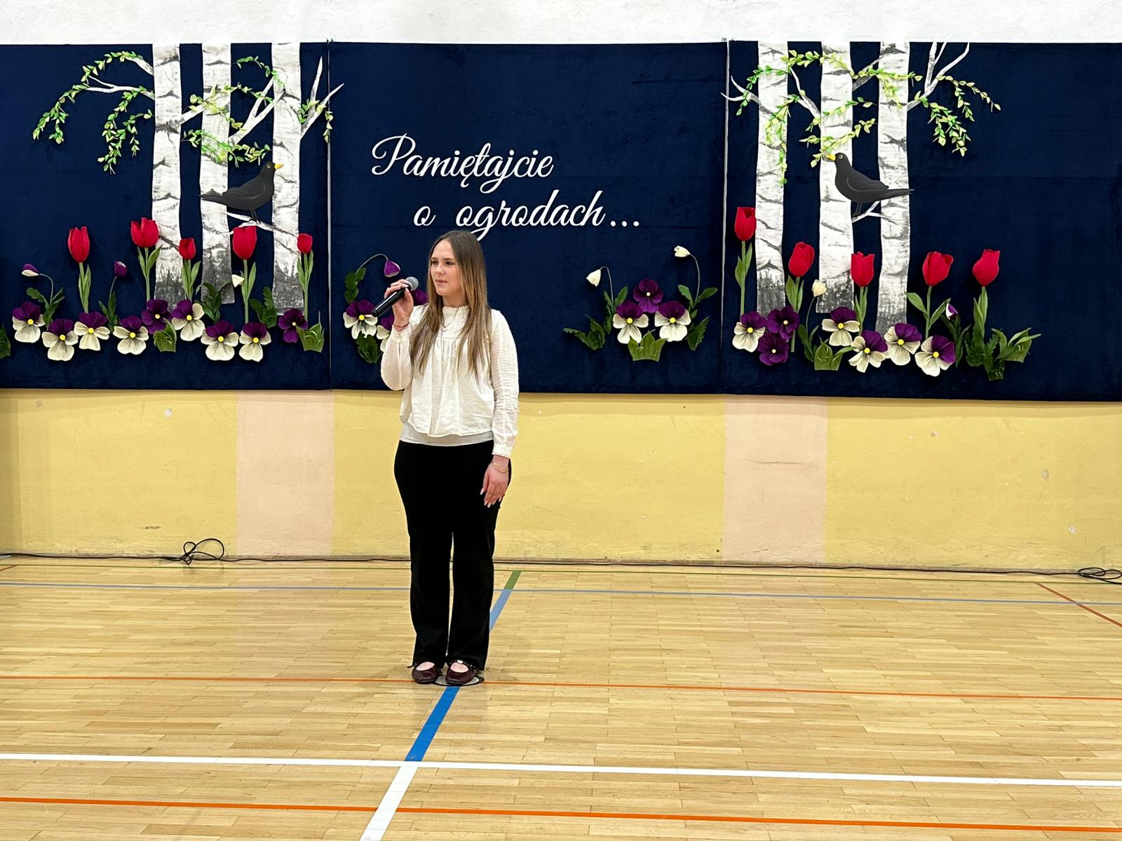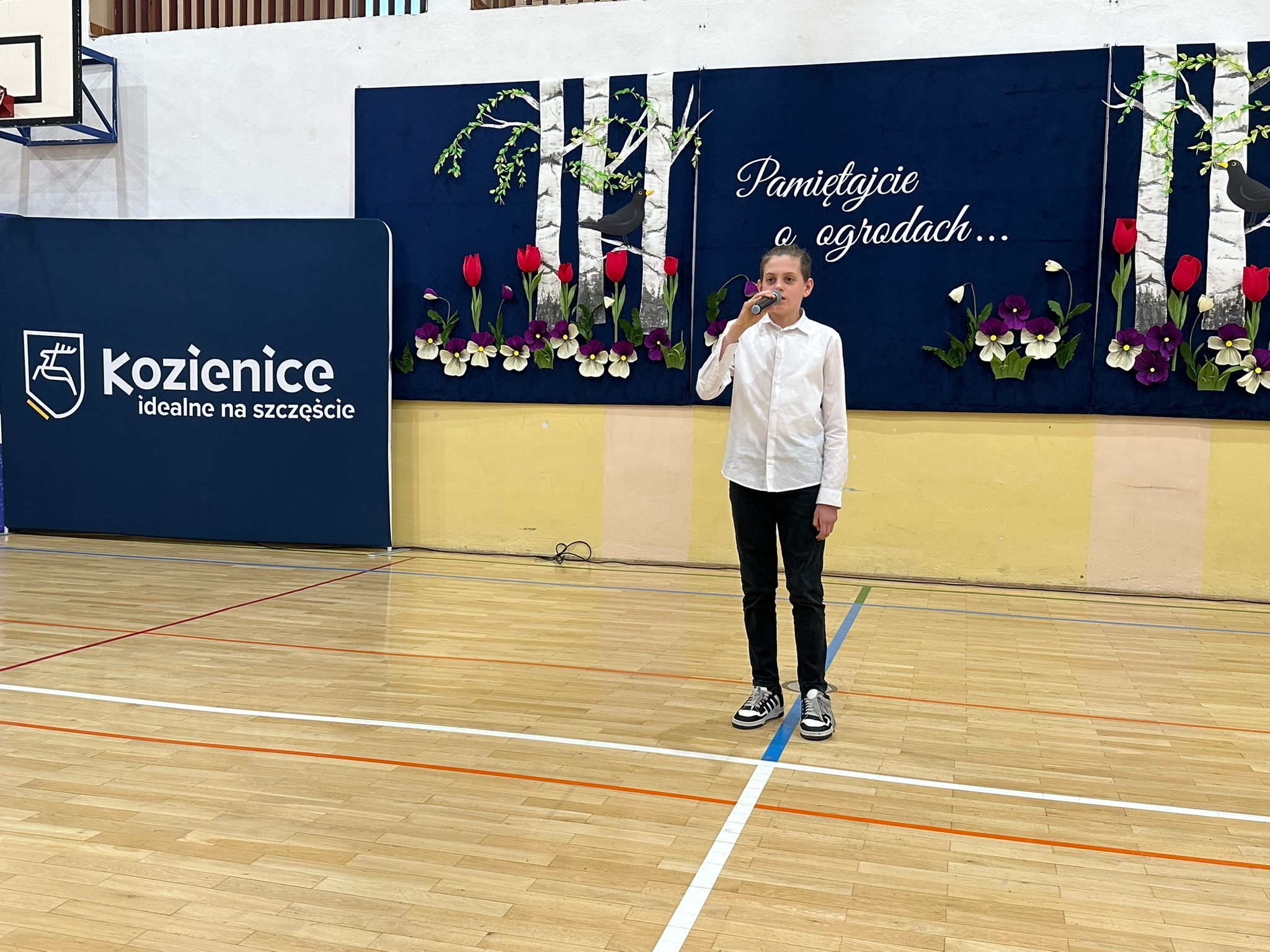 Punktem kulminacyjnym podjętych działań był montaż słowno-muzyczny, który odbył się w czwartek 23 kwietnia. Występ artystyczny „Pamiętajcie o ogrodach…” był wyjątkowym wydarzeniem, które skłoniło widzów zgromadzonych w sali gimnastycznej do refleksji nad pięknem natury, harmonią świata oraz miejscem człowieka w przyrodzie. Odbiorcami spektaklu byli Dyrektor Pan Andrzej Suwała, Wicedyrektor Pani Magdalena Prygiel, Dyrektor Wydziału Edukacji Urzędu Miejskiego w Kozienicach Pani Małgorzata Wolszczak, Doradca metodyczny MSCDN Wydział w Radomiu Pani Anna Janowska, Przewodniczący Rady Rodziców Pan Łukasz Słyk, nauczyciele oraz uczniowie klas IV – VIII naszej szkoły. Program łączył w sobie różnorodne formy wyrazu – poezję, muzykę, elementy teatralne oraz taniec – tworząc spójną i poruszającą całość. Motyw ogrodu, obecny w całym przedstawieniu, symbolizował nie tylko naturę, ale także życie człowieka oraz wartości takie jak: dobro, spokój, pamięć i wrażliwość. Występujący z dużym zaangażowaniem młodzi aktorzy zaprezentowali swoje umiejętności, oddając nastrój radości, refleksji i nostalgii, a jednocześnie przypominając o codziennej potrzebie troski o otaczający nas świat.