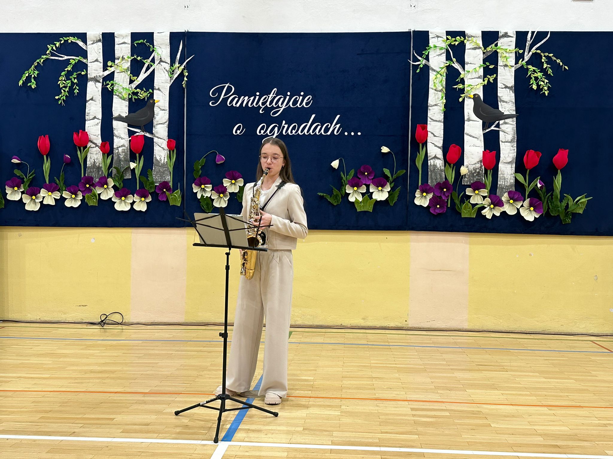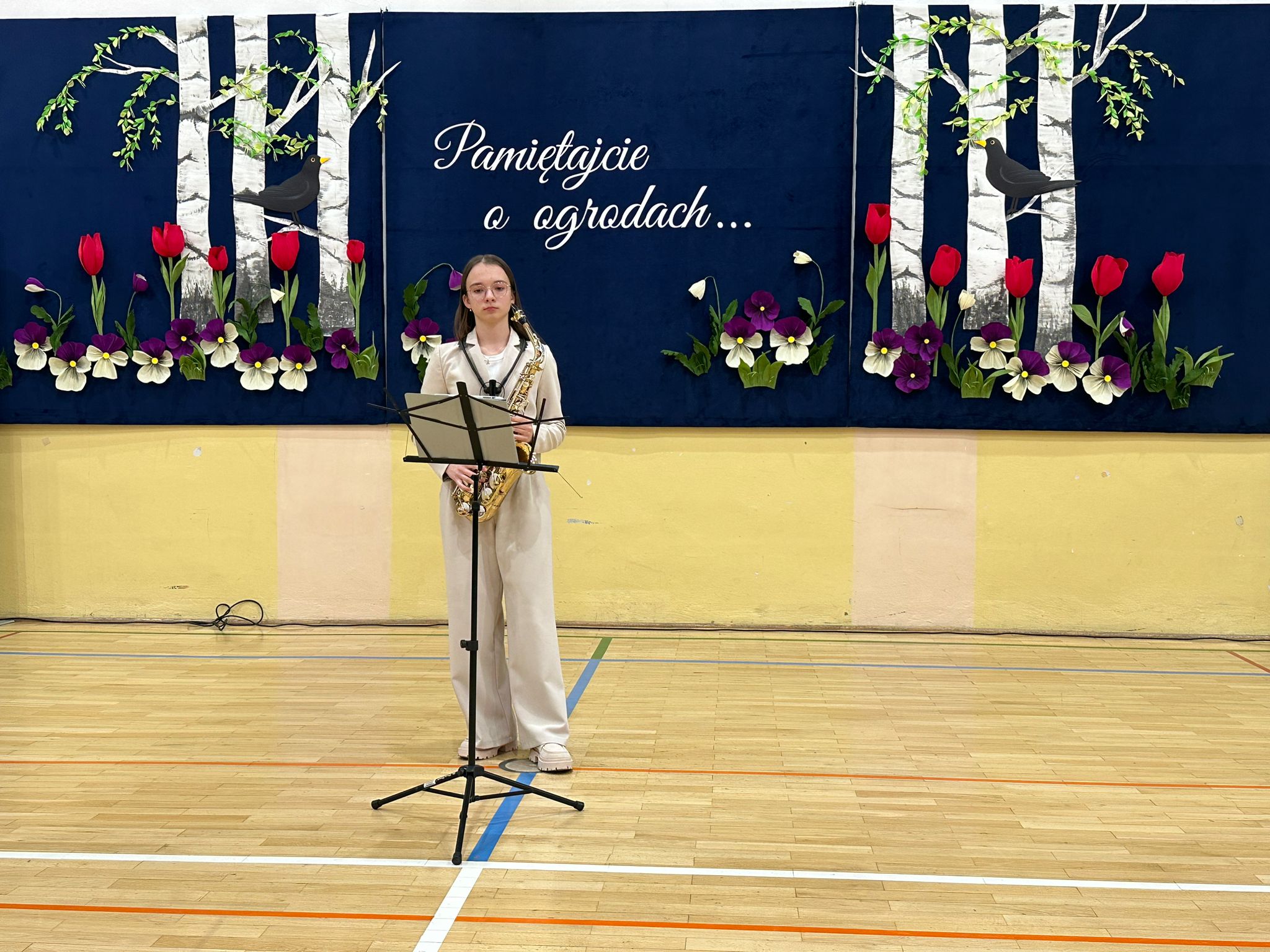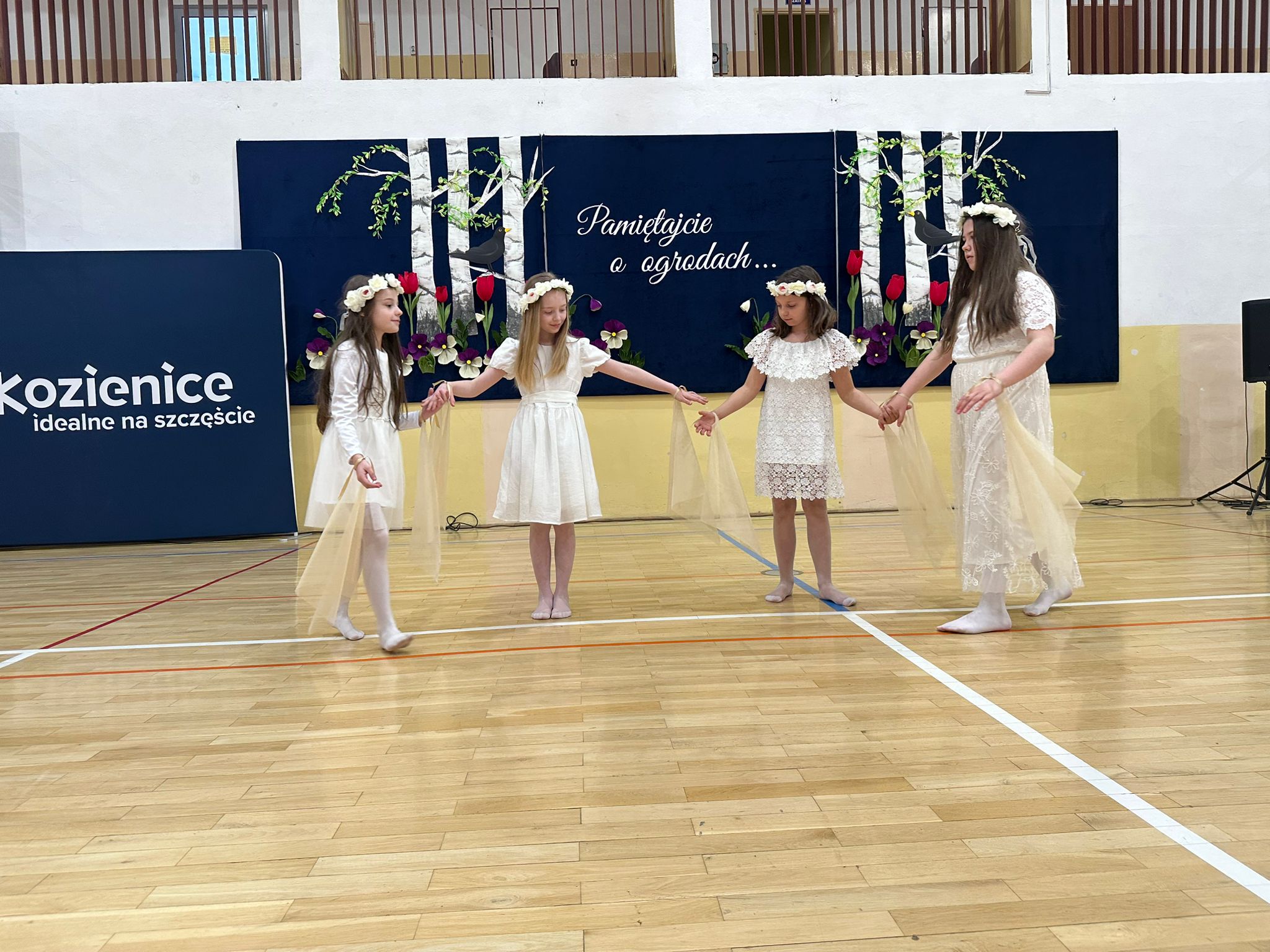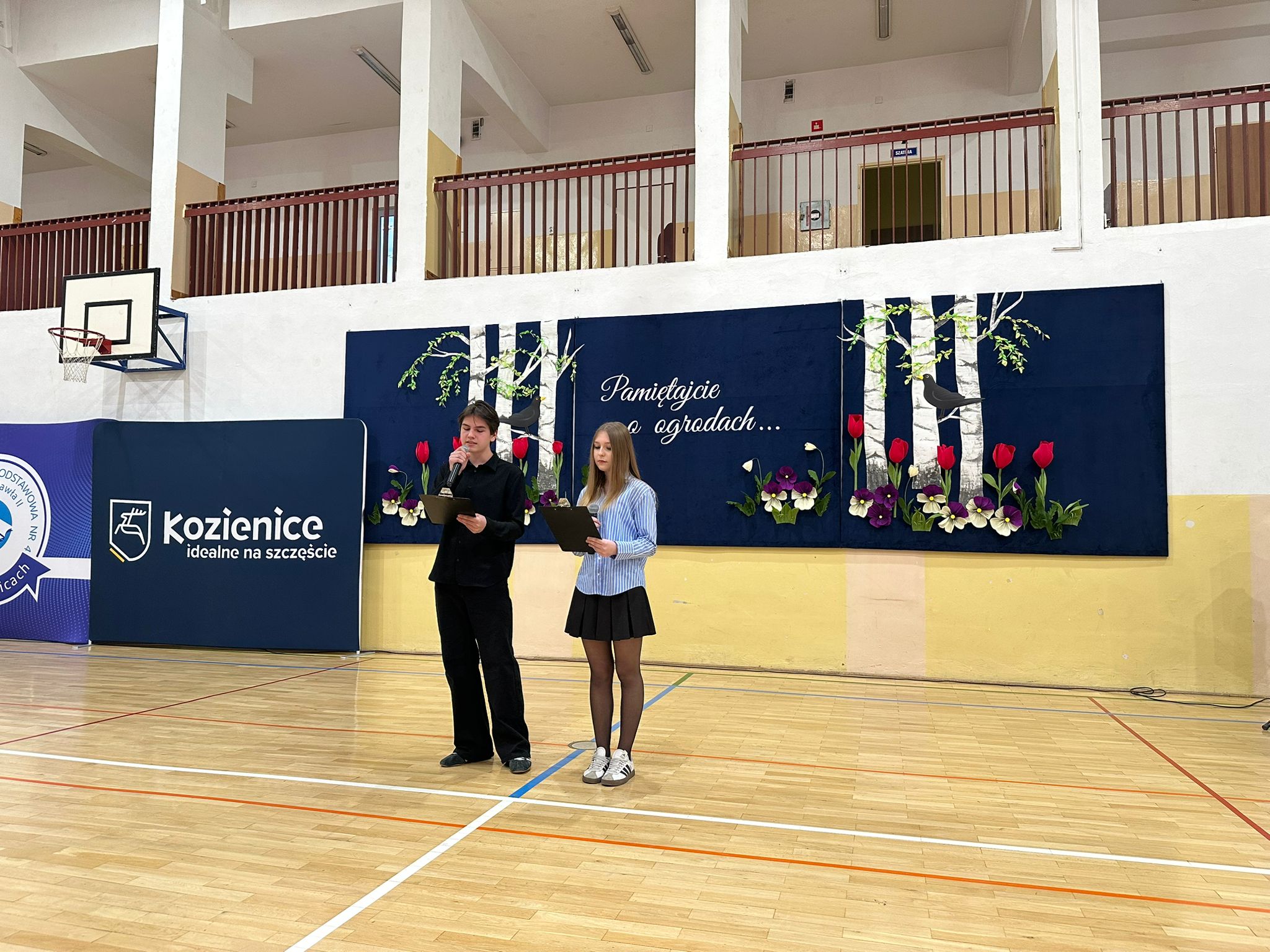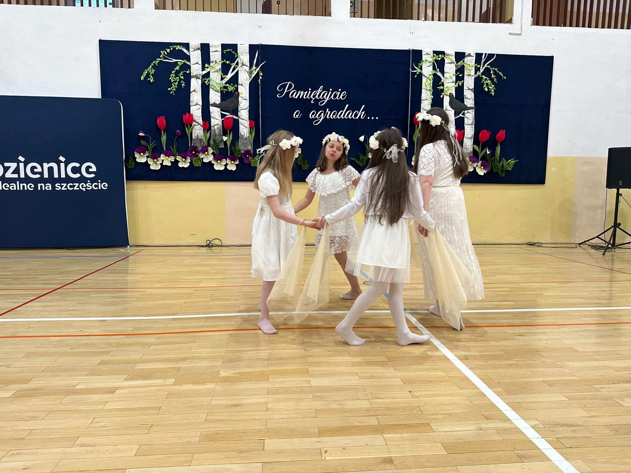 Punktem kulminacyjnym podjętych działań był montaż słowno-muzyczny, który odbył się w czwartek 23 kwietnia. Występ artystyczny „Pamiętajcie o ogrodach…” był wyjątkowym wydarzeniem, które skłoniło widzów zgromadzonych w sali gimnastycznej do refleksji nad pięknem natury, harmonią świata oraz miejscem człowieka w przyrodzie. Odbiorcami spektaklu byli Dyrektor Pan Andrzej Suwała, Wicedyrektor Pani Magdalena Prygiel, Dyrektor Wydziału Edukacji Urzędu Miejskiego w Kozienicach Pani Małgorzata Wolszczak, Doradca metodyczny MSCDN Wydział w Radomiu Pani Anna Janowska, Przewodniczący Rady Rodziców Pan Łukasz Słyk, nauczyciele oraz uczniowie klas IV – VIII naszej szkoły. Program łączył w sobie różnorodne formy wyrazu – poezję, muzykę, elementy teatralne oraz taniec – tworząc spójną i poruszającą całość. Motyw ogrodu, obecny w całym przedstawieniu, symbolizował nie tylko naturę, ale także życie człowieka oraz wartości takie jak: dobro, spokój, pamięć i wrażliwość. Występujący z dużym zaangażowaniem młodzi aktorzy zaprezentowali swoje umiejętności, oddając nastrój radości, refleksji i nostalgii, a jednocześnie przypominając o codziennej potrzebie troski o otaczający nas świat.