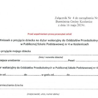 Do pobrania: Wniosek o przyjęcie dziecka na dyżur wakacyjny do Oddziałów Przedszkolnych -> pobierz