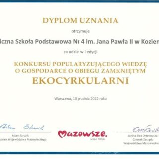 Pod koniec grudnia 2022r. Publiczna Szkoła Podstawowa nr 4 im. Jana Pawła II w Kozienicach przekazała do Centrum Kulturalno- Artystycznego w Kozienicach 23 worki 120 litrowe plastikowych nakrętek . Będą one przeznaczone na rehabilitację...
