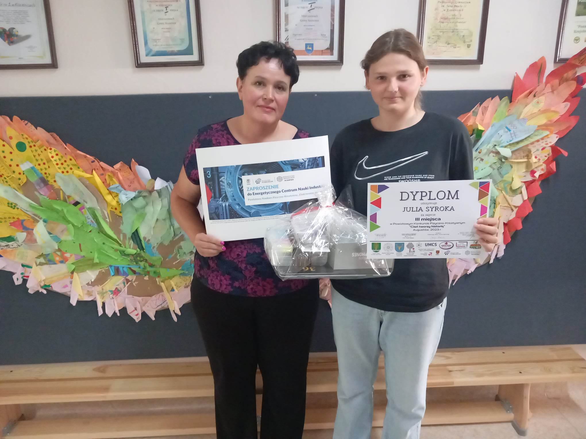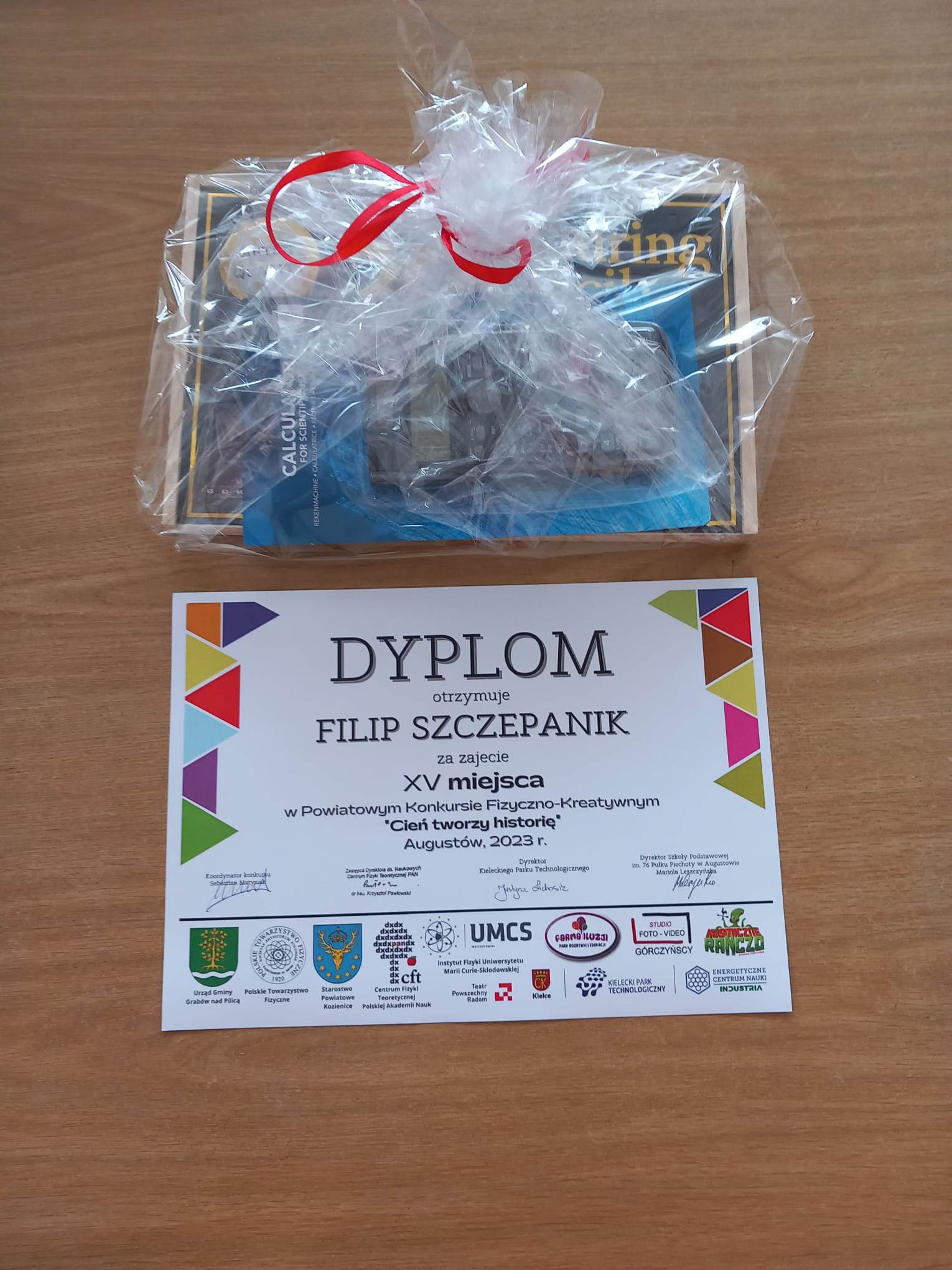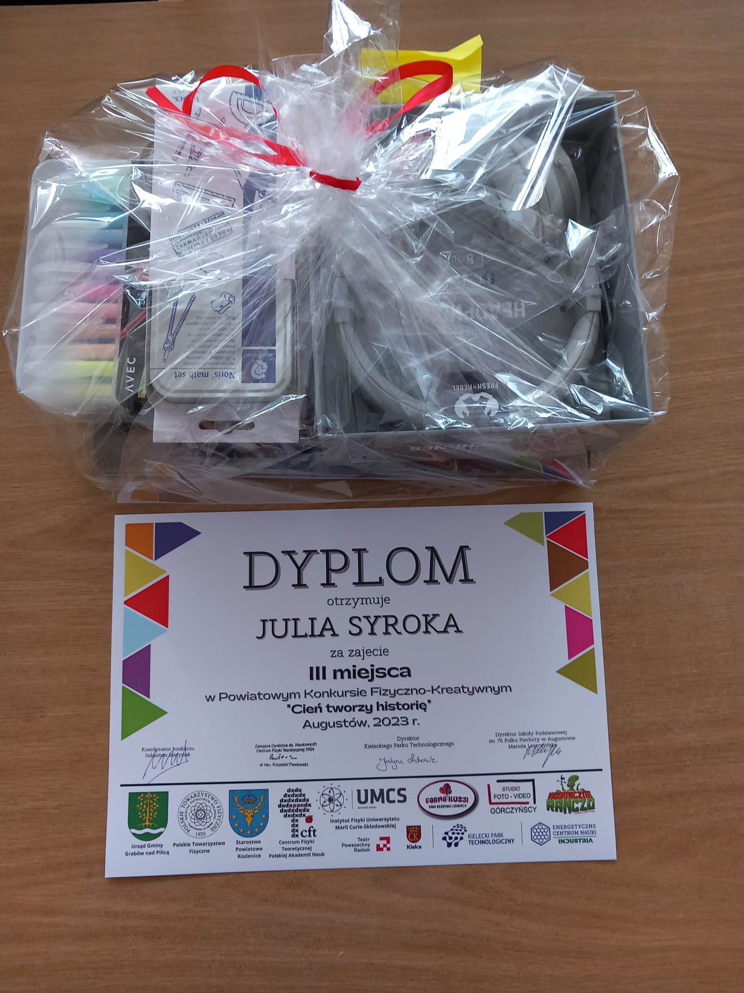 15 czerwca 2023 roku w Publicznej Szkole Podstawowej w Augustowie koło Grabowa nad Pilicą miało miejsce rozstrzygnięcie Powiatowego Konkurs Fizyczno-Kreatywnego „Cień Tworzy Historię”. W konkursie tym uczeń za pomocą światła tworzył cień dowolnego przedmiotu, a potem wykorzystując swoją wyobraźnię, dorysowywał do niego coś, co podpowiadała mu wyobraźnia. Prac było wiele. Wszyscy uczestnicy wykazali się dużą pomysłowością i inwencją twórczą. Miło nam, że nasi uczniowie uplasowali się na czołowych miejscach. Wśród laureatów znalazła się uczennica Julia Syroka, zajmując III miejsce, a praca Filipa Szczepanika otrzymała wyróżnienie. Opiekunem uczniów z Publicznej Szkoły Podstawowej nr 4 w Kozienicach była nauczycielka fizyki i matematyki, Pani Urszula Szerszeń.