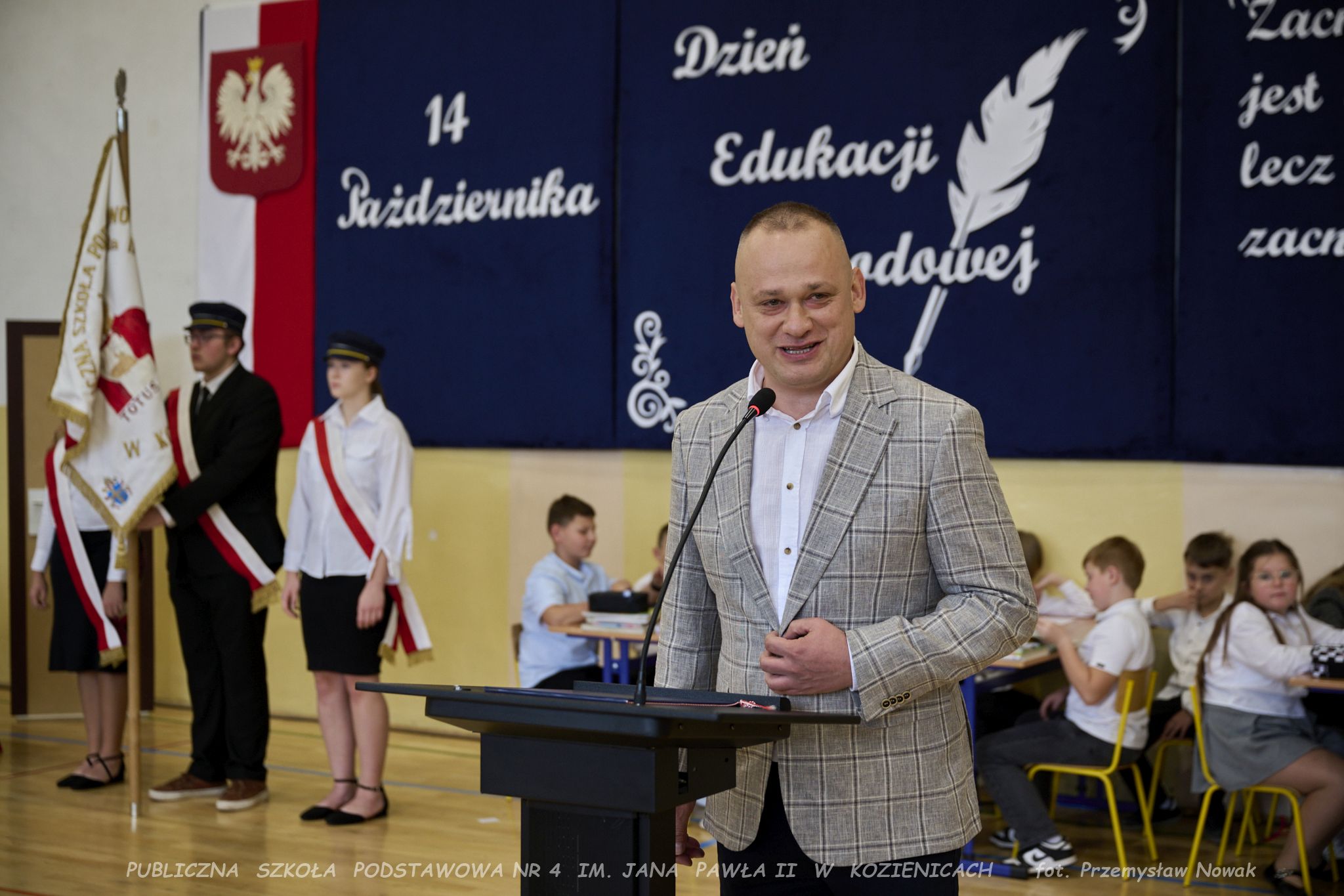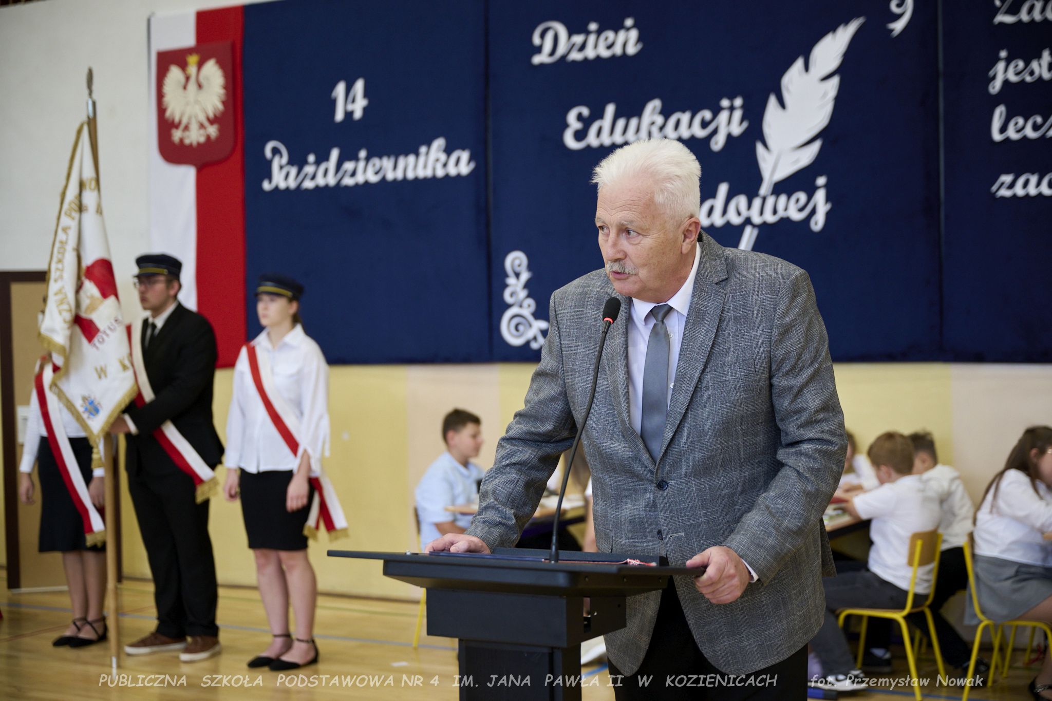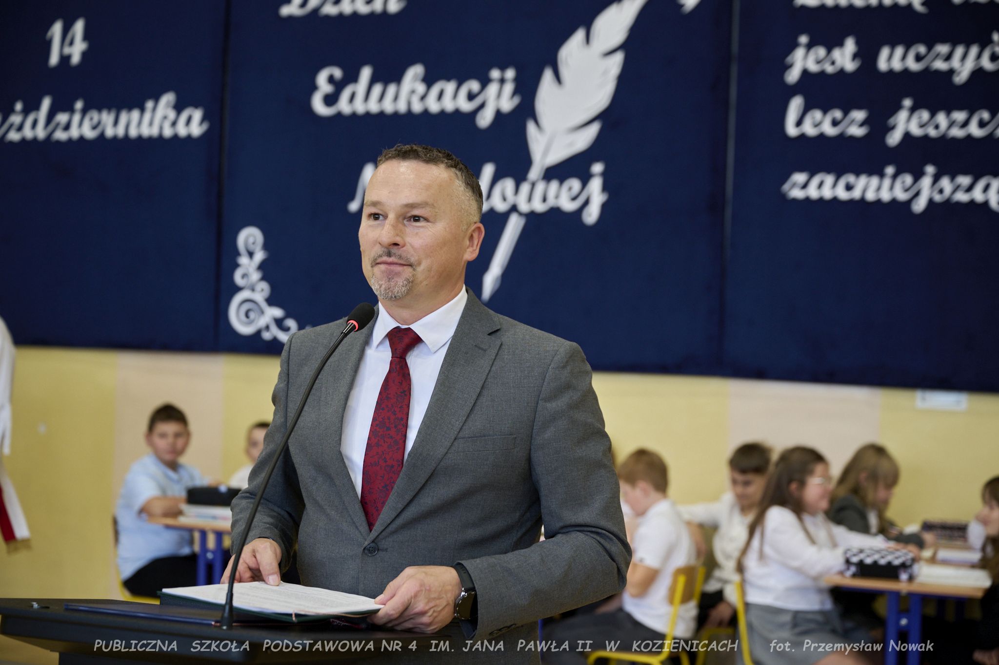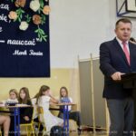 odśpiewaniem hymnu narodowego. Następnie pan dyrektor Andrzej Suwała powitał zgromadzonych gości, pracowników , uczniów i rodziców przybyłych na uroczystość. Złożył serdeczne życzenia nauczycielom oraz wszystkim pracownikom naszej placówki. Wyraził swoje uznanie dla ich pracy, życząc wytrwałości i satysfakcji z wykonywanego zawodu, aby każdy dzień ich pracy
