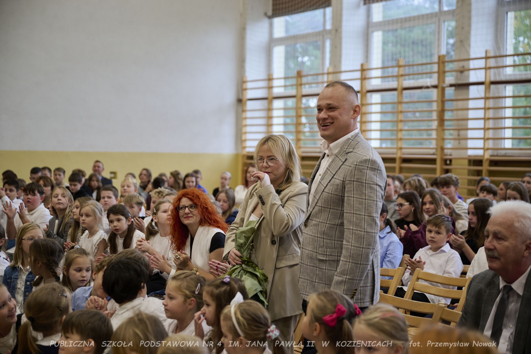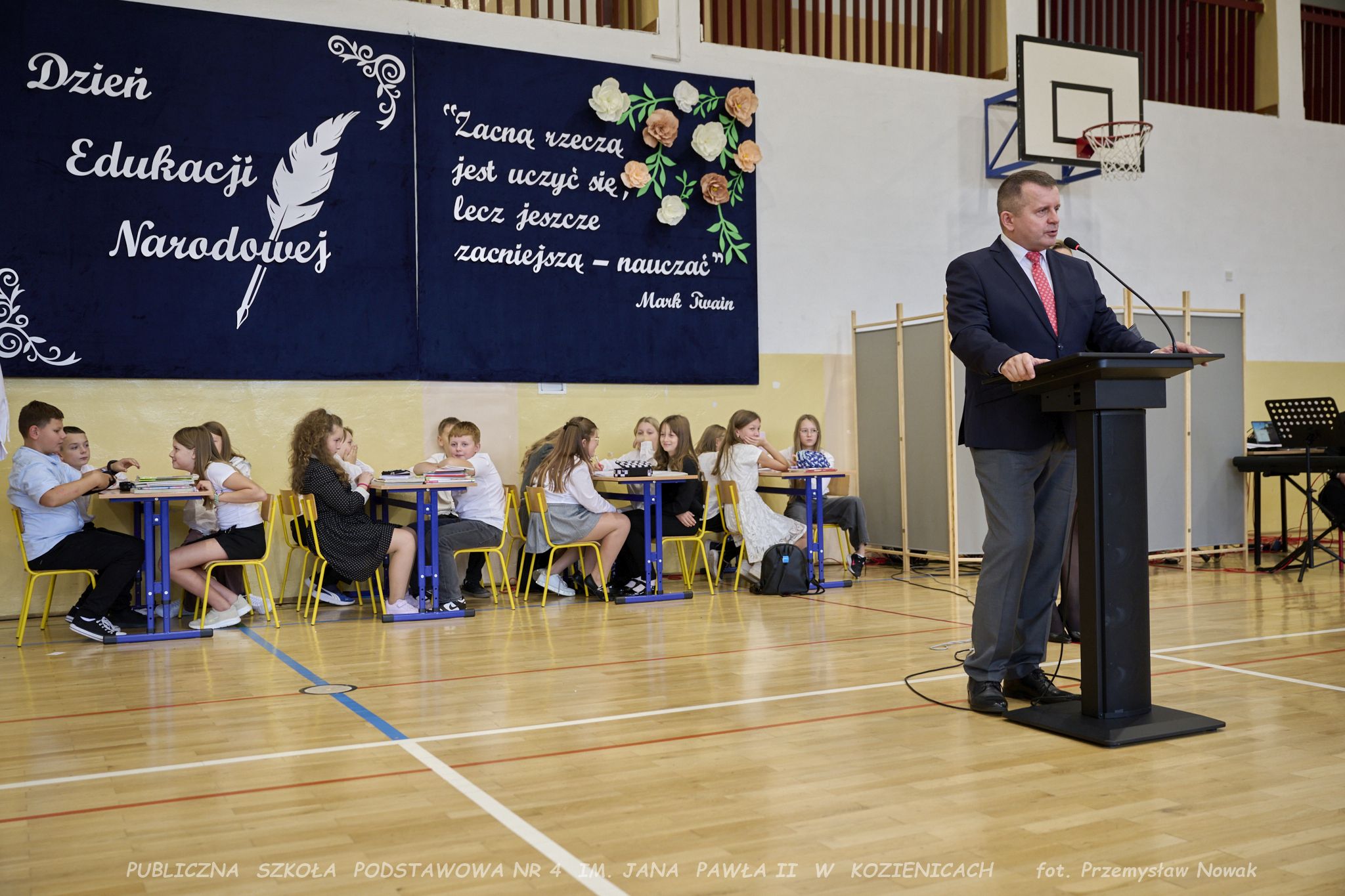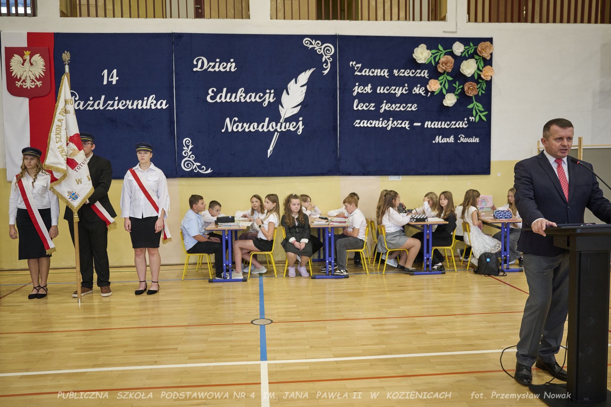 odśpiewaniem hymnu narodowego. Następnie pan dyrektor Andrzej Suwała powitał zgromadzonych gości, pracowników , uczniów i rodziców przybyłych na uroczystość. Złożył serdeczne życzenia nauczycielom oraz wszystkim pracownikom naszej placówki. Wyraził swoje uznanie dla ich pracy, życząc wytrwałości i satysfakcji z wykonywanego zawodu, aby każdy dzień ich pracy