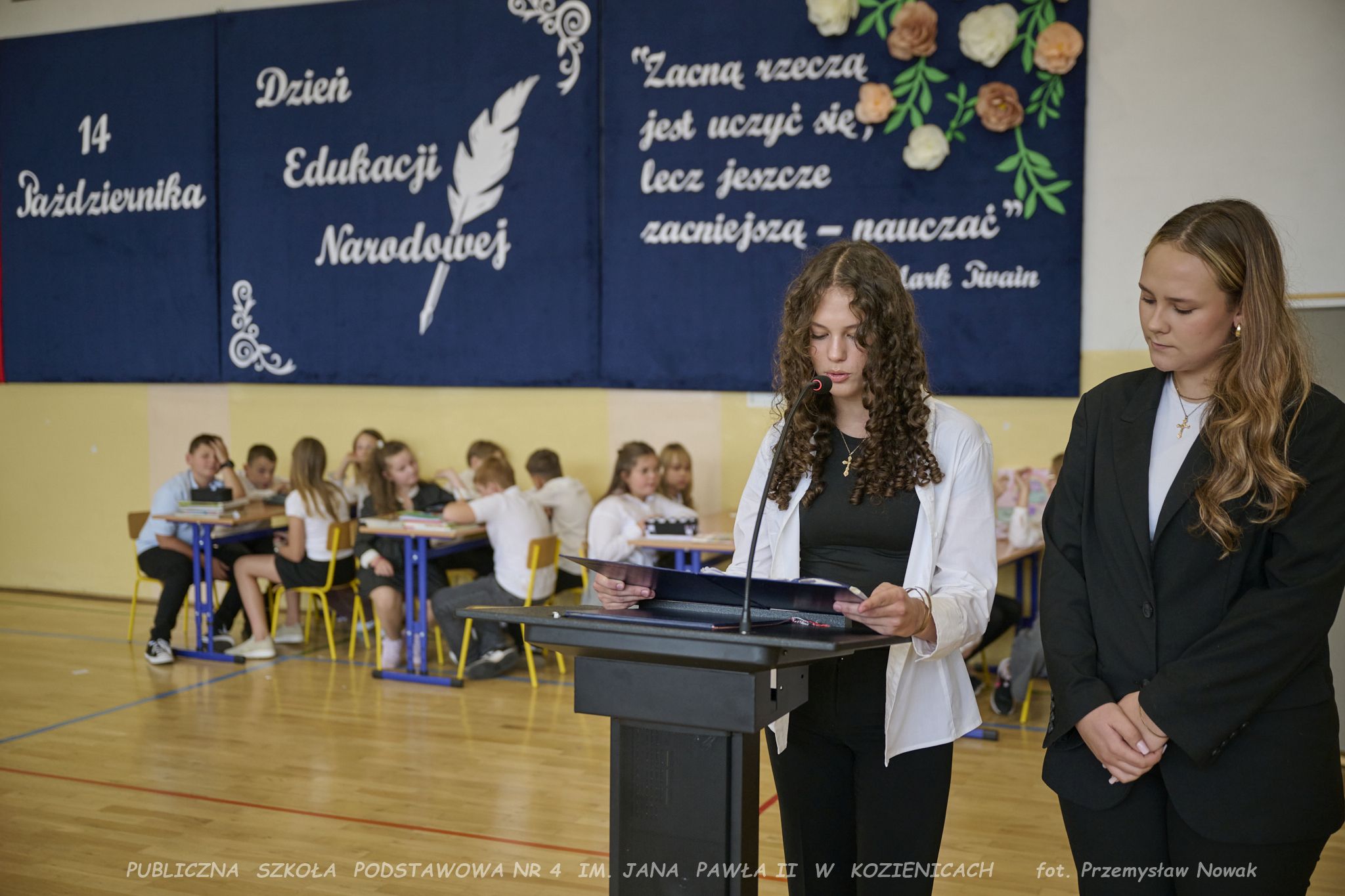 W tym roku ten dzień w naszej szkole upłynął w niezwykle sympatycznej atmosferze. Uroczysta akademia 10 października 2025 r. była sprzyjającym momentem, aby podziękować wszystkim nauczycielom oraz pracownikom szkoły za ich trud, serce oraz wkład w wychowanie i nauczanie. Gronu Pedagogicznemu oraz pozostałym pracownikom naszej placówki uczniowie życzyli wielu sukcesów zawodowych, spełnienia marzeń, społecznego uznania oraz niesłabnącego zapału do kształtowania młodych sumień. Podziękowali również za pokazanie, że porażki mogą czegoś pożytecznego ich nauczyć, a gdy pojawiają się trudności, można odkryć swą siłę, bo dobro i życzliwość to fundament szkolnej codzienności.