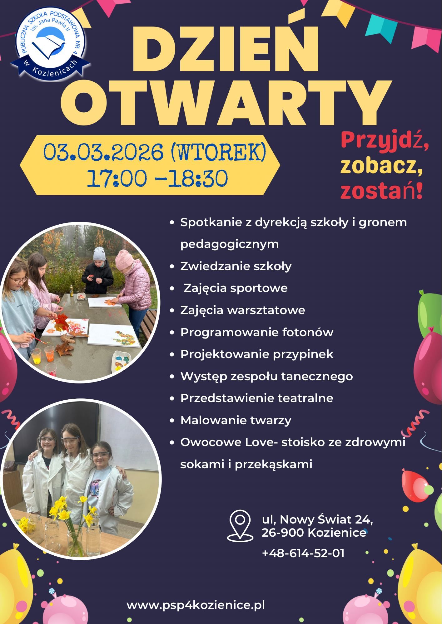 Dyrekcja szkoły wraz z gronem pedagogicznym serdecznie zapraszają przyszłych PRZEDSZKOLAKÓW I PIERWSZAKÓW wraz z rodzicami na Dzień Otwarty do Publicznej Szkoły Podstawowej nr 4 w Kozienicach .