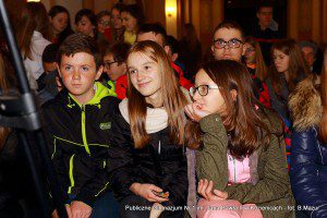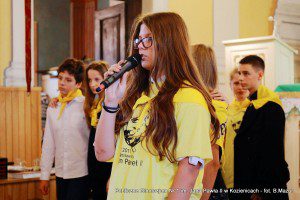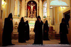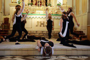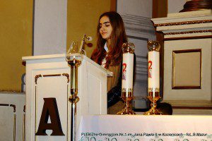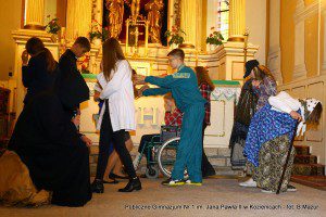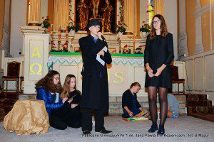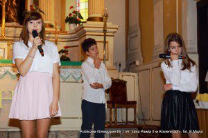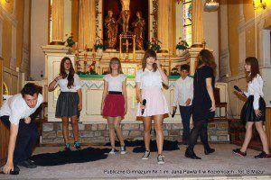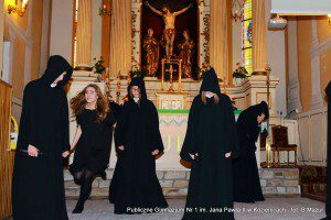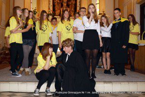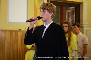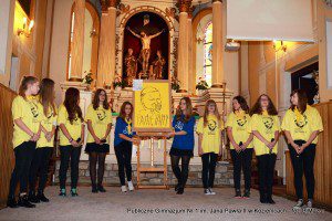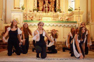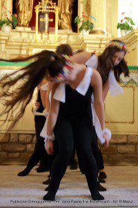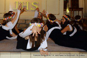 Na koniec Krystian Jasek, Natalia Kłos i Ada Jaros przypomnieli wiersz „Zdumienie” z “Tryptyku Rzymskiego” Jana Pawła II, który mówi o przemijaniu świata; przemijaniu, które ma sens, a którego zrozumienie doprowadza do spotkania z Bogiem. Młodzież przybliżyła dokonania Jana Pawła II i zadeklarowała, że będzie pamiętała o przesłaniach moralnych swojego Patrona. Przejmujący obraz stworzyła dziesięcioosobowa formacja taneczna w składzie: Wiktoria Banaś, Anita Baryłka, Julia Wójcik, Anna Ofiara, Karolina Majdak, Klaudia Hałdaś, Karolina Tłuścik, Natalia Nowak, Aneta Kacperek i Nikola Karaś, która przygotowała układ choreograficzny do utworu muzycznego „Ameno”. Białe szarfy