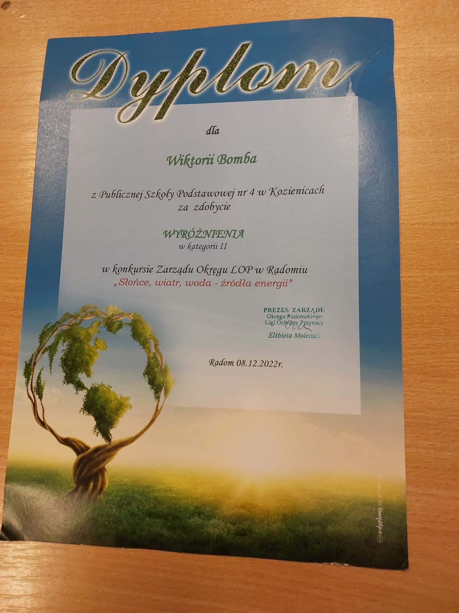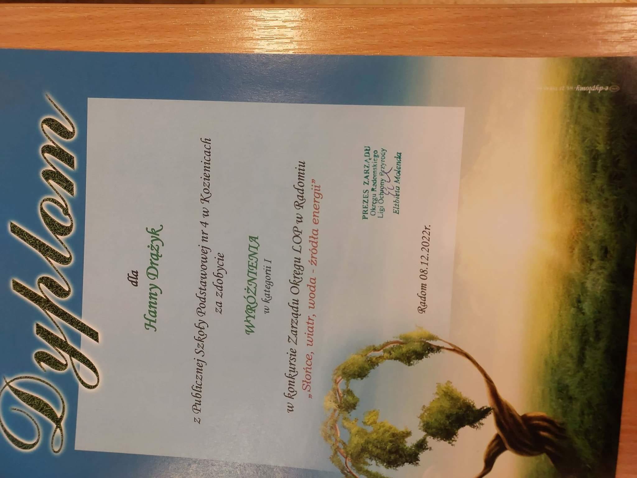 Zaangażowanie naszych uczniów zostało docenione przez Zarząd Okręgu w Radomiu LOP. 08.12.2022 r. odbyła się konferencja nt. „Poznaj i chroń przyrodę”, której organizatorem była Liga Ochrony Przyrody Zarząd Okręgu w Radomiu oraz Regionalna Dyrekcja Lasów Państwowych w Radomiu. Podczas konferencji wręczono nagrody placówkom i opiekunom SK LOP z regionu radomskiego. Za działania na rzecz przyrody i ochrony środowiska Szkolne Koło Ligi Ochrony Przyrody działające w naszej szkole zajęło I miejsce w konkursie „Najlepiej pracujące szkolne koło LOP” w regionie radomskim. Podczas konferencji podsumowano również konkurs pt.” Słońce, wiatr, woda- źródła energii”. Składał się on z kilku kategorii. W kategorii I ( praca plastyczna- wybrane źródło energii, które podoba się dziecku najbardziej)- II miejsce zdobyła Alicja Kosacka z grupy Motylki Oddziału Przedszkolnego w PSP nr 4 (opiekunowie: Bernarda Dobrowolska i Patrycja Kryczka), II miejsce Michał Połeć – uczeń klasy 1a ( opiekun Joanna Lenarczyk),wyróżnienie Hanna Drążyk z klasy 2c ( opiekun Iwona Bitner).W kategorii II ( plakat zachęcający do przejścia na alternatywne źródła energii)- wyróżnienie: Wiktoria Bomba- uczennica klasy 5b (opiekun Iwona Bitner). W kategorii III ( praca opisowa -Słońce, wiatr czy woda- które z tych źródeł najkorzystniej można wykorzystać) –wyróżnienie- Emilia Wanat- uczennica klasy 8a ( opiekun Iwona Bitner).