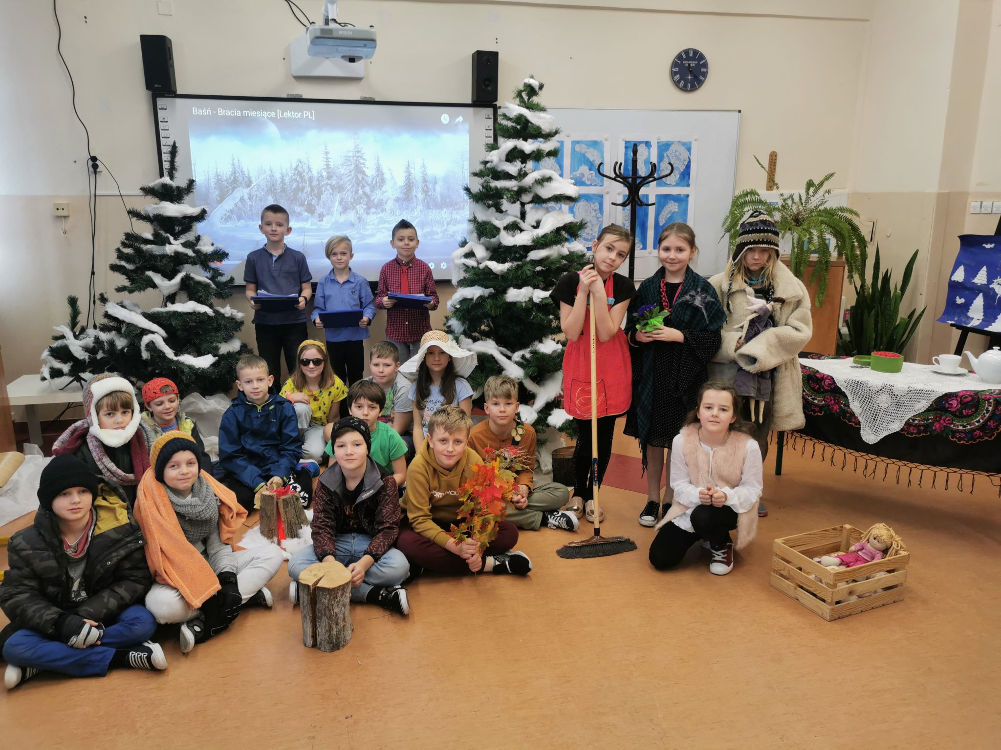 W dniu 29 stycznia uczniowie klasy 3a pod kierunkiem pani Agnieszki Strzelczyk podjęli się realizacji inscenizacji ,, Baśni o Dwunastu Miesiącach” Janiny Porazińskiej. Dekoracje zostały zaprojektowane i wykonane podczas zajęć koła ,,Twórcze podróże małe i duże”. Poczynania ,,aktorskie” uczniów nagrała pani Joanna Lenarczyk.