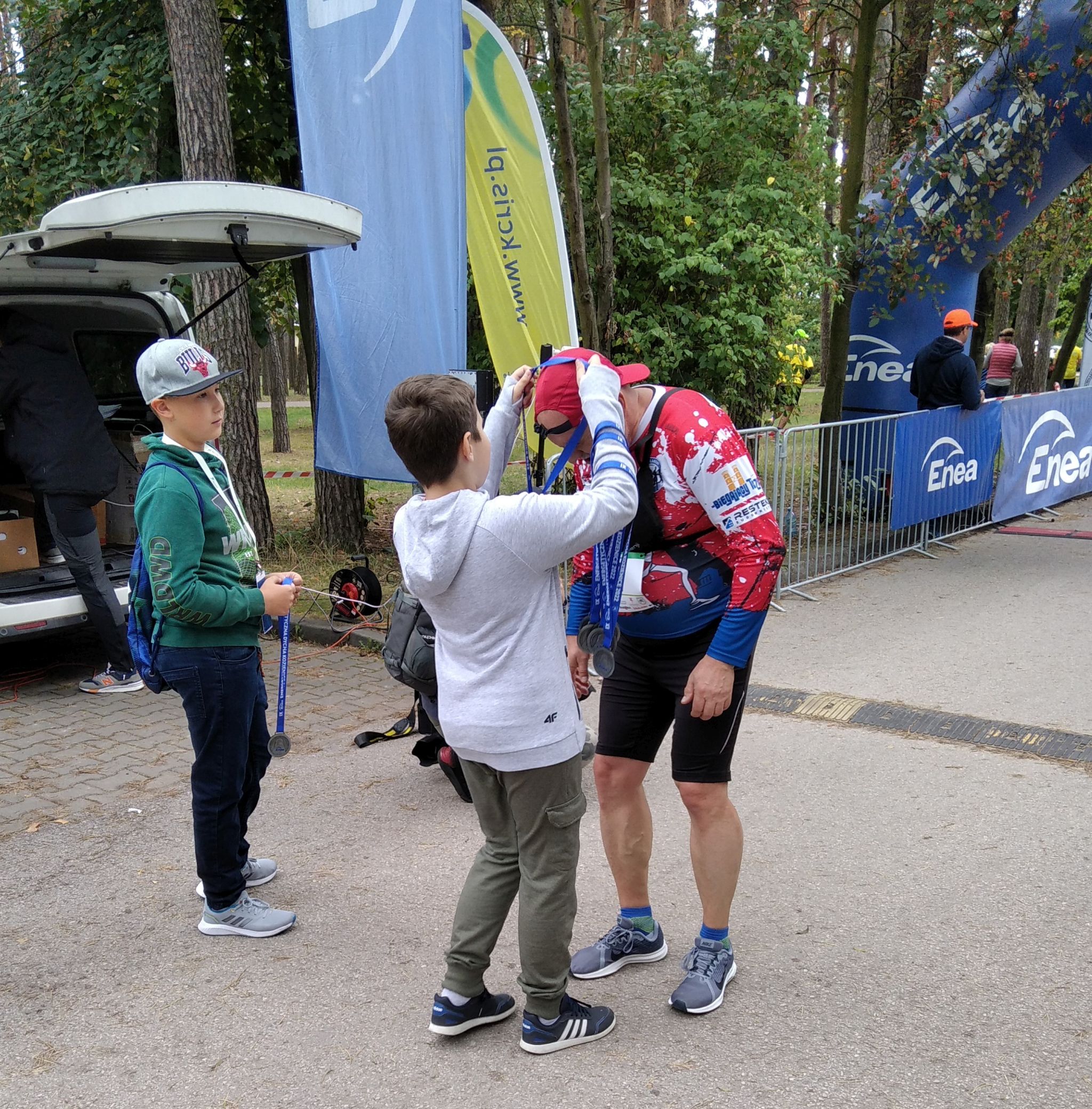 w dekoracji zwycięzców, wręczając pamiątkowe medale na mecie biegu.
