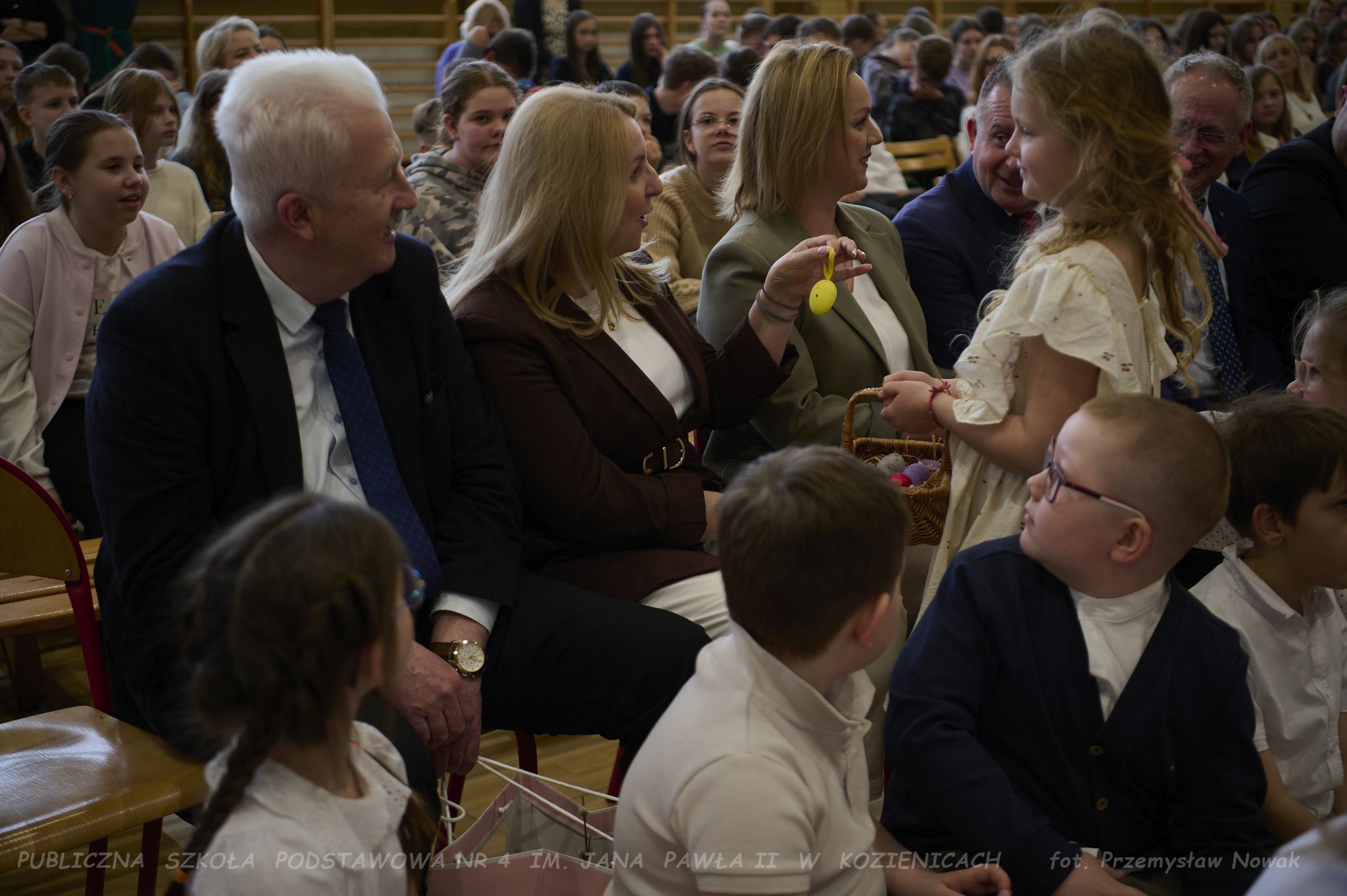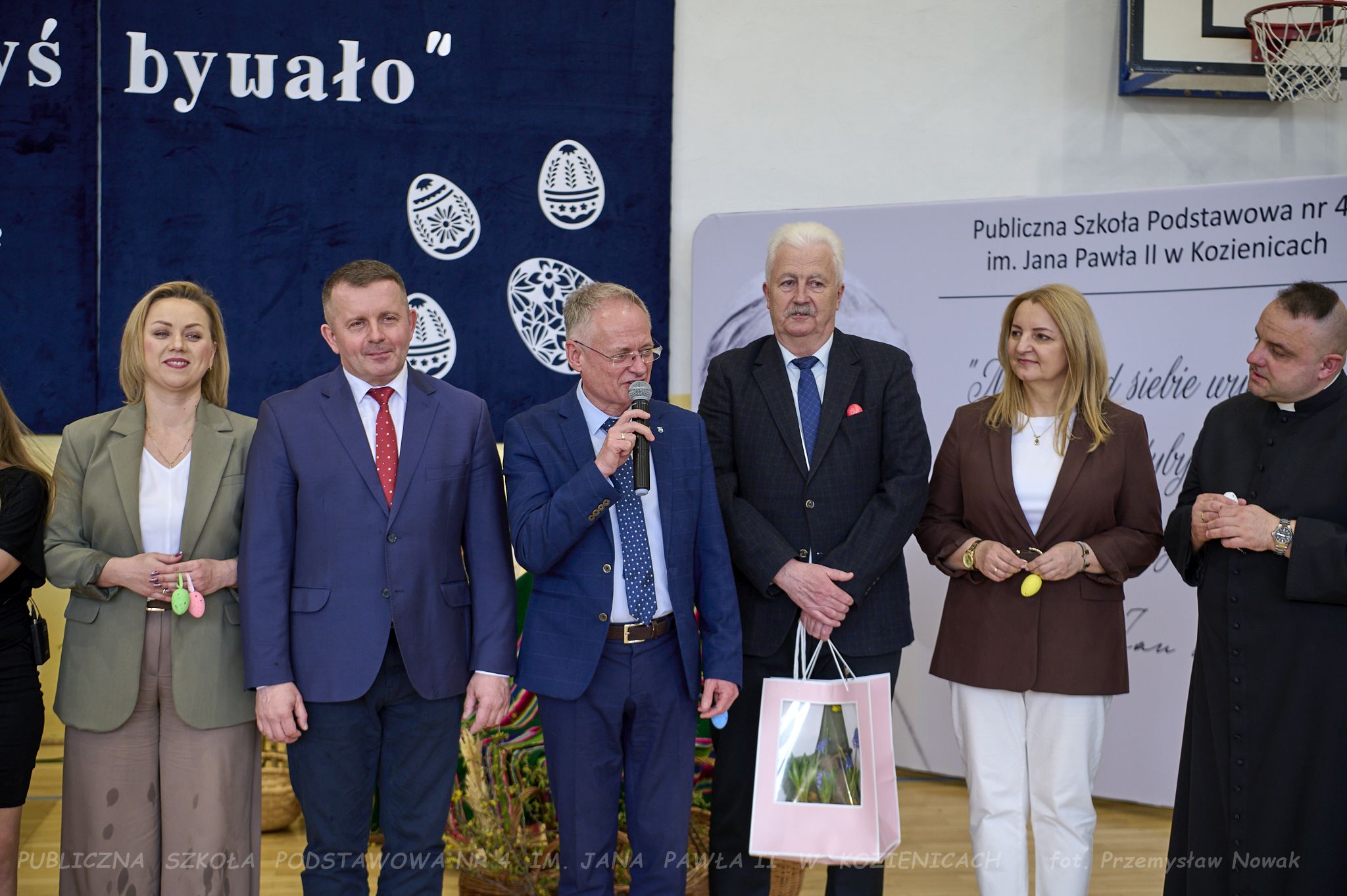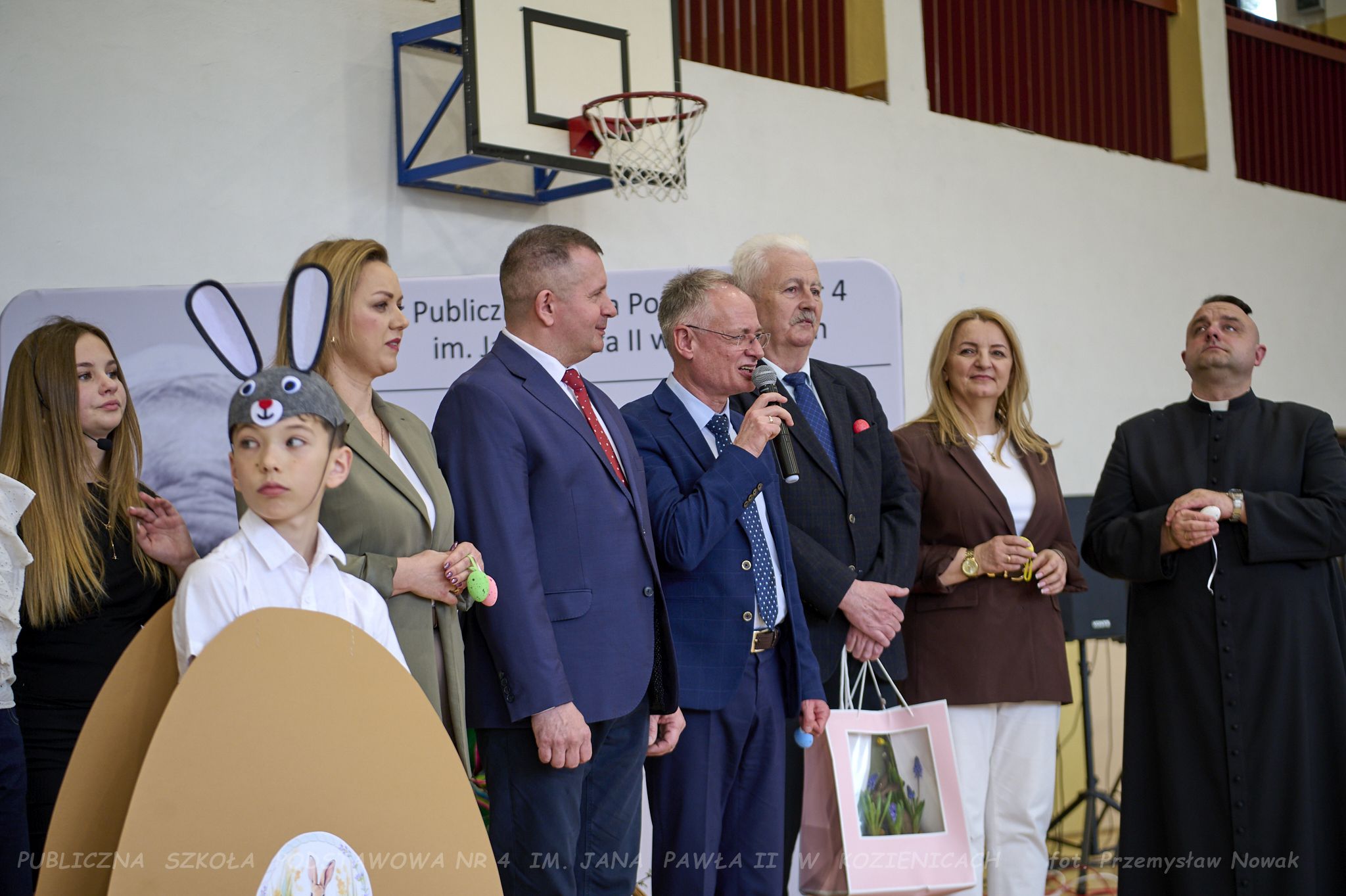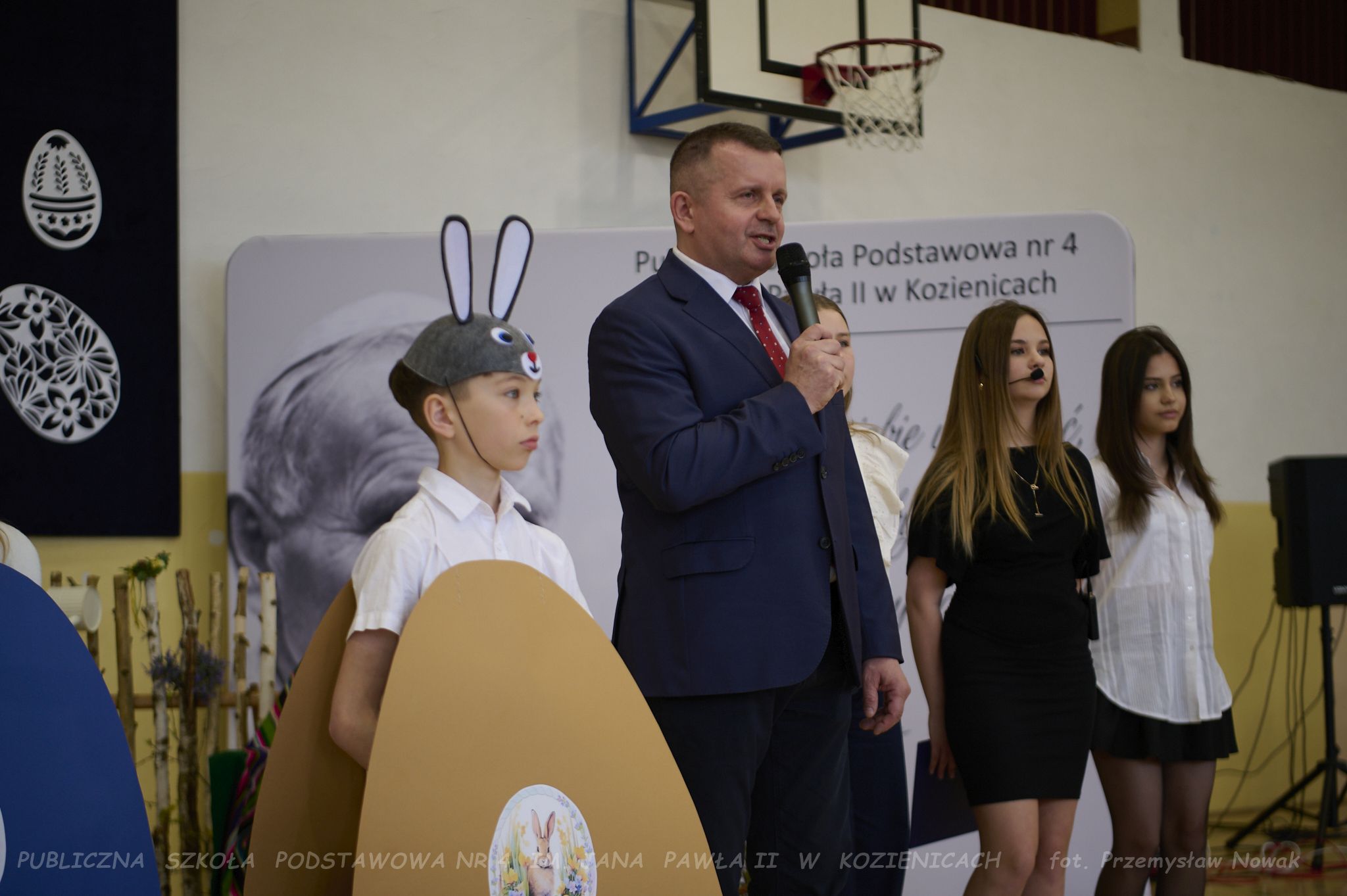 Następnie głos zabrał Dyrektor Szkoły, pan Andrzej Suwała, który podziękował uczniom za przygotowanie występu oraz złożył wszystkim obecnym świąteczne życzenia spokoju, miłości i radości. Również Pan Wiceburmistrz Robert Boryczka podziękował organizatorom i przekazał serdeczne życzenia wielkanocne dla wszystkich zgromadzonych i ich rodzin. Życzenia złożyła też Pani Wicedyrektor Magdalena Prygiel, która życzyła, aby przedstawione przez uczniów tradycje wywołały podczas nadchodzących świąt uśmiech i radość, ale żeby nie przysłaniały prawdziwej ich istoty, jaką jest zwycięstwo dobra nad złem, życia nad śmiercią.
