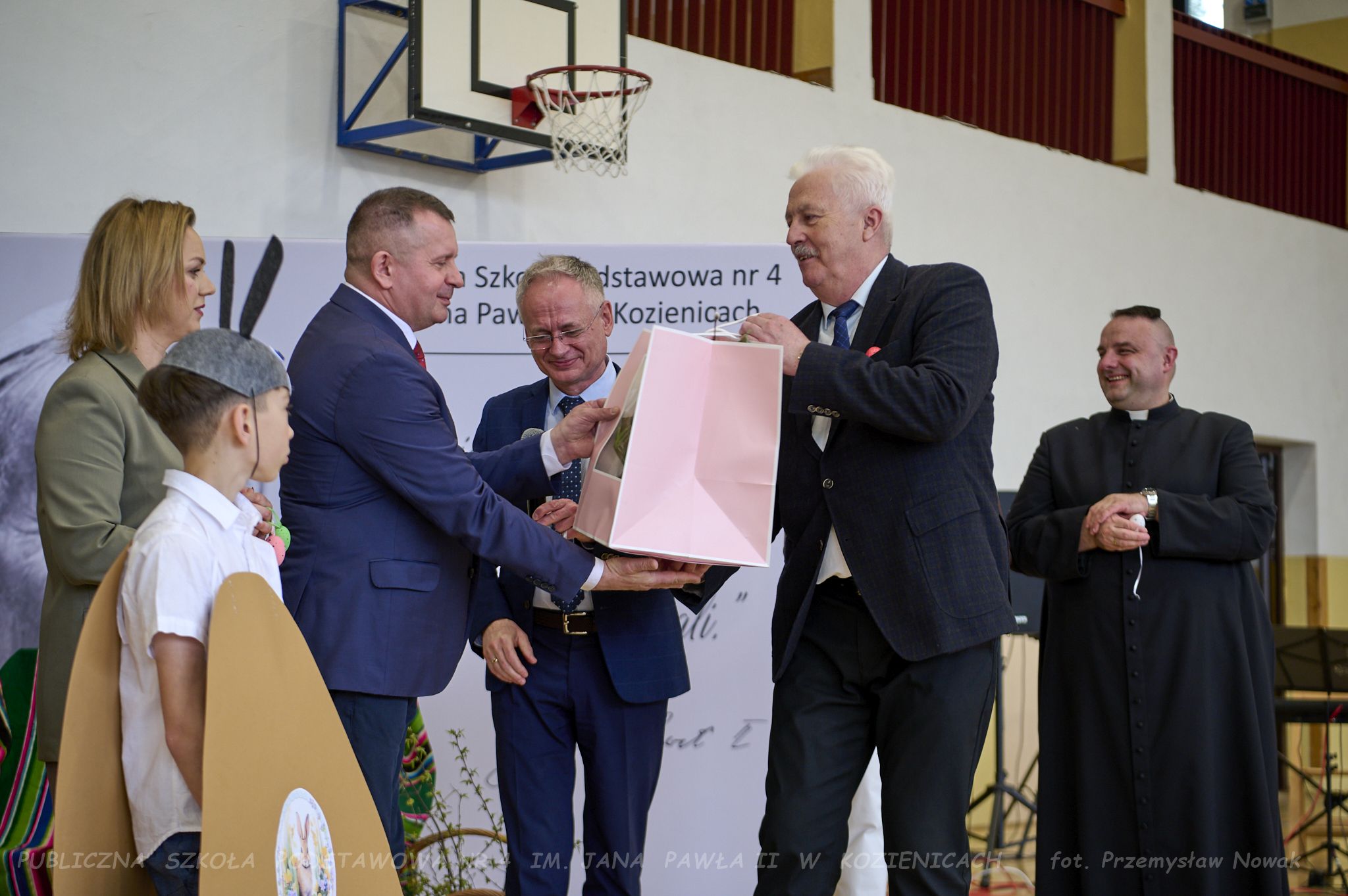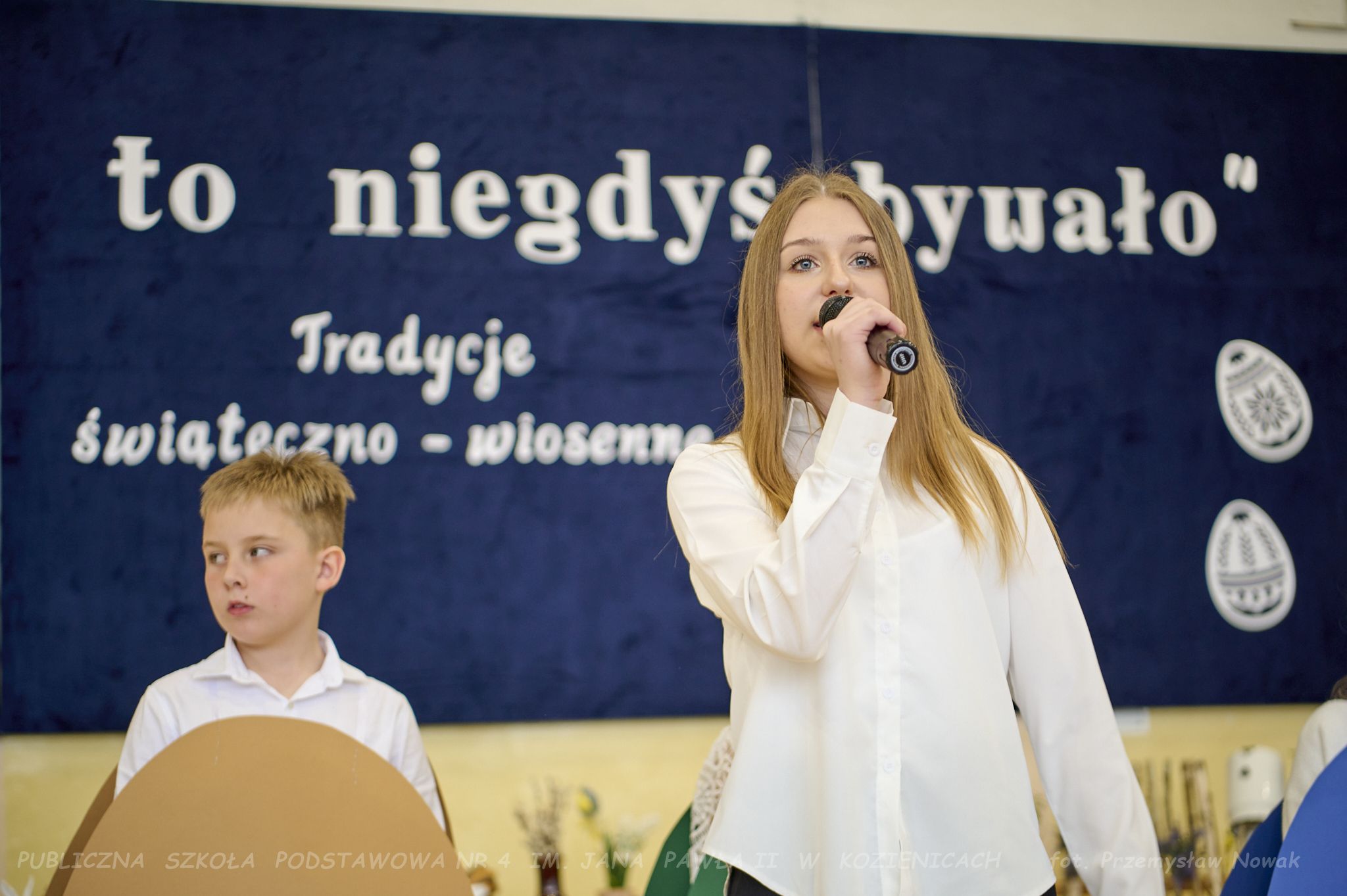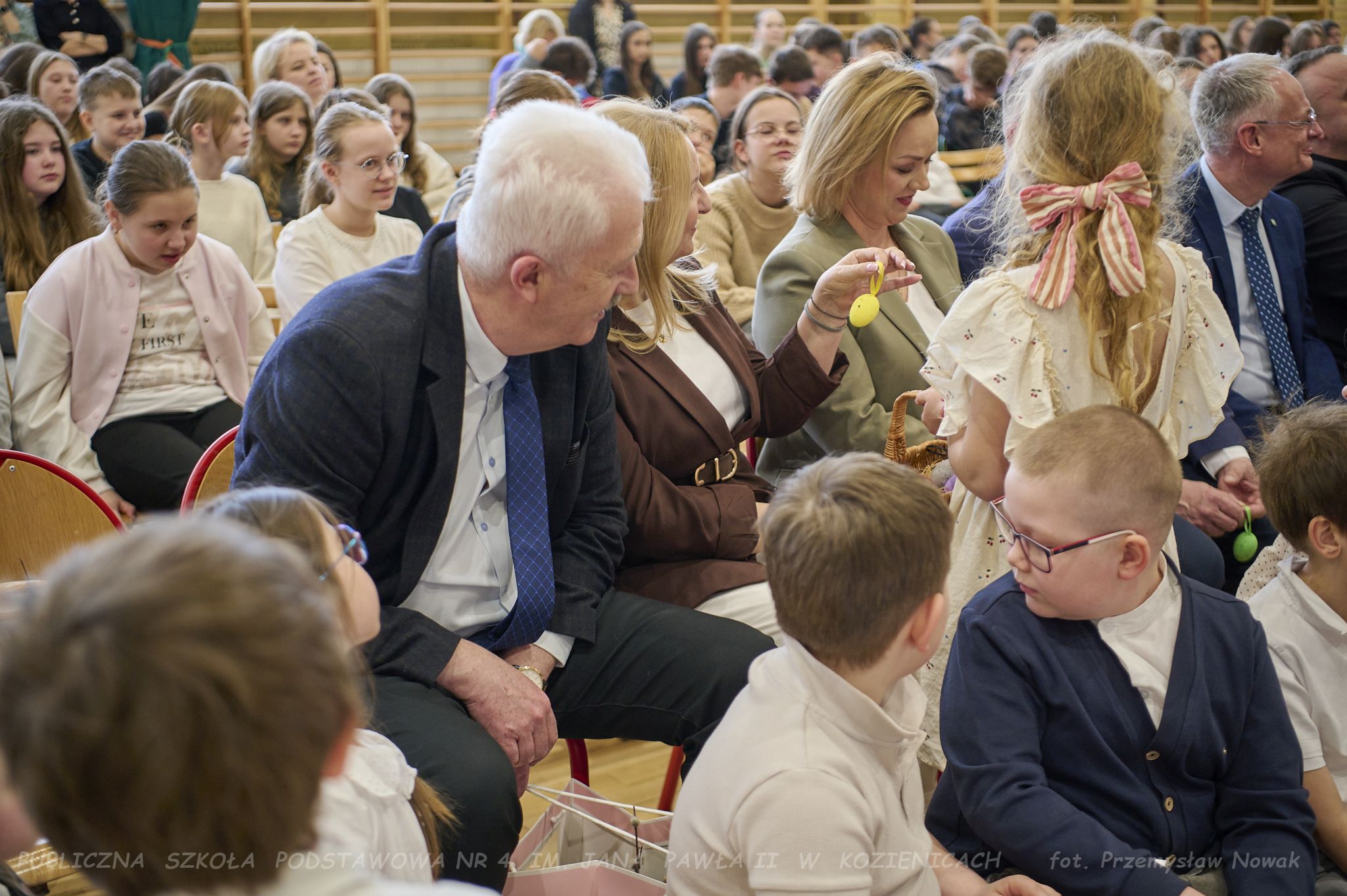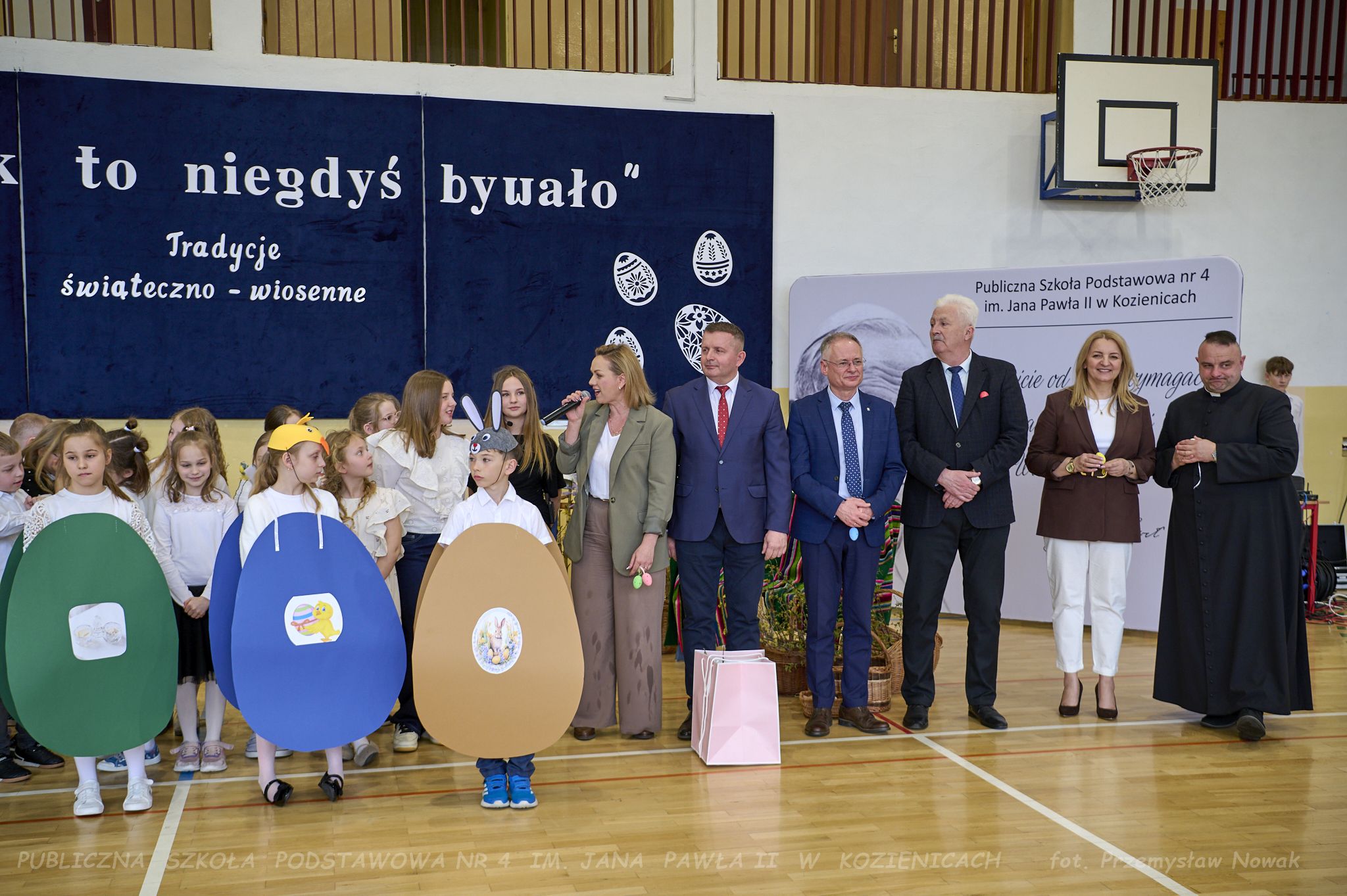 Następnie głos zabrał Dyrektor Szkoły, pan Andrzej Suwała, który podziękował uczniom za przygotowanie występu oraz złożył wszystkim obecnym świąteczne życzenia spokoju, miłości i radości. Również Pan Wiceburmistrz Robert Boryczka podziękował organizatorom i przekazał serdeczne życzenia wielkanocne dla wszystkich zgromadzonych i ich rodzin. Życzenia złożyła też Pani Wicedyrektor Magdalena Prygiel, która życzyła, aby przedstawione przez uczniów tradycje wywołały podczas nadchodzących świąt uśmiech i radość, ale żeby nie przysłaniały prawdziwej ich istoty, jaką jest zwycięstwo dobra nad złem, życia nad śmiercią.