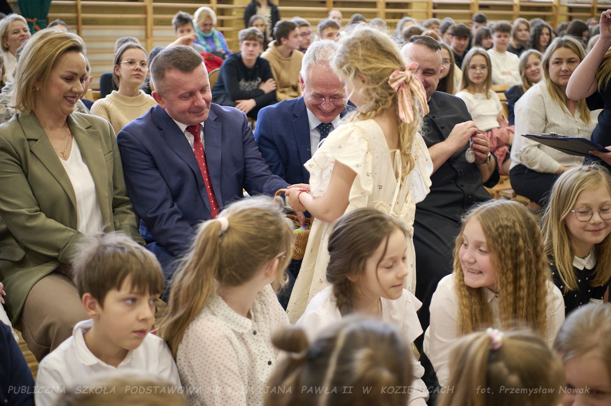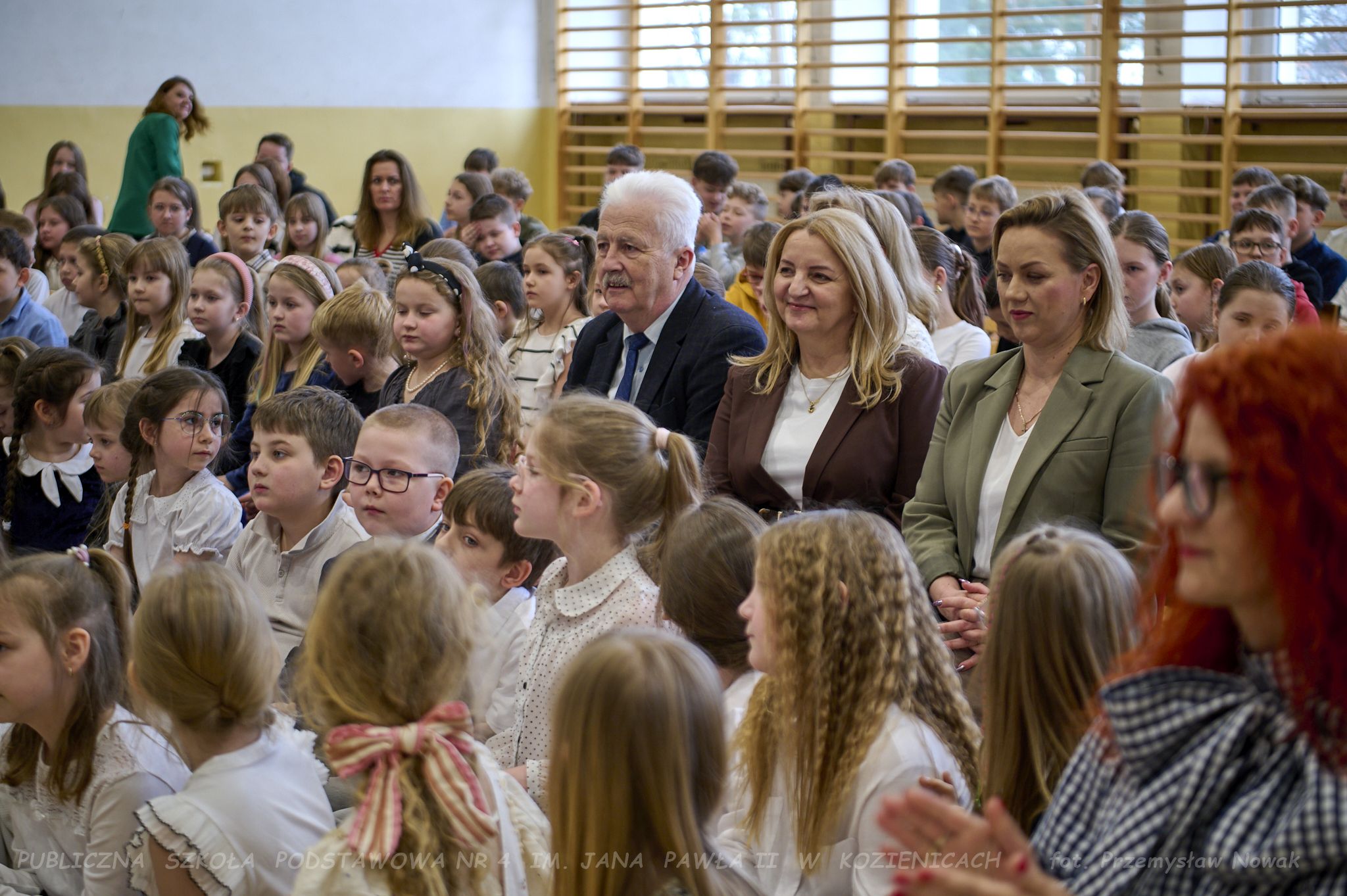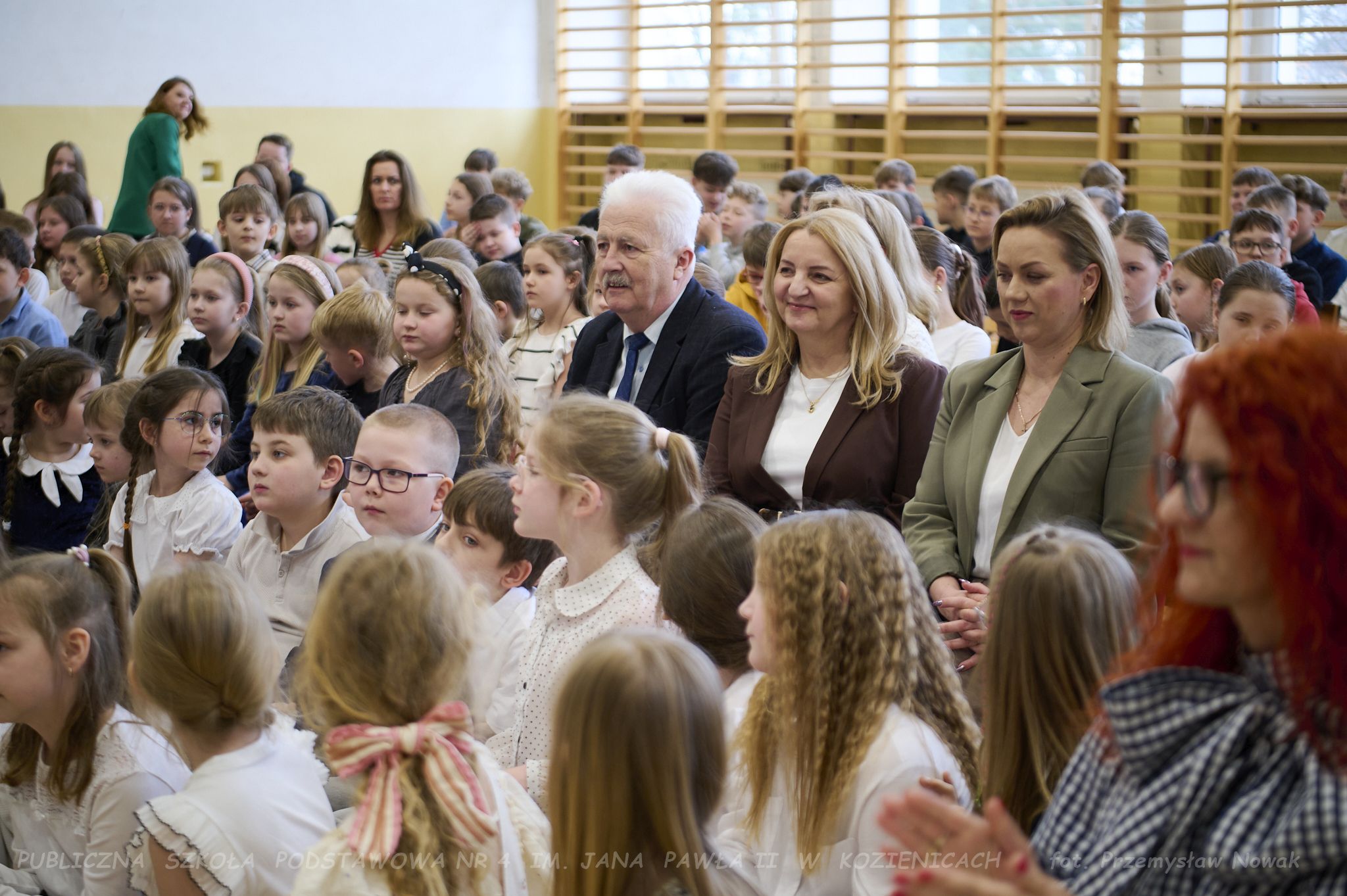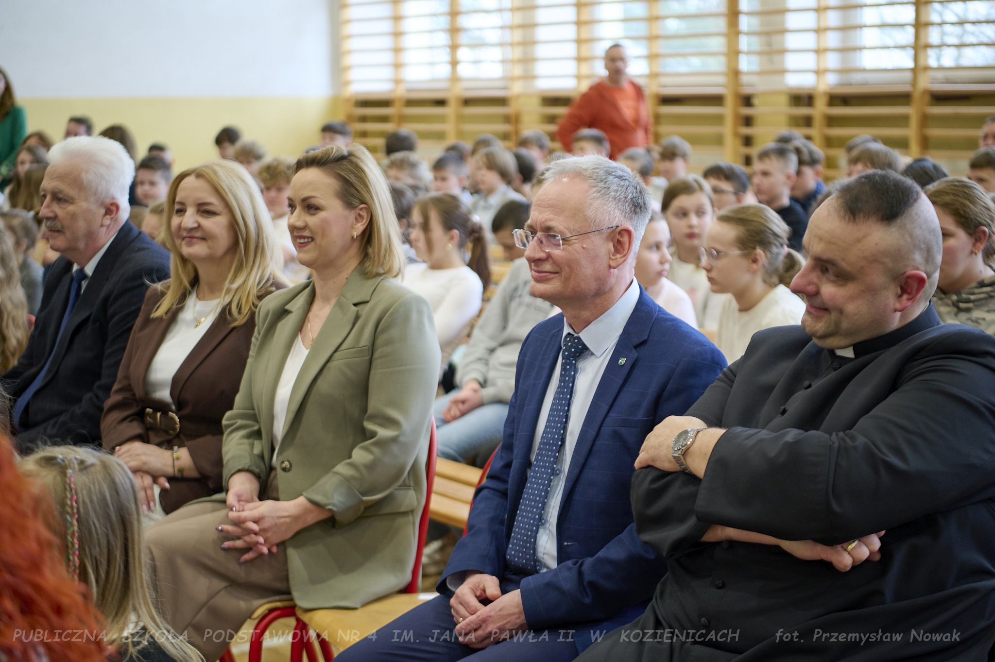W uroczystości uczestniczyła cała społeczność szkolna – Pan Dyrektor Andrzej Suwała, Pani Wicedyrektor Magdalena Prygiel, uczniowie, nauczyciele, pracownicy szkoły, a także rodzice i dziadkowie. Przybyli również zaproszeni goście: Wiceburmistrz Gminy Kozienice ds. Społecznych Pan Robert Boryczka, Dyrektor Wydziału Edukacji Urzędu Miejskiego Pani Małgorzata Wolszczak oraz Przewodniczący Komisji Edukacji, Kultury, Sportu, Turystyki i Promocji Pan Jerzy Wach.