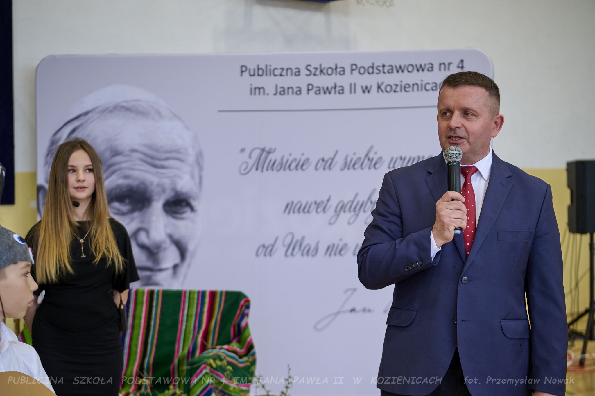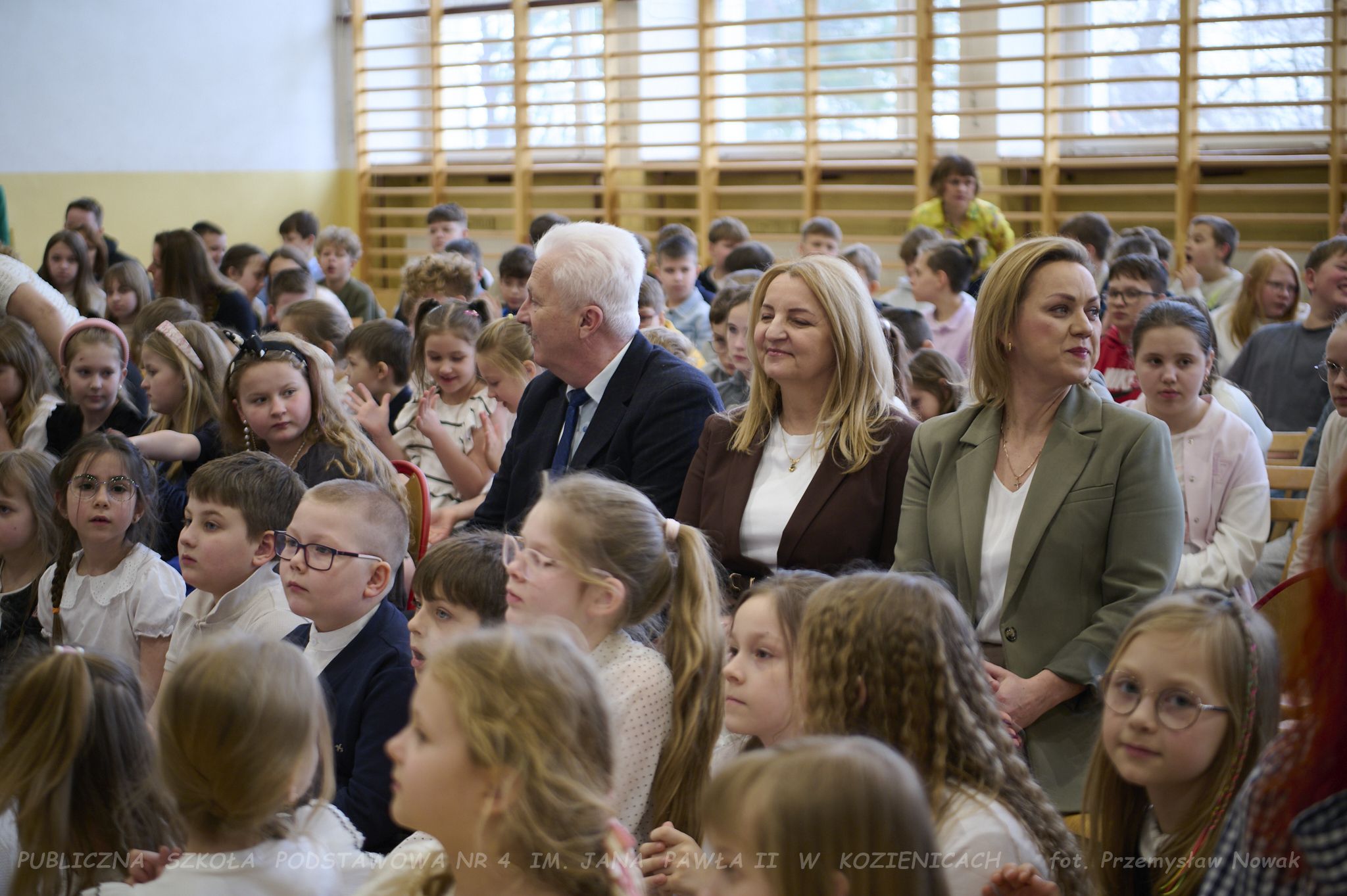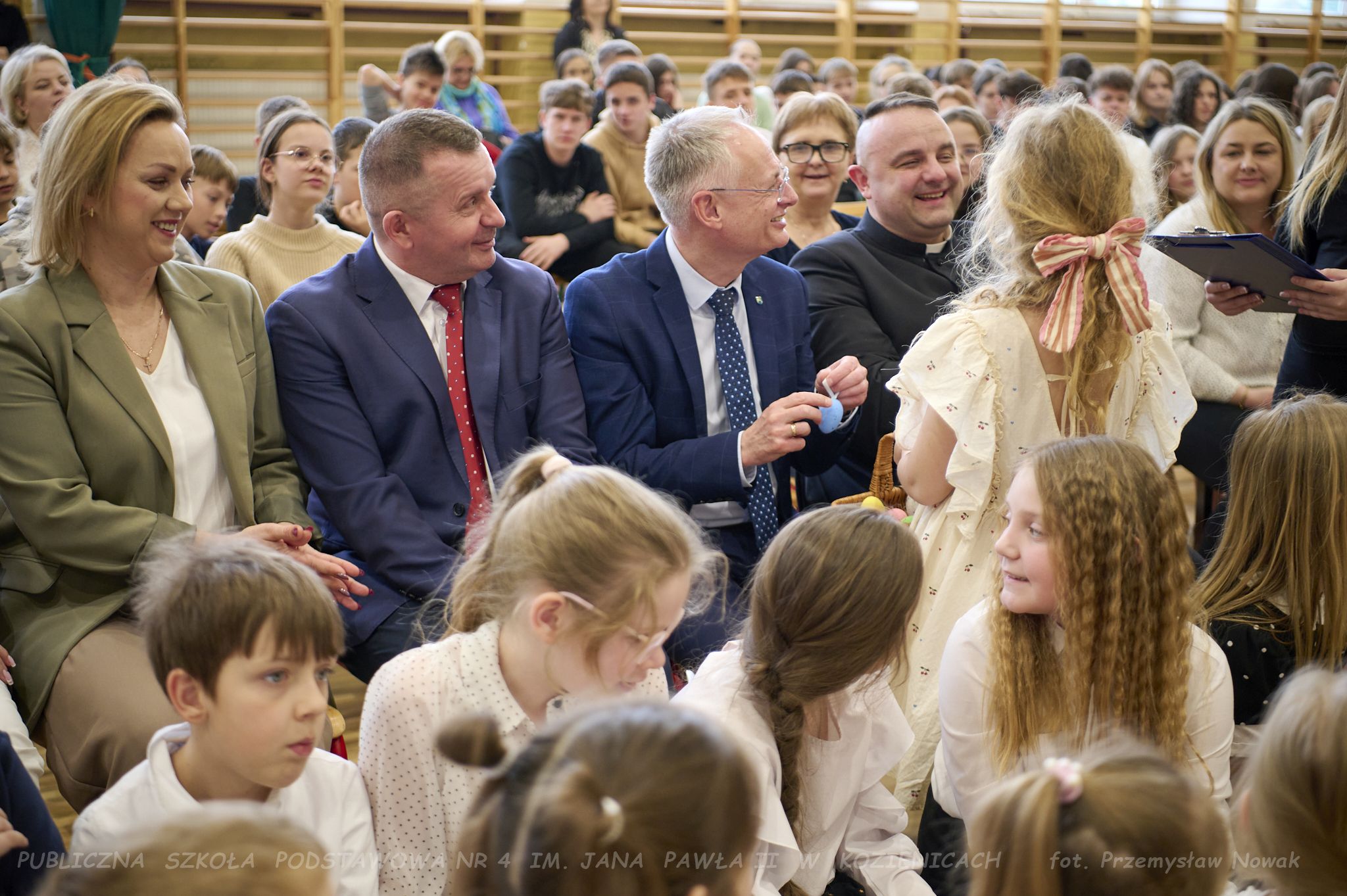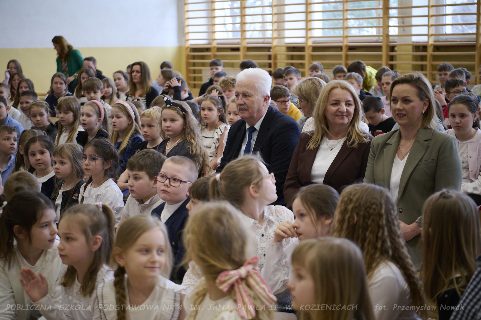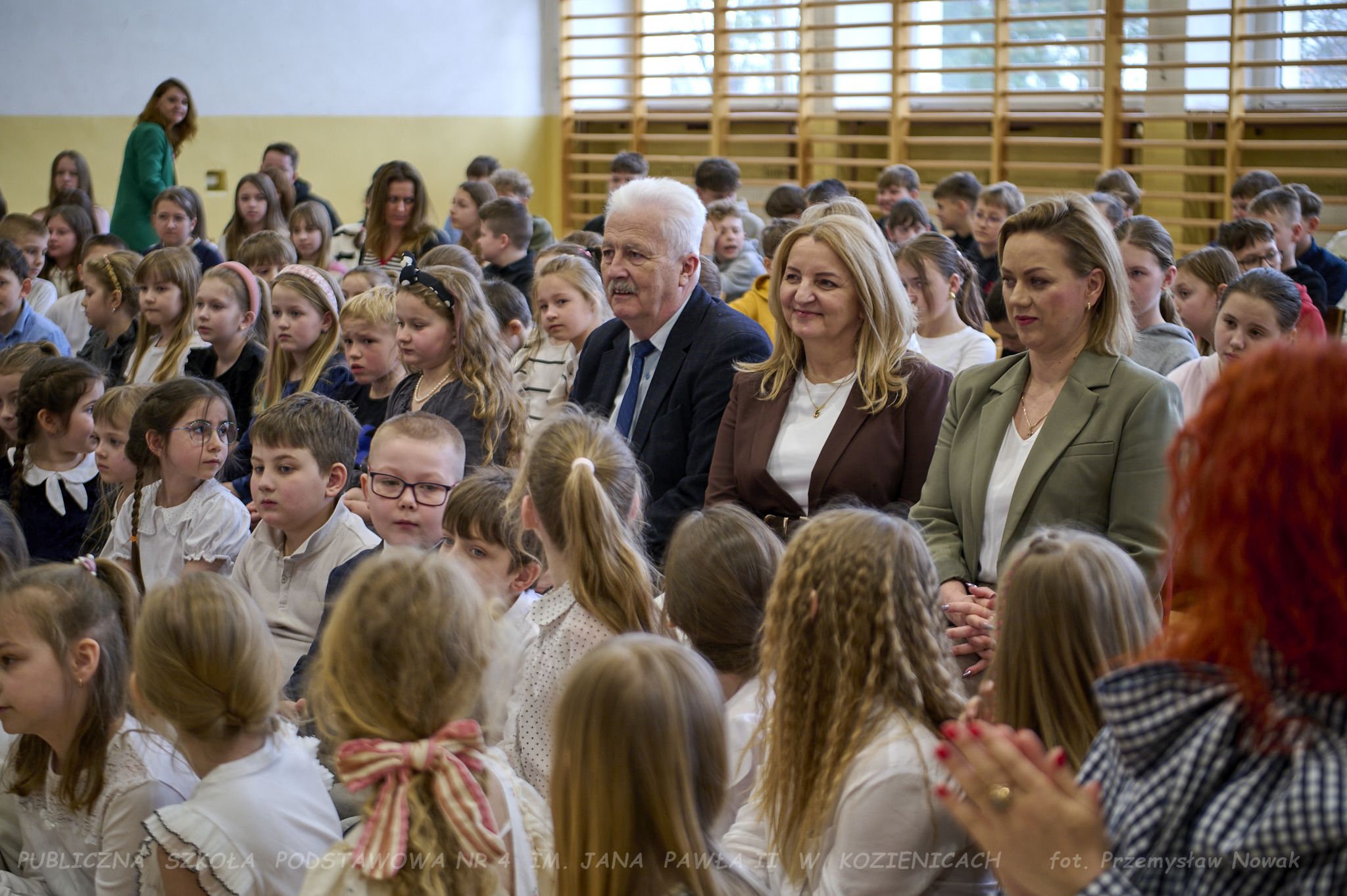 W uroczystości uczestniczyła cała społeczność szkolna – Pan Dyrektor Andrzej Suwała, Pani Wicedyrektor Magdalena Prygiel, uczniowie, nauczyciele, pracownicy szkoły, a także rodzice i dziadkowie. Przybyli również zaproszeni goście: Wiceburmistrz Gminy Kozienice ds. Społecznych Pan Robert Boryczka, Dyrektor Wydziału Edukacji Urzędu Miejskiego Pani Małgorzata Wolszczak oraz Przewodniczący Komisji Edukacji, Kultury, Sportu, Turystyki i Promocji Pan Jerzy Wach.