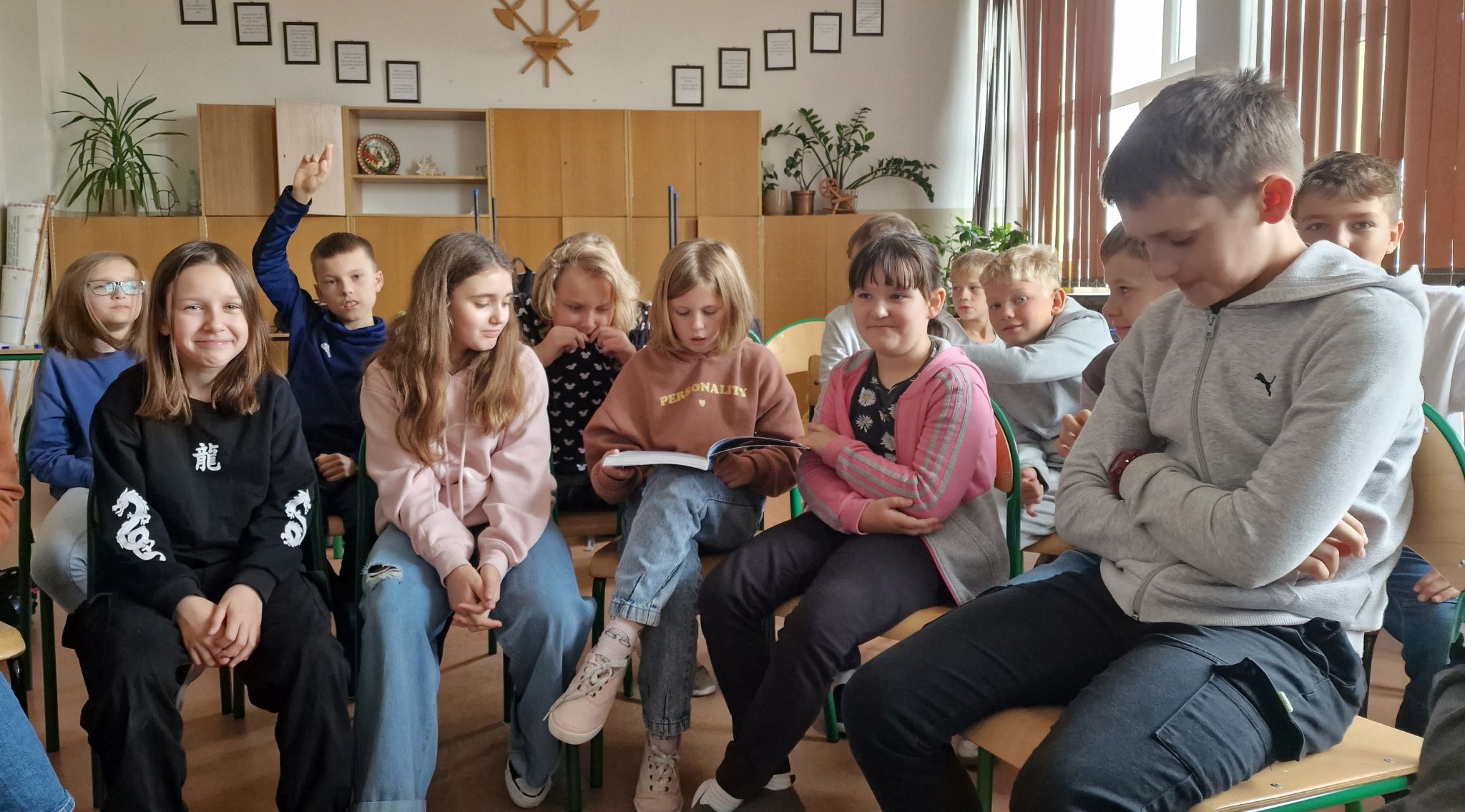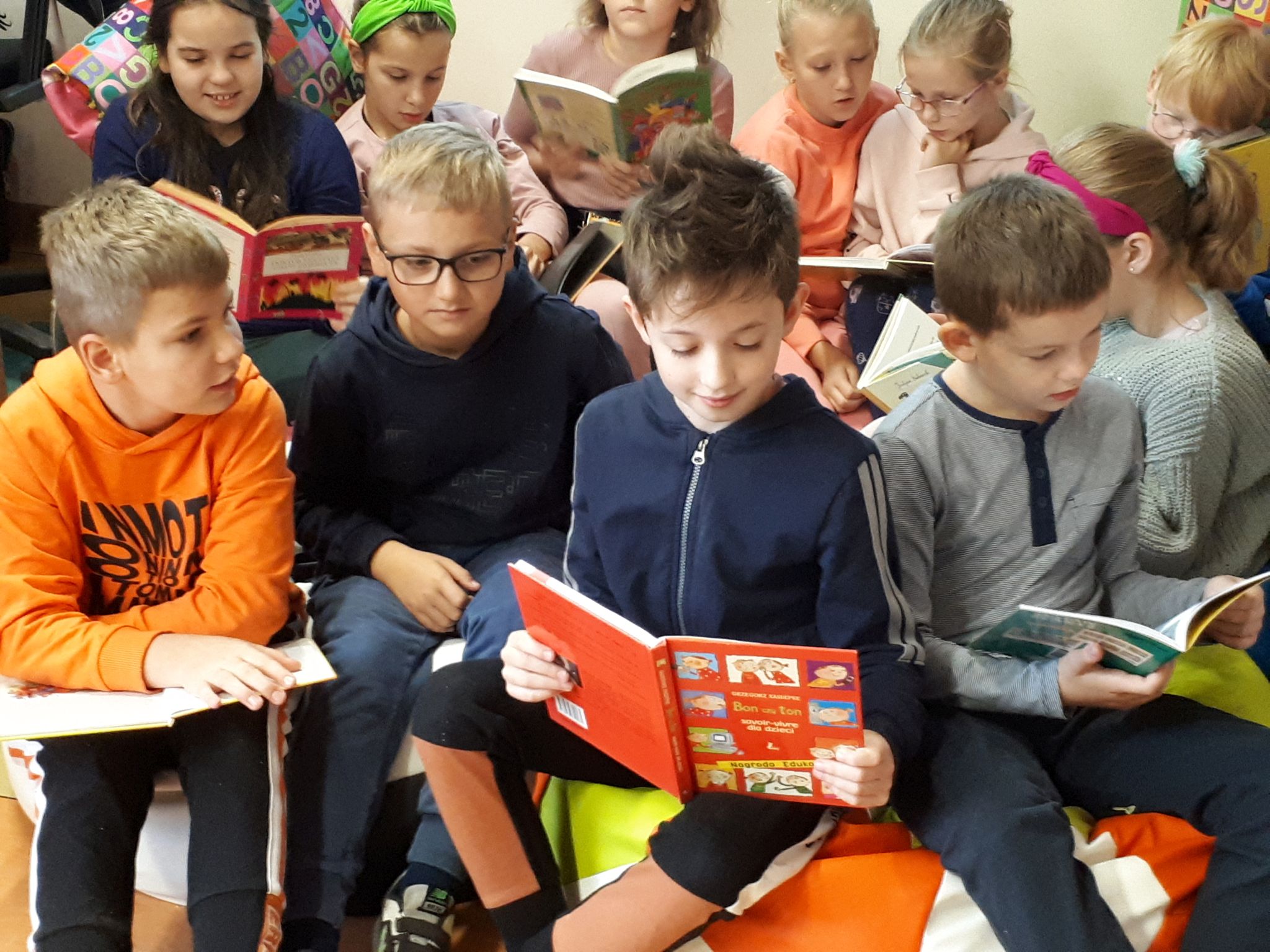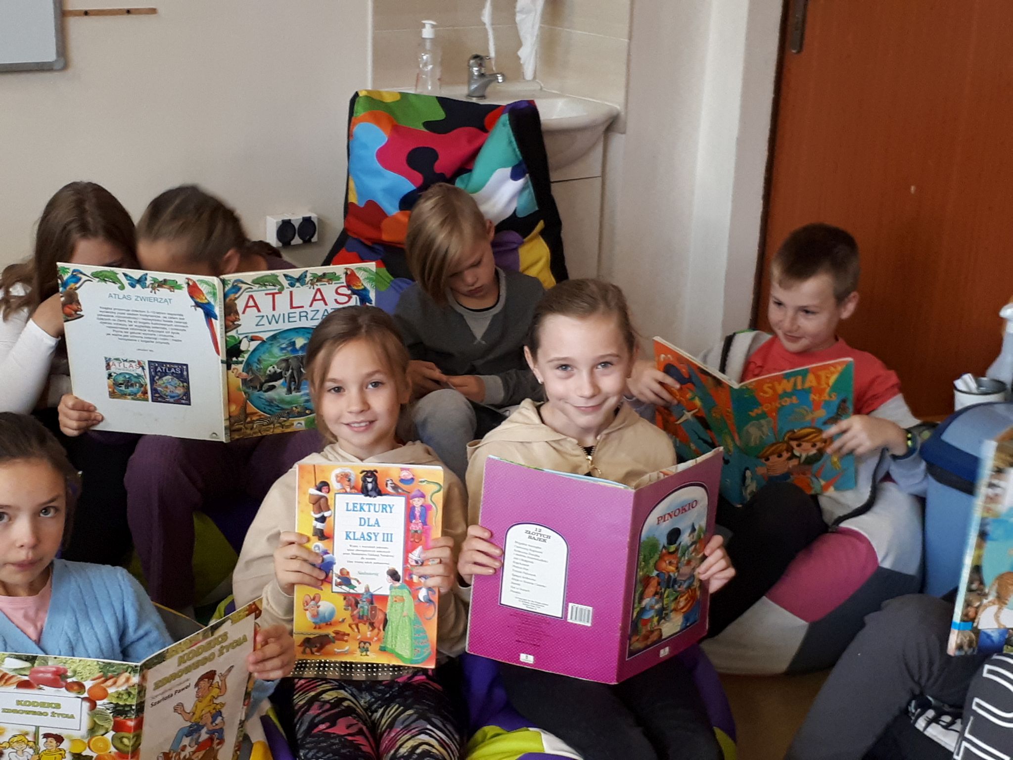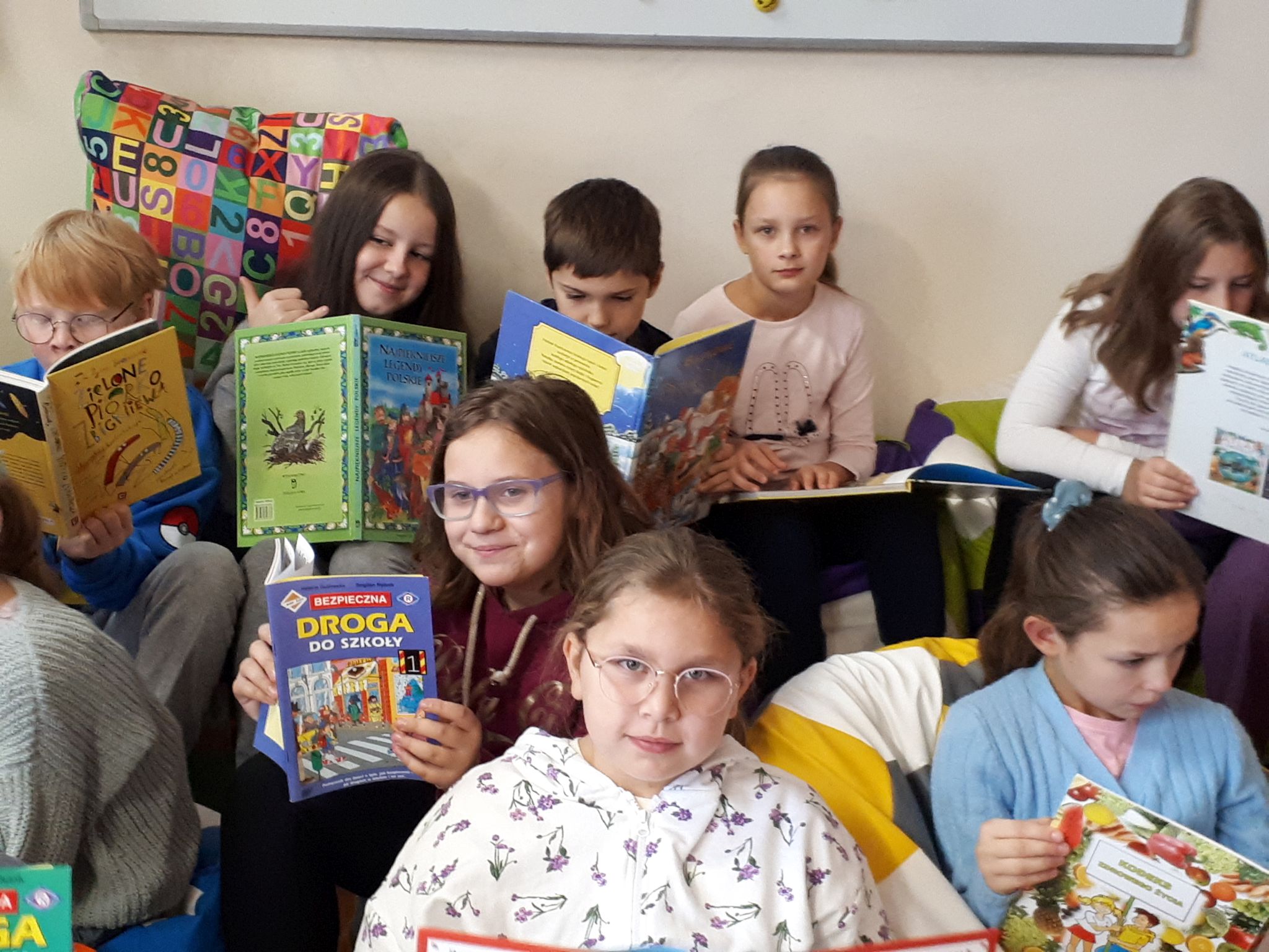 W klasie 2a zaproszony rodzic interpretował drugą część najnowszej książki Waldemara Cichonia „Jeśli się zgadzasz, zaszczekaj dwukrotnie !”. Polecamy tę książkę młodszym dzieciom. Fragmenty ulubionej literatury przedstawili uczniowie klasy 3 c. Natomiast z biografią Roberta Lewandowskiego zapoznawali się uczniowie klasy 4a. Klasa 5a zaciekawiła się literaturą klasyczną „Ania z Zielonego Wzgórza” Lucy Montgomery, a 5b zgłębiała fantastyczne przygody w książce „Srebrny chłopiec” Kristina Ohlssona.