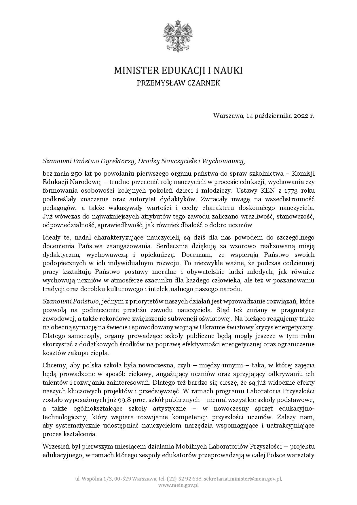 List Ministra Edukacji i Nauki z okazji Dnia Edukacji Narodowej przez admin · 14 października 2022 Do pobrania: List Ministra Edukacji Narodowej – > pobierz