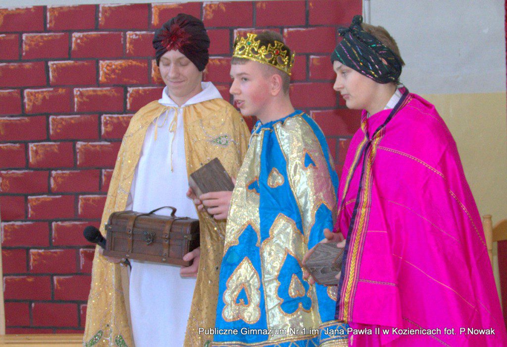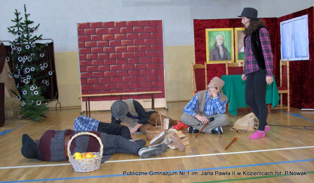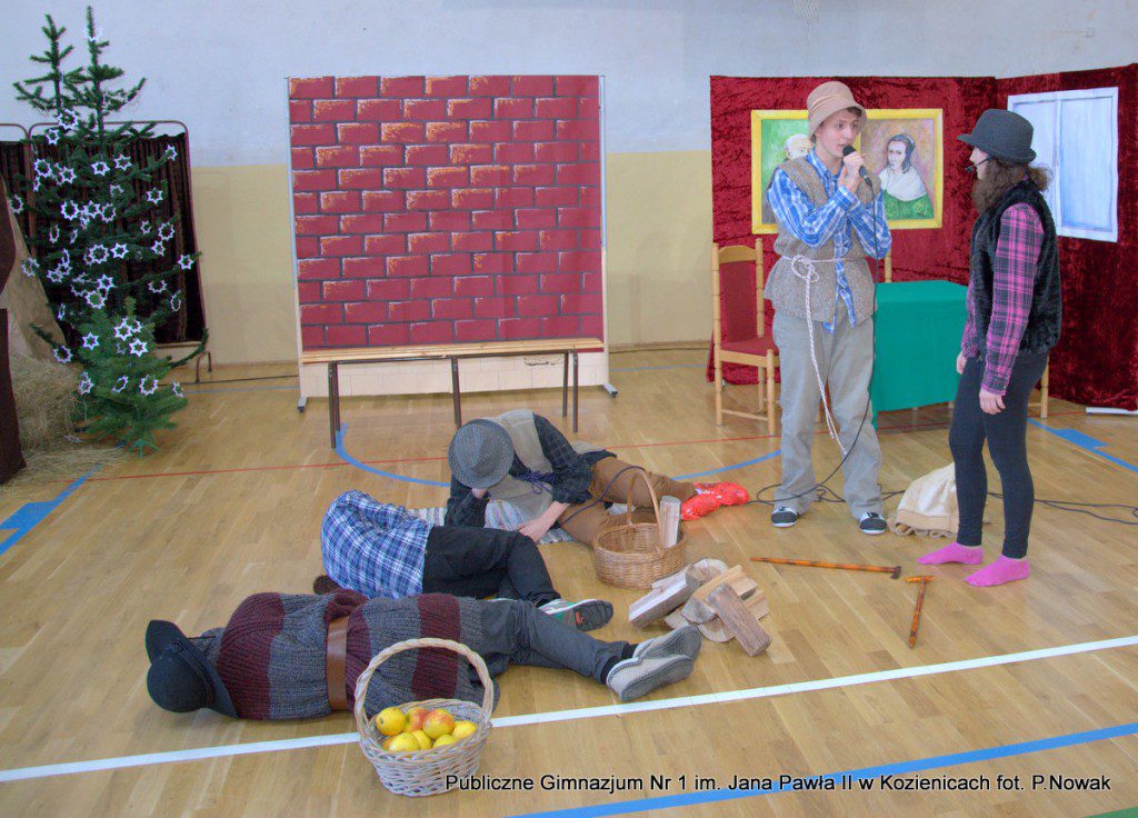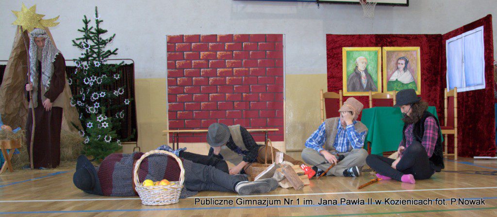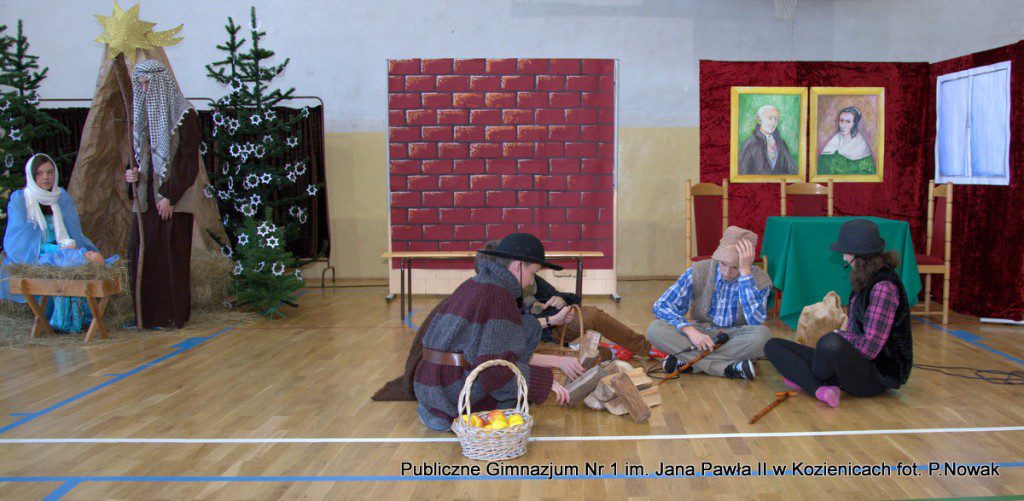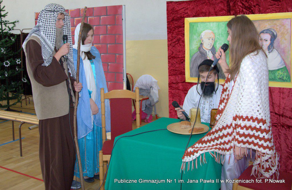 Młodzi aktorzy biorący udział w spektaklu wcielali się w wybrane role: prowadząca Natalia Kłos 2a, żona- Wiktoria Banaś 3a, mąż- Marcin Nowak 3d, Marta- Daria Domagała 3a, mama- Aleksandra Rybakowska 2a, tata- Marcin Świątkowski 2a, Ania- Anna Turek 3a, diabeł- Karol Fikus 3a, dziewczna1- Ada Wielgomas 3d, dziewczyna 2- Klaudia Hałdaś 3d, śpiewające pięknie anioły: Patrycja Wołos 3e i Ada Jaros 2a, archanioł- Aleksandra Bartosiewicz 2b, Maryja- Anita Baryłka 3a, Józef- Paweł Mironiak 3a, gospodarz- Jakub Kęska 2b, gospodyni- Paulina Warmiak 2b, pasterze: Patryk Sochaj 3b, Bartek Marszałek 2a, Filip Michalski 2a, Karolina Chałas 2b i Grzegorz Maciejewski 2b, królowie: Piotr Matejko 2b, Krystian Jasek 2d i Marcel Kuśmierczyk 2d. Nieśli oni przesłanie, by mówić o tym, co jest dla nas ważne, by okazywać uczucia najbliższym, pokazali, że warto się pojednać i być szczęśliwym człowiekiem, do którego przybyło Dzieciątko Boże: