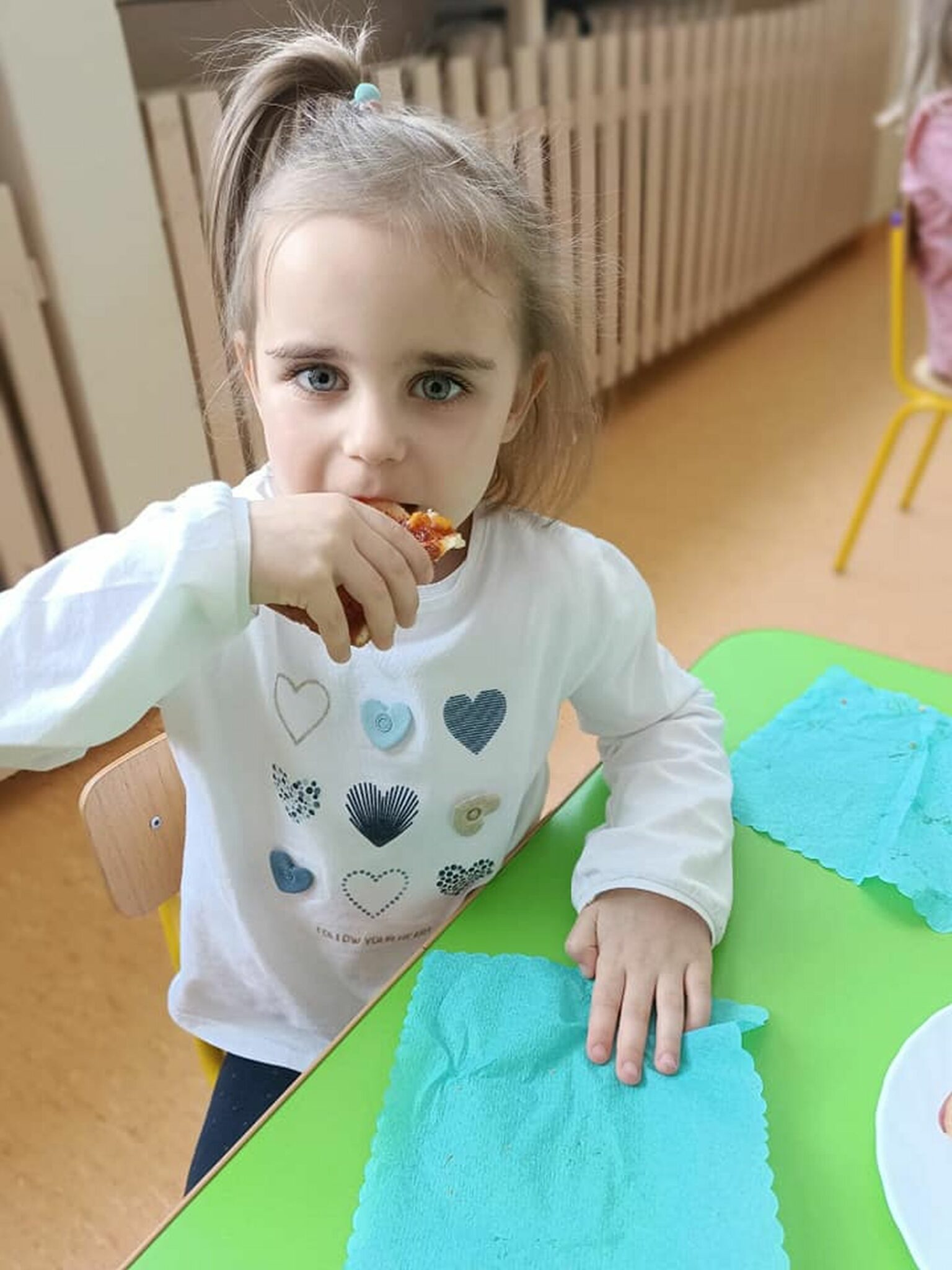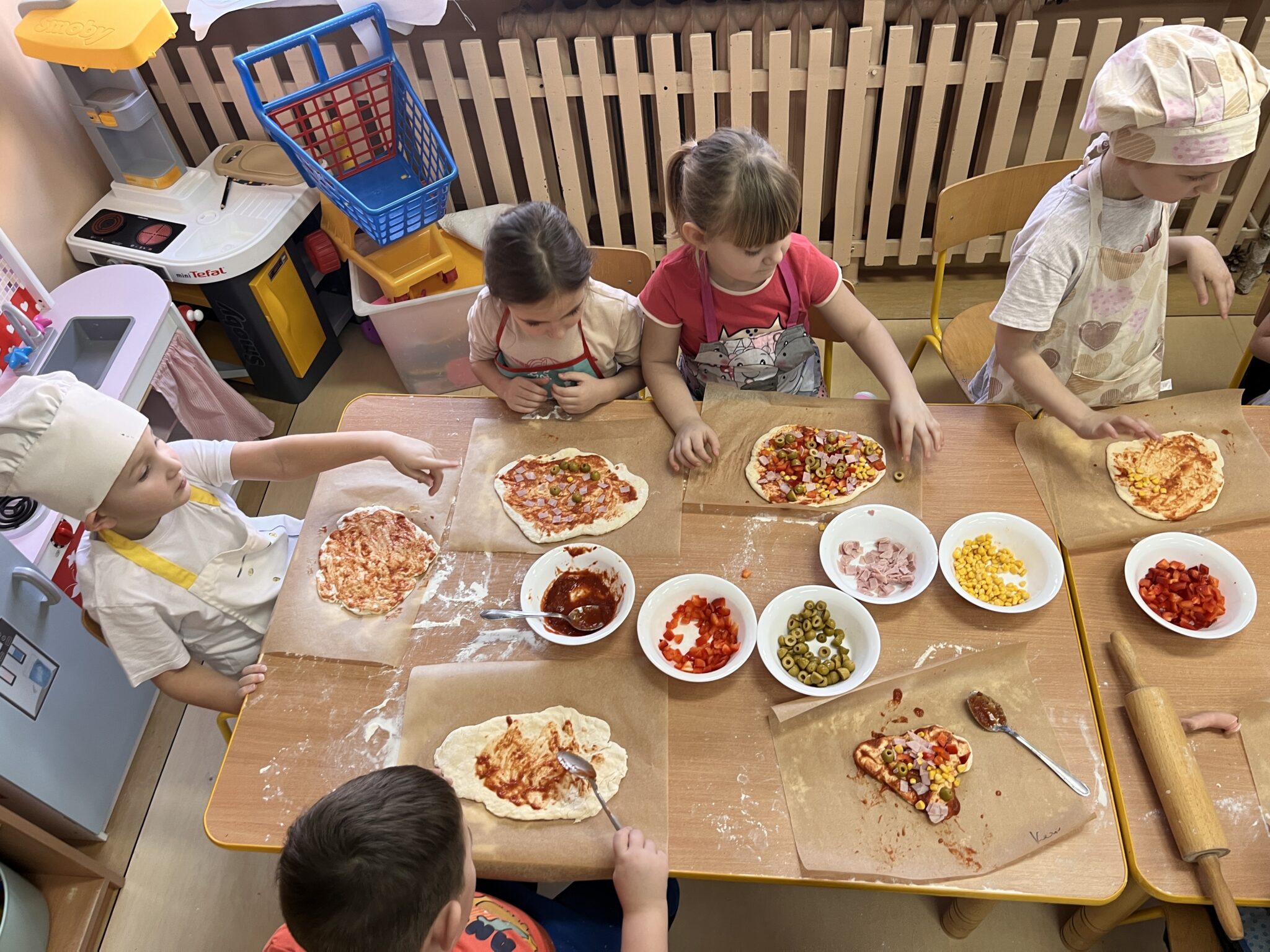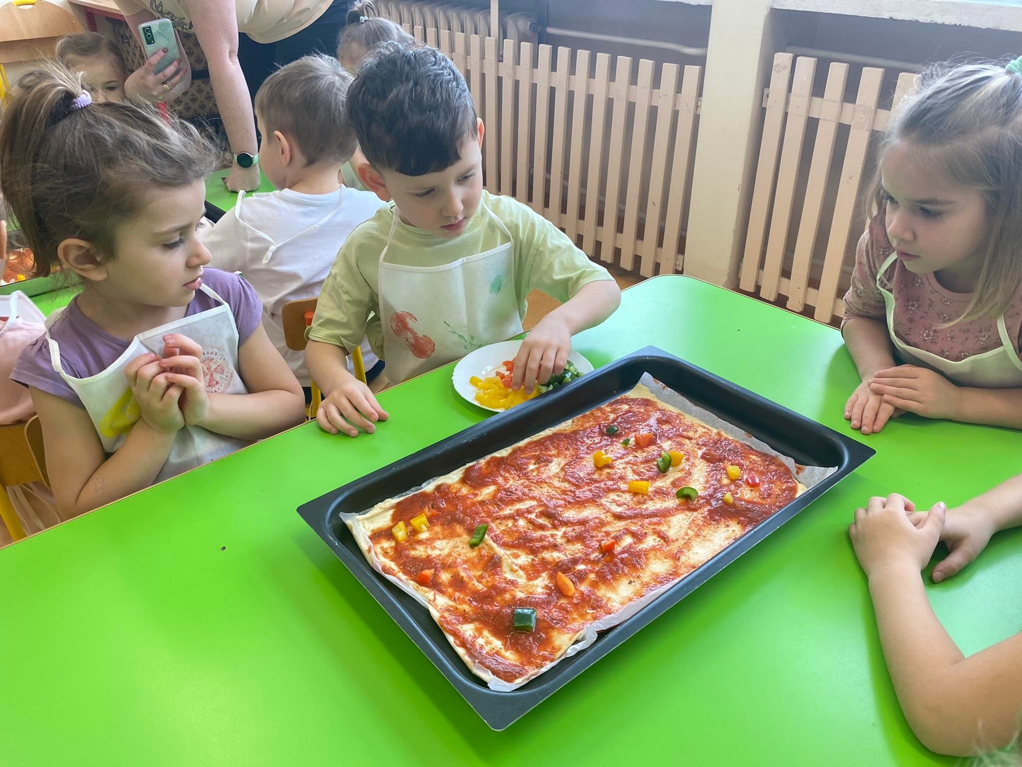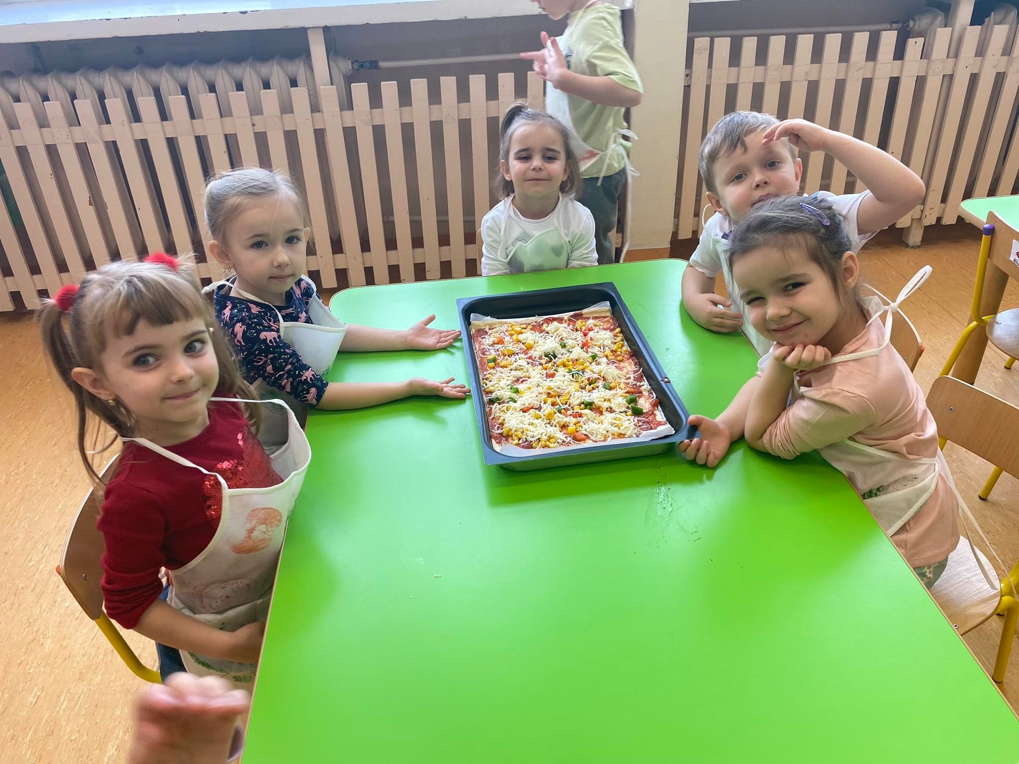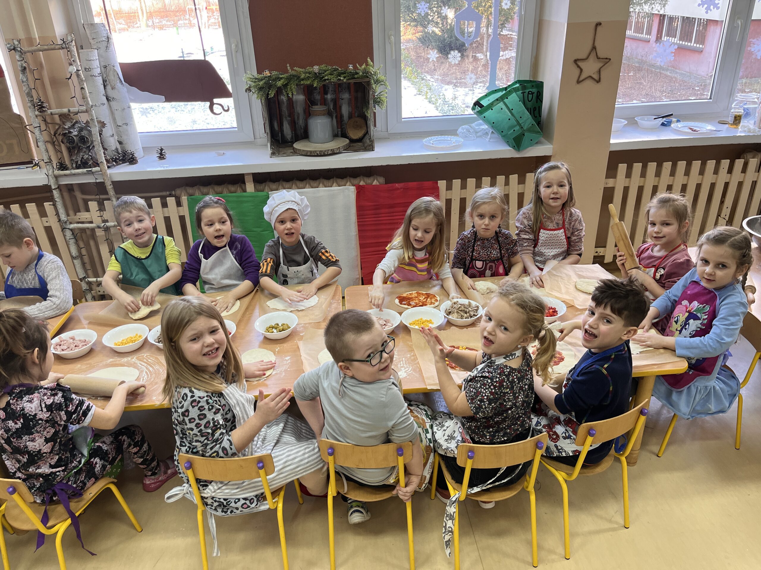 się bawiły, poszukiwały produktów koniecznych do zrobienia pizzy, dzieliły je na sylaby oraz odkrywały, te których nie znały. Jednak najważniejszą częścią było samodzielne zrobienie przez dzieci pizzy, a następnie jej konsumpcja. Przedszkolne sale zamieniły się na ten czas we włoskie restauracje, a dzieci doświadczyły w ten sposób stymulacji wszystkich zmysłów. Było pysznie!