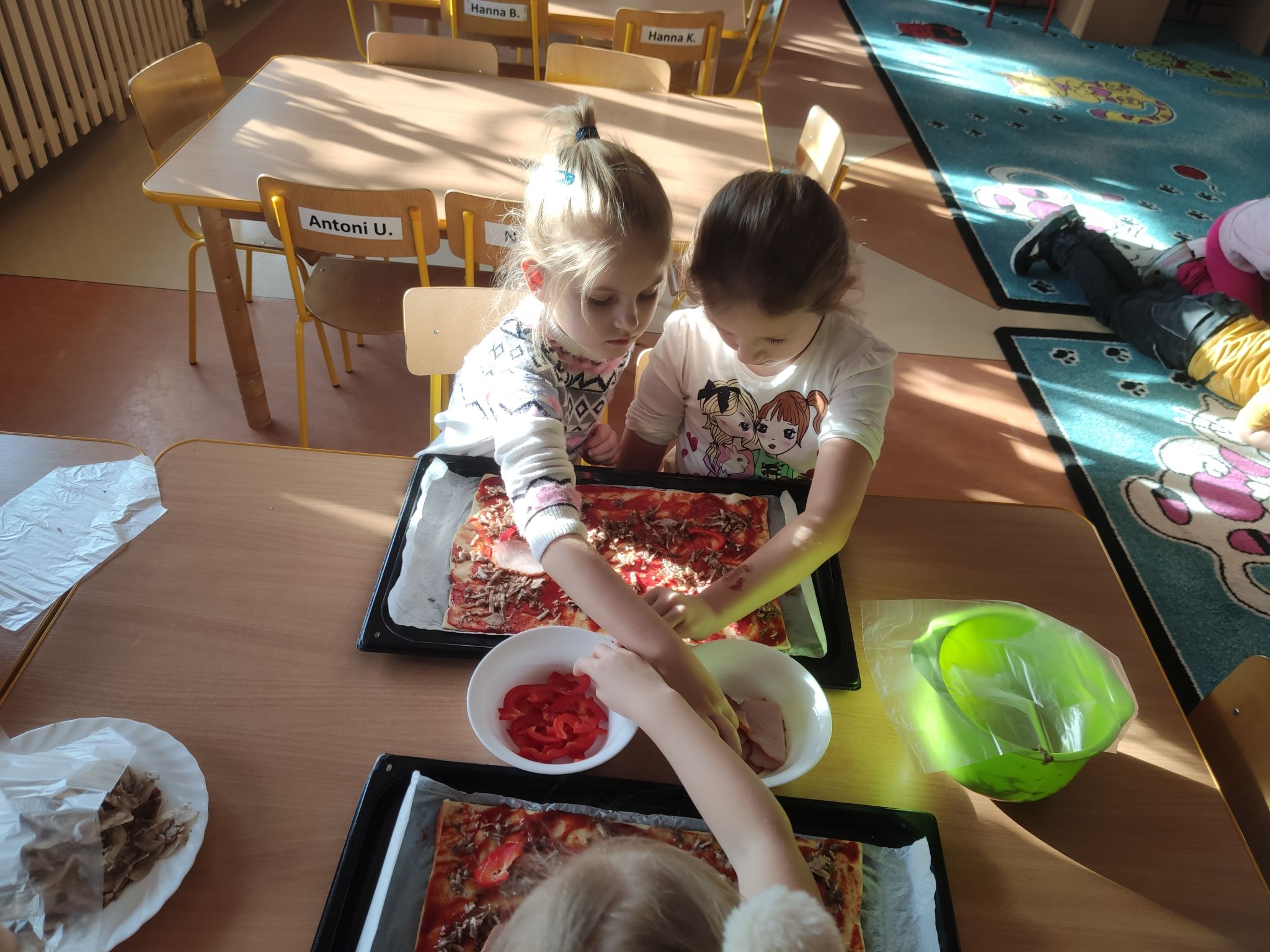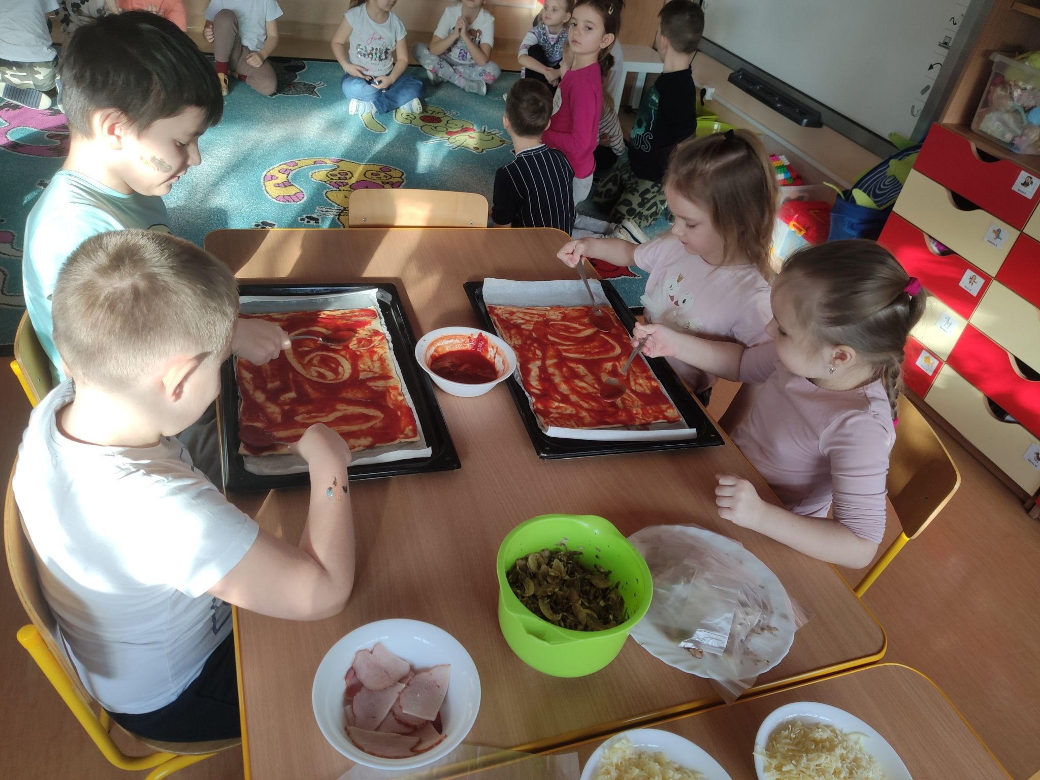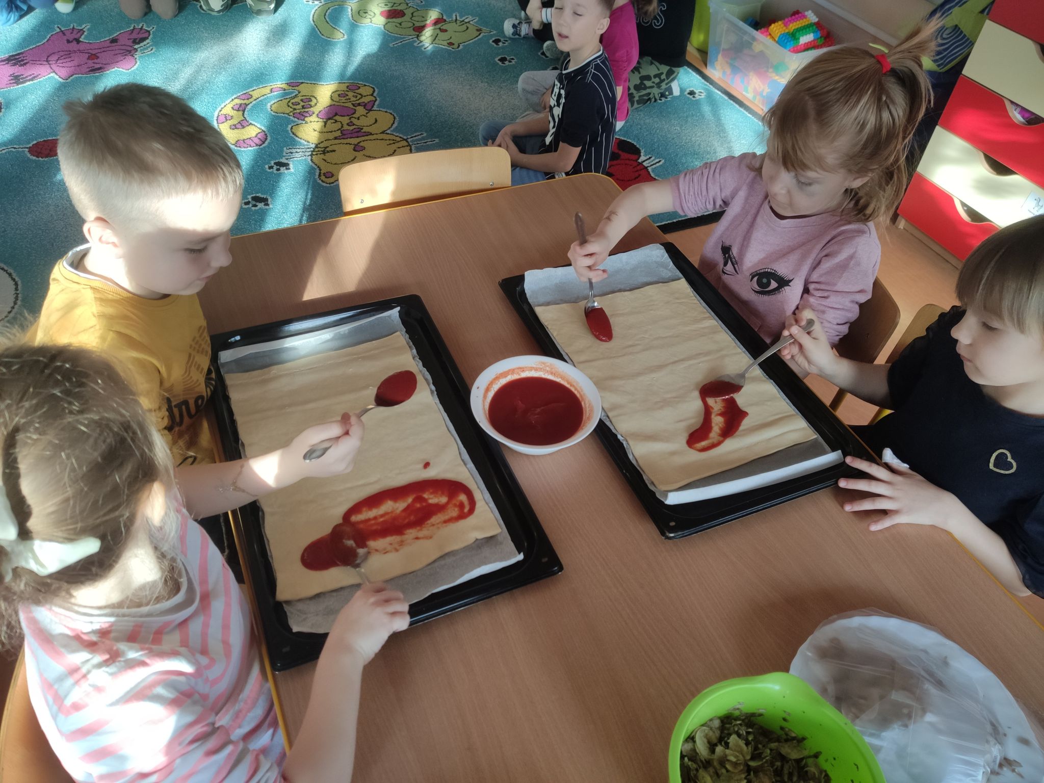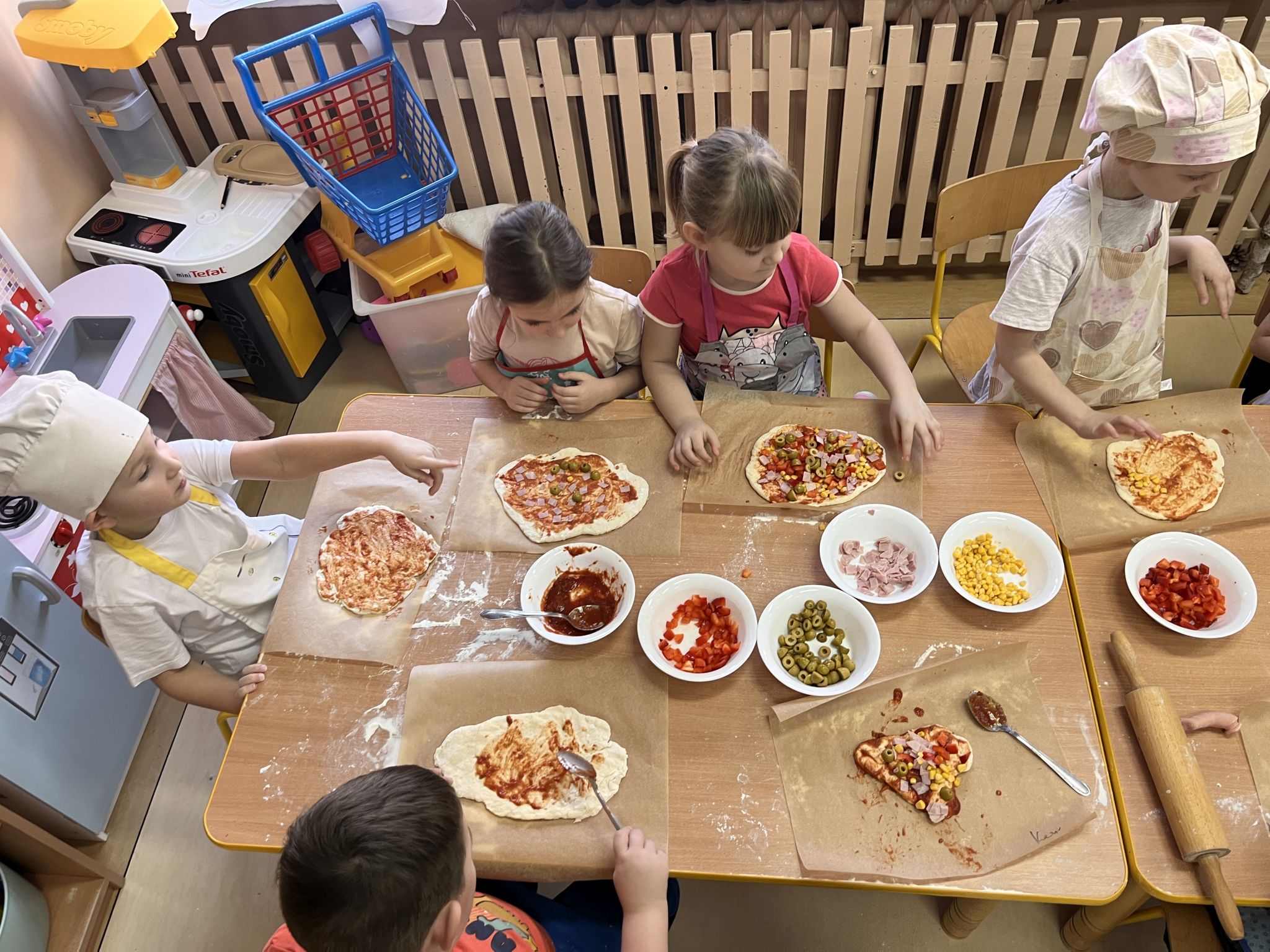 się bawiły, poszukiwały produktów koniecznych do zrobienia pizzy, dzieliły je na sylaby oraz odkrywały, te których nie znały. Jednak najważniejszą częścią było samodzielne zrobienie przez dzieci pizzy, a następnie jej konsumpcja. Przedszkolne sale zamieniły się na ten czas we włoskie restauracje, a dzieci doświadczyły w ten sposób stymulacji wszystkich zmysłów. Było pysznie!