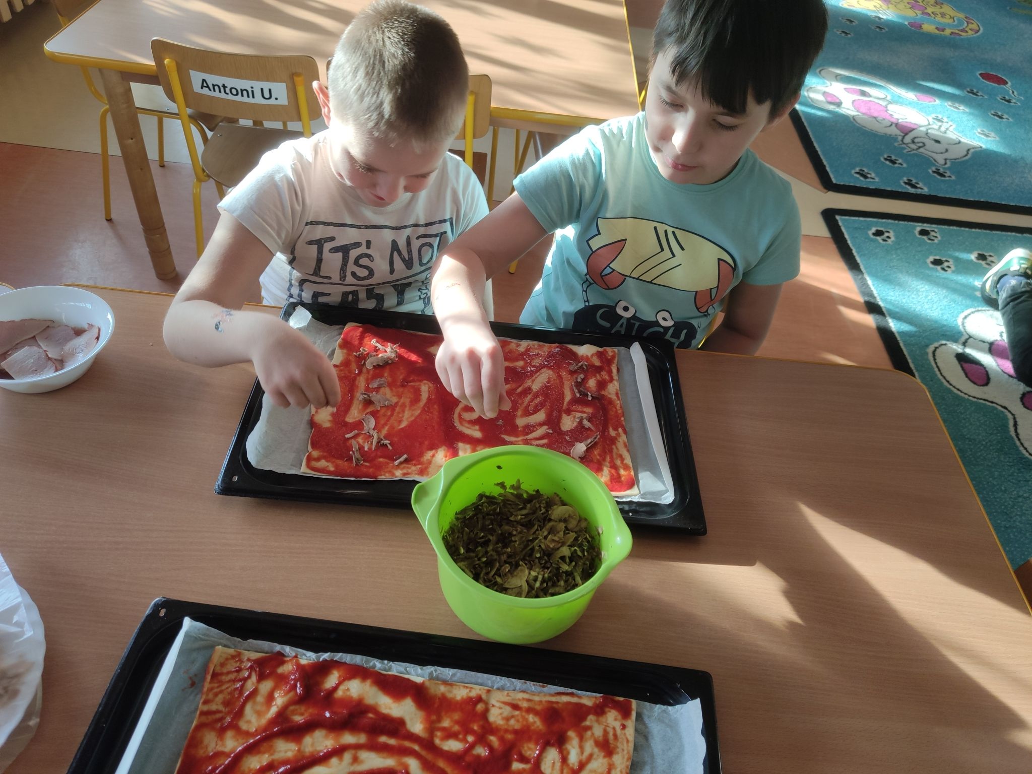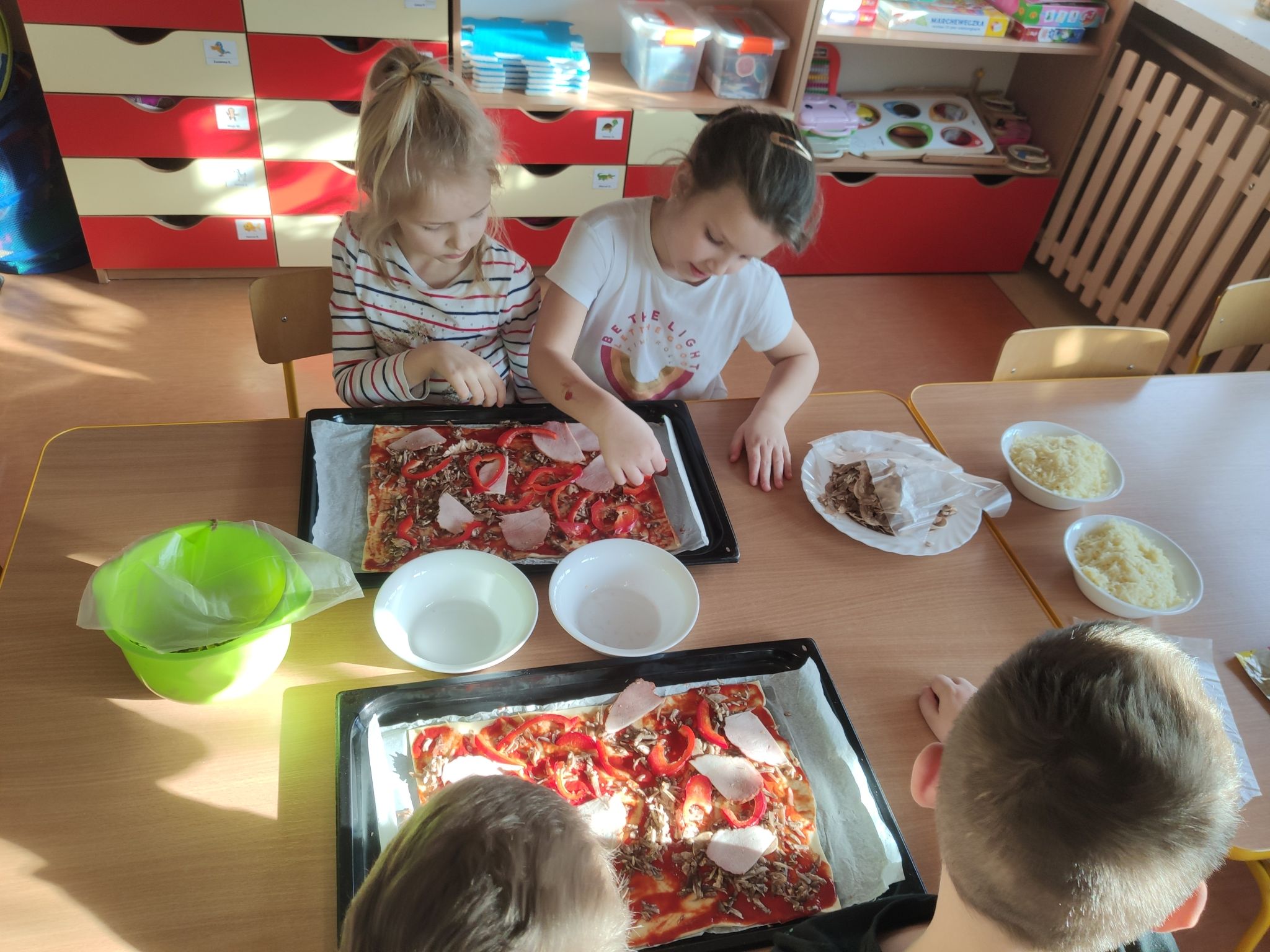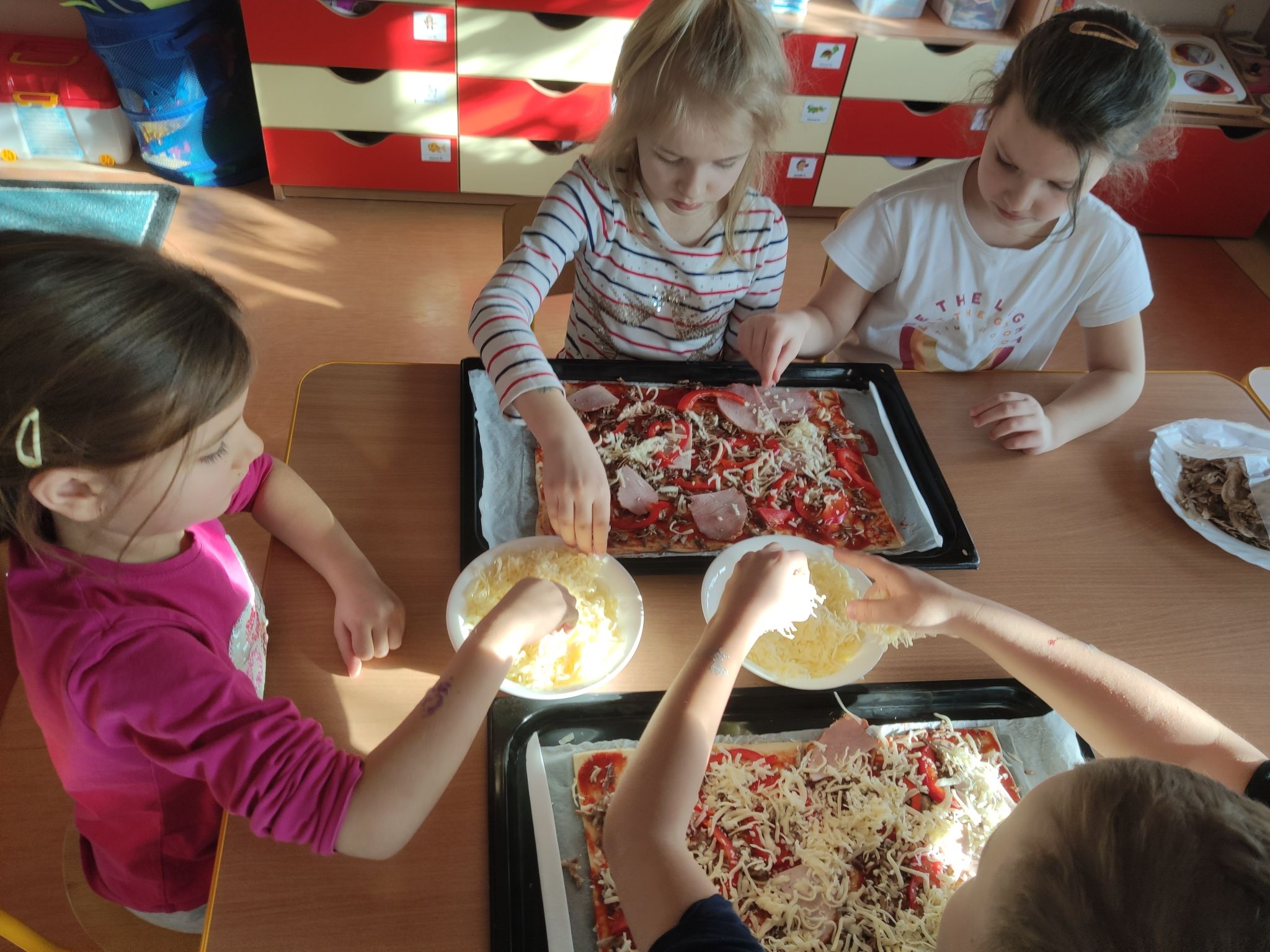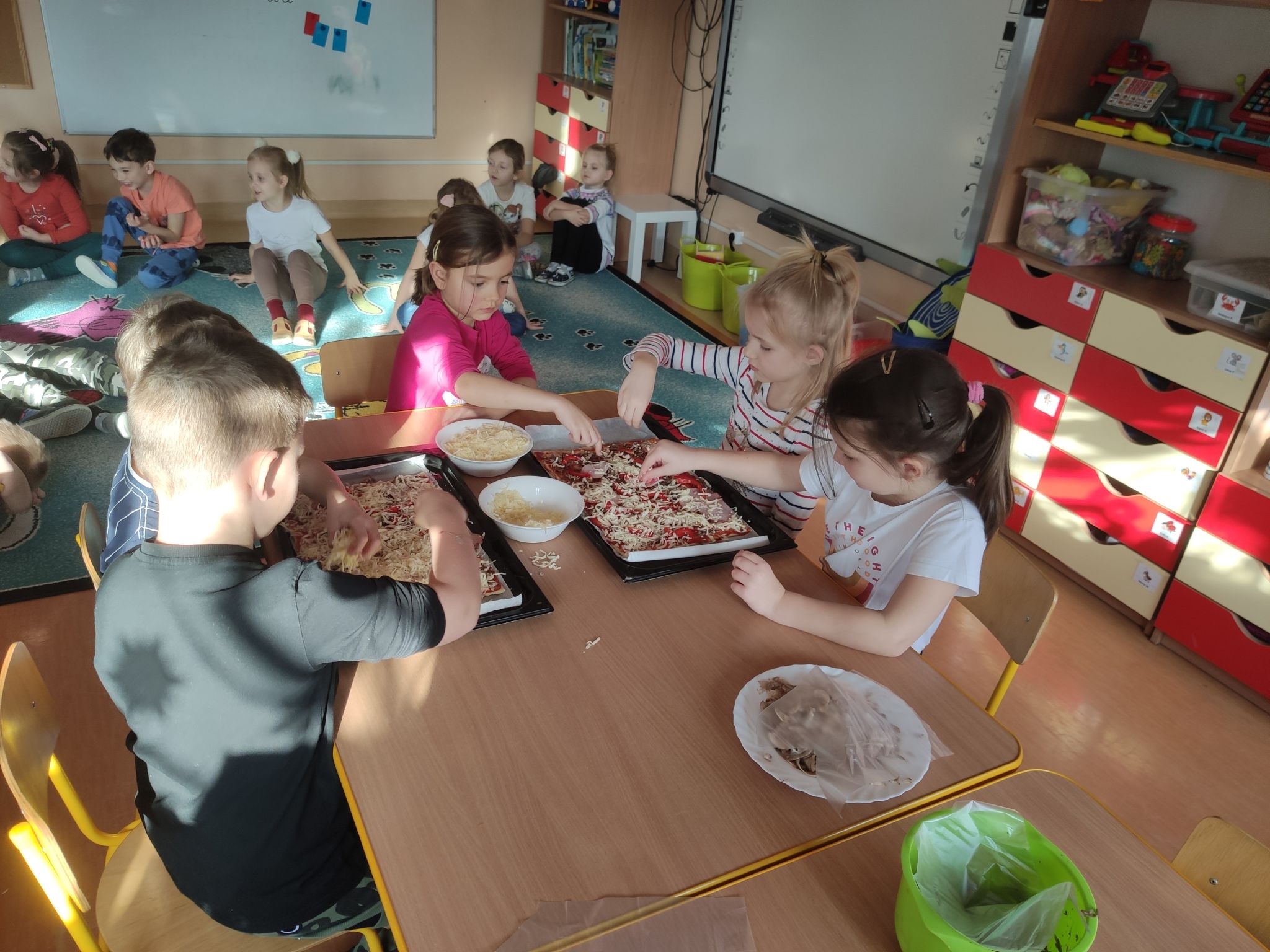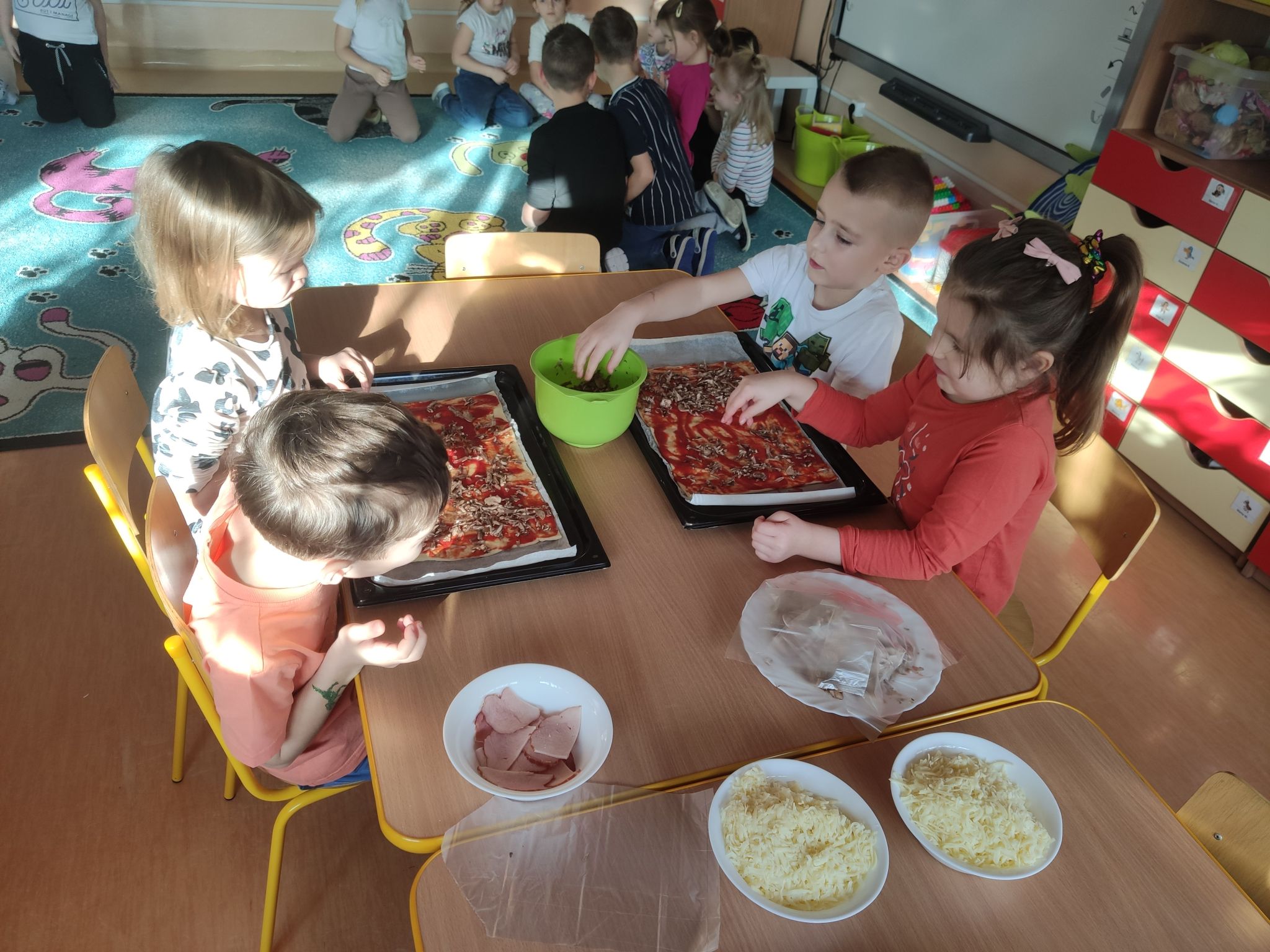 się bawiły, poszukiwały produktów koniecznych do zrobienia pizzy, dzieliły je na sylaby oraz odkrywały, te których nie znały. Jednak najważniejszą częścią było samodzielne zrobienie przez dzieci pizzy, a następnie jej konsumpcja. Przedszkolne sale zamieniły się na ten czas we włoskie restauracje, a dzieci doświadczyły w ten sposób stymulacji wszystkich zmysłów. Było pysznie!