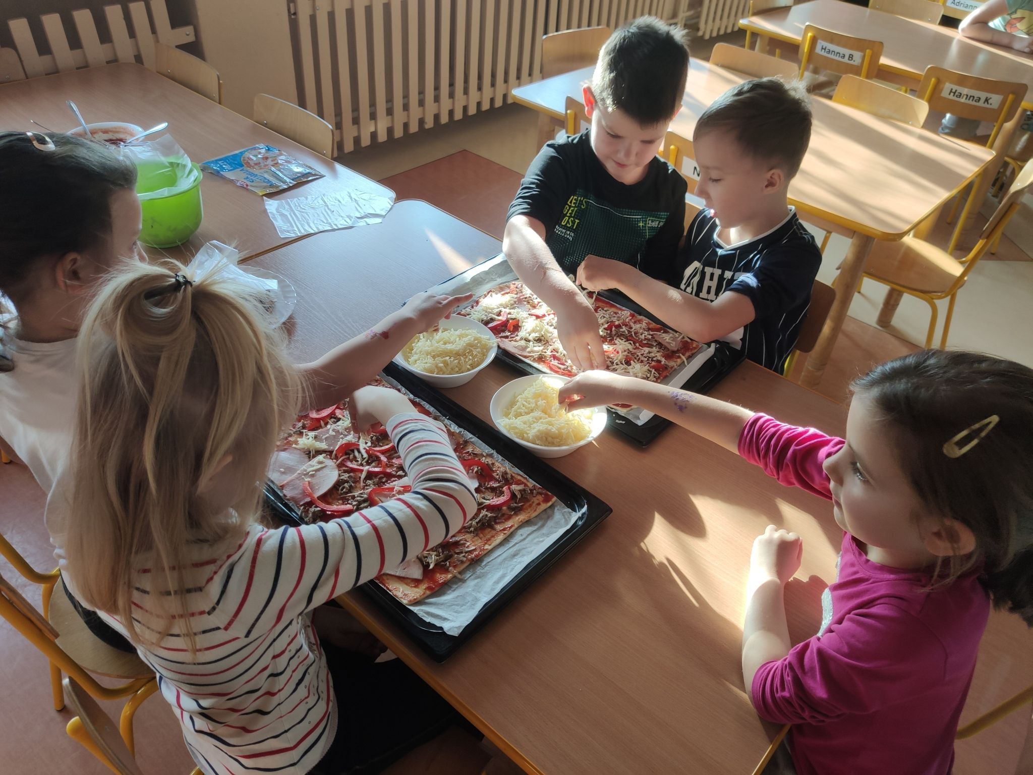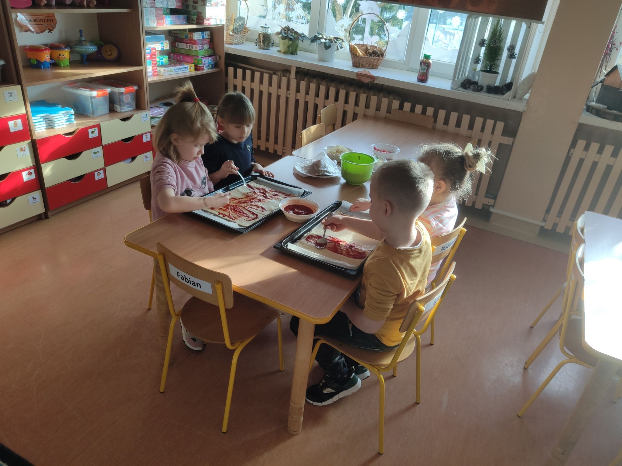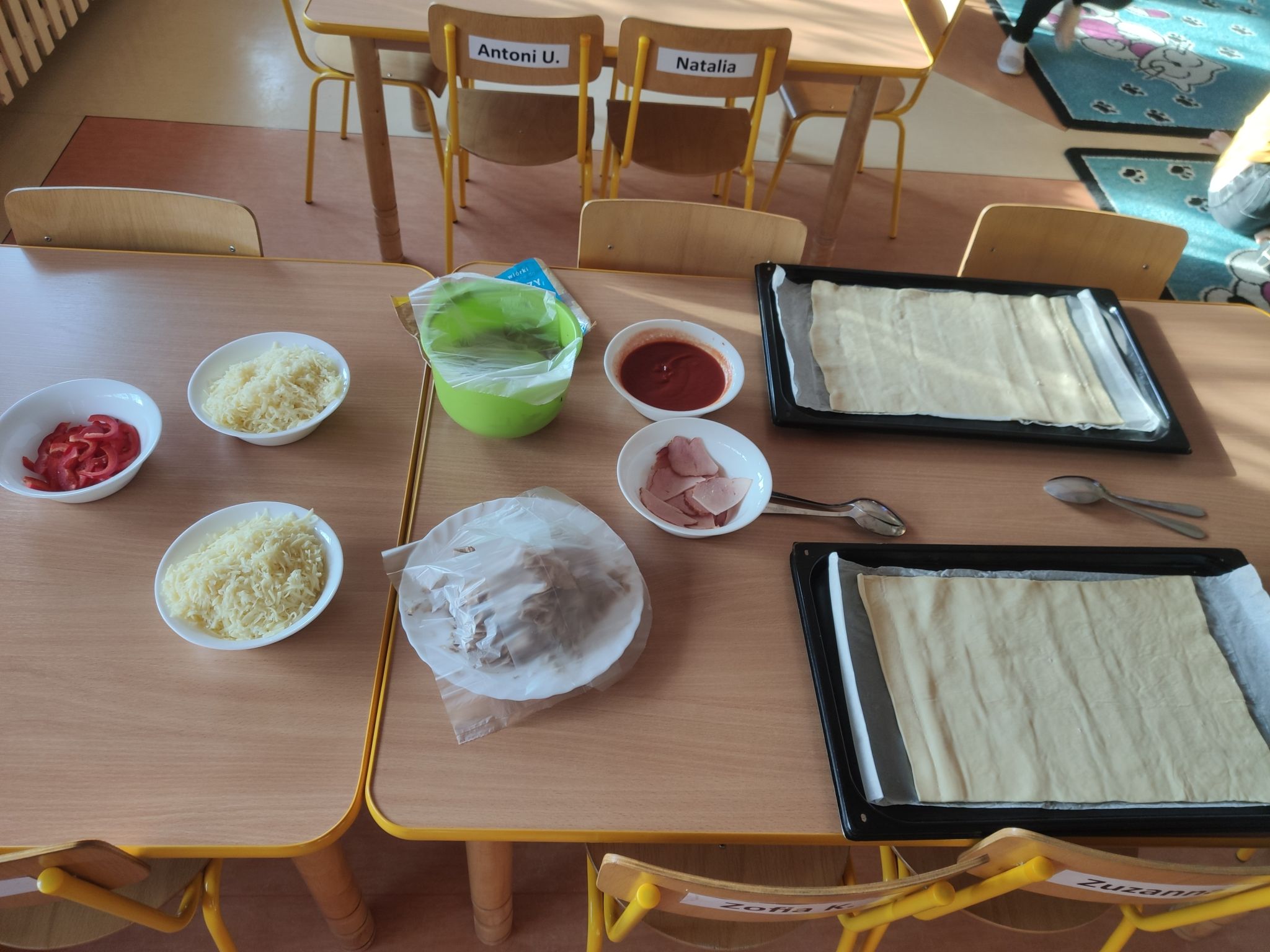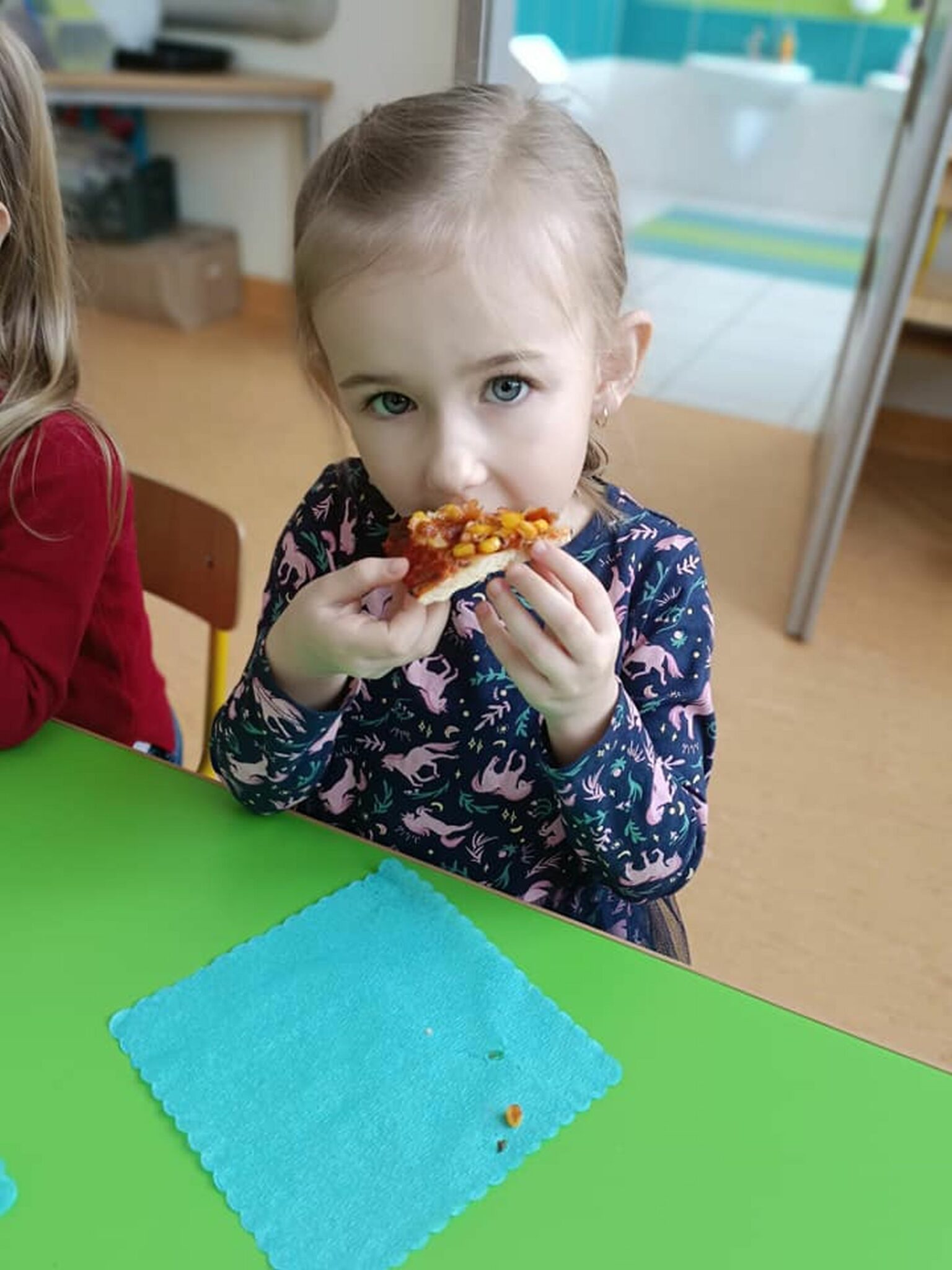 się bawiły, poszukiwały produktów koniecznych do zrobienia pizzy, dzieliły je na sylaby oraz odkrywały, te których nie znały. Jednak najważniejszą częścią było samodzielne zrobienie przez dzieci pizzy, a następnie jej konsumpcja. Przedszkolne sale zamieniły się na ten czas we włoskie restauracje, a dzieci doświadczyły w ten sposób stymulacji wszystkich zmysłów. Było pysznie!