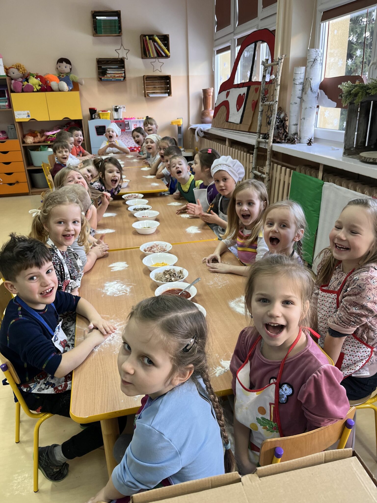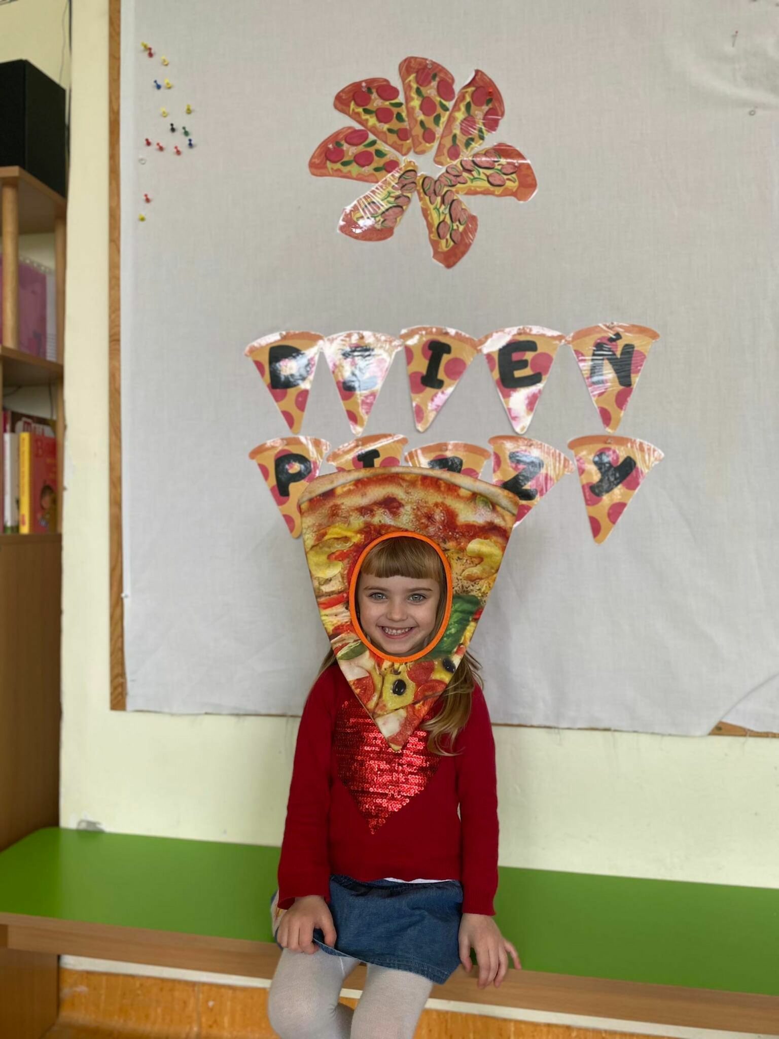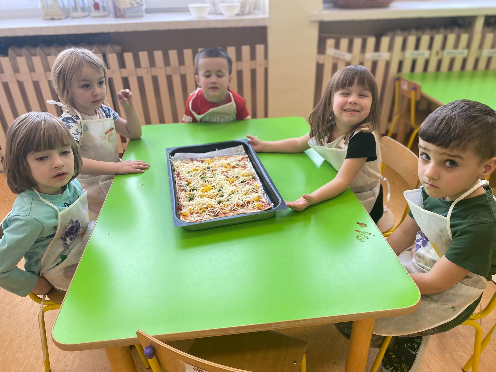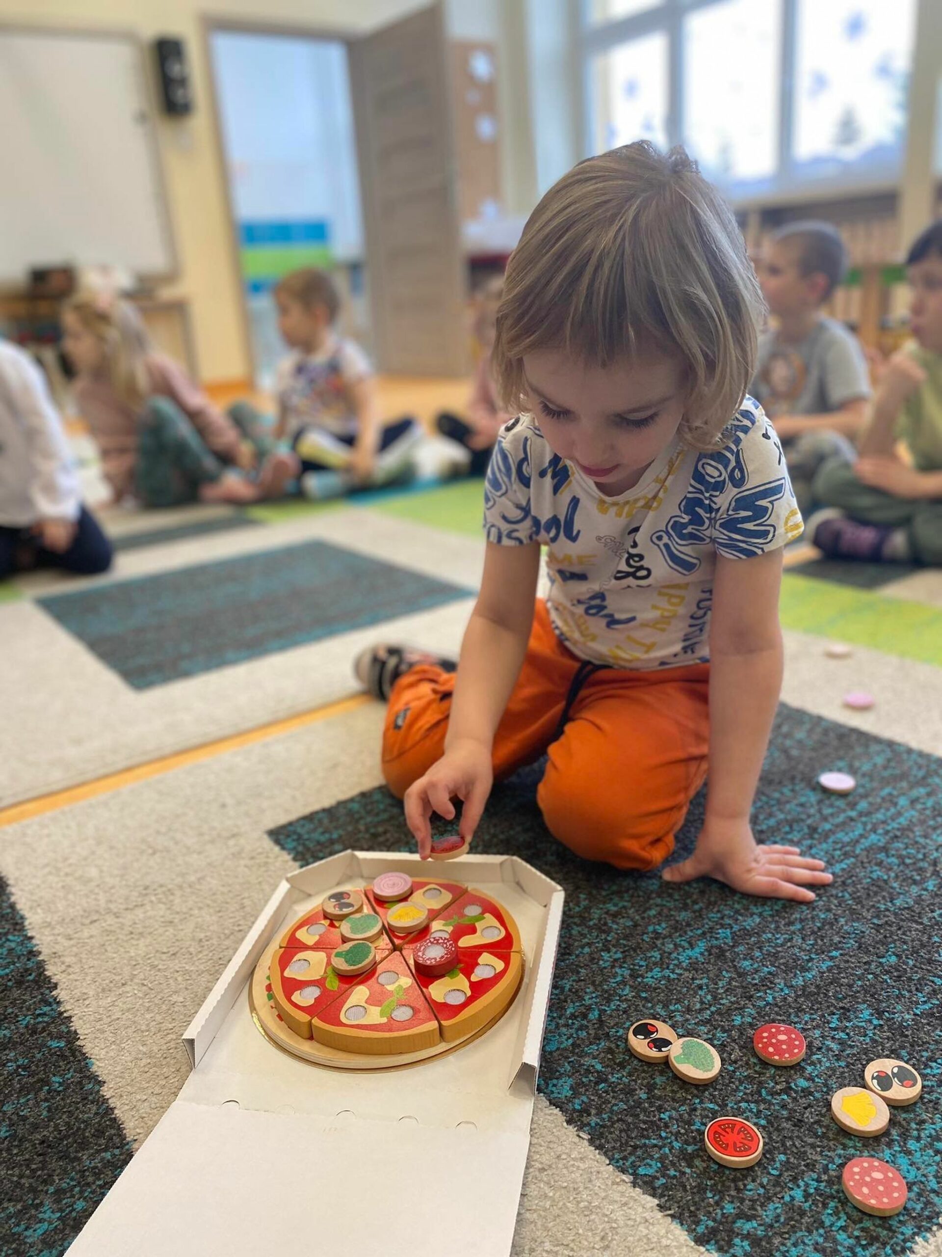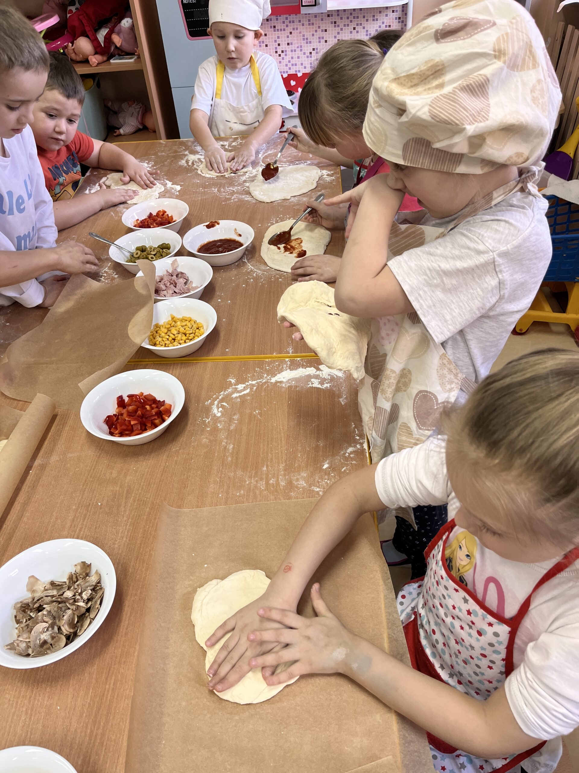 się bawiły, poszukiwały produktów koniecznych do zrobienia pizzy, dzieliły je na sylaby oraz odkrywały, te których nie znały. Jednak najważniejszą częścią było samodzielne zrobienie przez dzieci pizzy, a następnie jej konsumpcja. Przedszkolne sale zamieniły się na ten czas we włoskie restauracje, a dzieci doświadczyły w ten sposób stymulacji wszystkich zmysłów. Było pysznie!