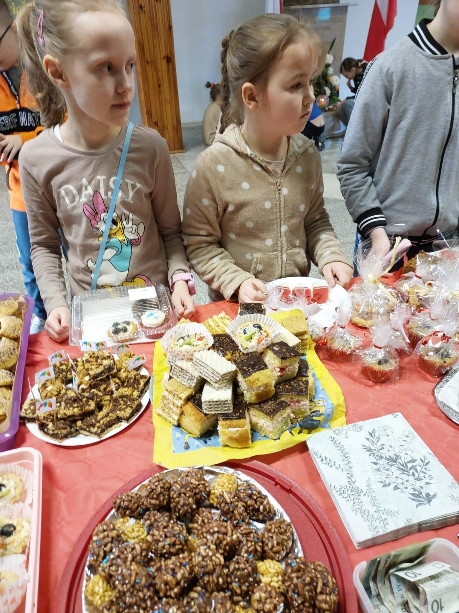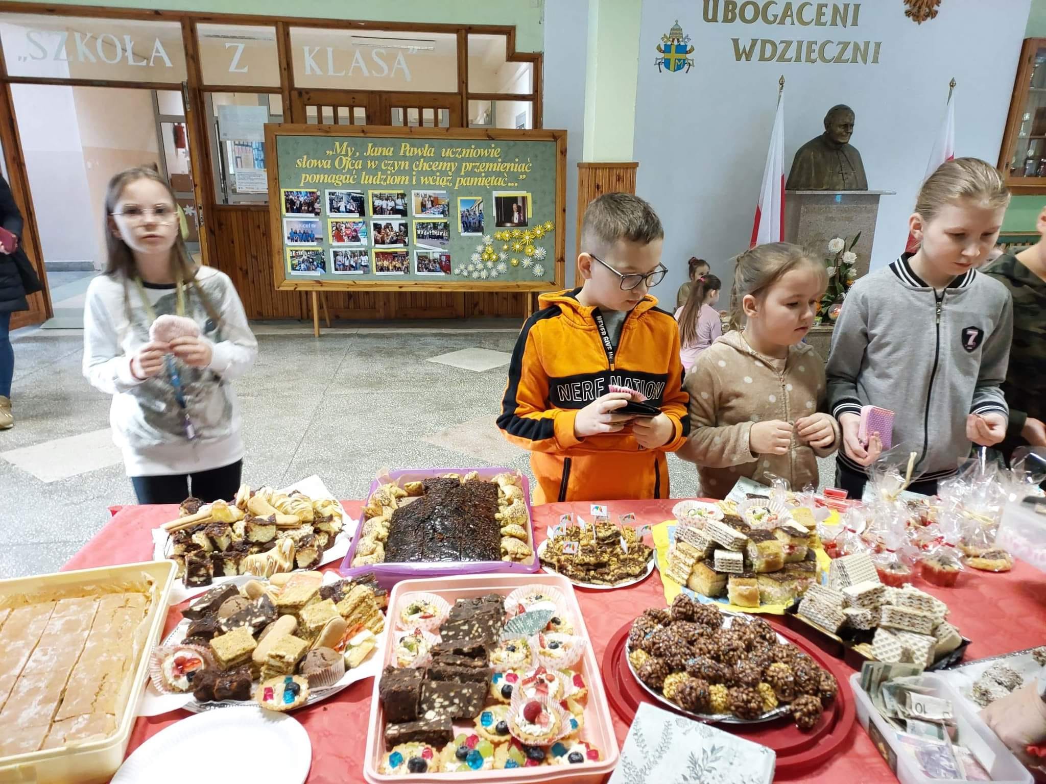przygotowali wspaniałe wypieki. Dziękujemy również nauczycielom i pracownikom obsługi, którzy z wielkim zaangażowaniem włączyli się w to przedsięwzięcie. Na kiermaszu nie brakowało słodkości, wśród nich były szarlotki, serniki, pierniki, babeczki, galaretki, wafelki, francuskie rogaliki i wiele innych domowych ciast. Nic dziwnego, że kiermasz cieszył się dużym zainteresowaniem. Niezmiernie miło nam, że dzięki wspólnej ofiarności i dobroci serca zebraliśmy 3397 zł . Pieniądze zostaną przekazane Fundacji Wszyscy Razem. Przy l kiermaszu pomagały uczennice z klasy 6a ,Lena Adamczyk, Weronika Antoniak,Dorota Gondek, Aleksandra Środa, Hanna Zielona, Kinga Zając oraz uczennice z klasy 8b, Amelia Molenda i Lena Wziątek. Koordynatorem akcji była pani Agnieszka Klimas, we współpracy z Paniami Sylwią Bernaś, Urszulą Szerszeń, Małgorzatą Tokarczyk i Iwoną Bitner.