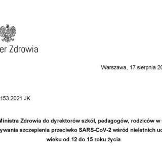 Do pobrania: List Ministra Zdrowia do dyrektorów szkół, pedagogów, rodziców w sprawie wykonywania szczepienia przeciwko SARS-CoV-2 wśród nieletnich uczniów w wieku od 12 do 15 roku życia -> pobierz