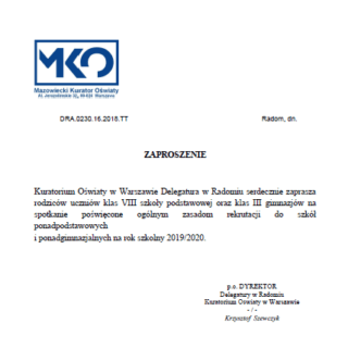 Kuratorium Oświaty w Warszawie Delegatura w Radomiu serdecznie zaprasza rodziców uczniów klas VIII szkoły podstawowej oraz klas III gimnazjów na spotkanie poświęcone ogólnym zasadom rekrutacji do szkół ponadpodstawowych i ponadgimnazjalnych na rok szkolny 2019/2020....