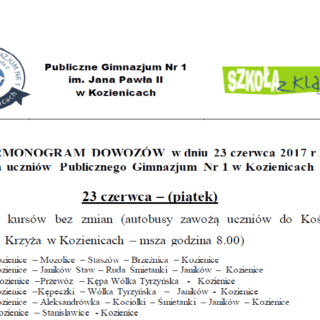 HARMONOGRAM DOWOZÓW w dniu 23 czerwca 2017 r .- dla uczniów Publicznego Gimnazjum Nr 1 w Kozienicach 23 czerwca – (piątek) 710 – 6 kursów bez zmian (autobusy zawożą uczniów do Kościoła Świętego...