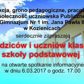 Dyrekcja, grono pedagogiczne, pracownicy i społeczność uczniowska Publicznego Gimnazjum Nr 1 im. Jana Pawła II w Kozienicach serdecznie zapraszają rodziców i uczniów klas III szkoły podstawowej na otwarte spotkanie informacyjne w poniedziałek 6 marca...