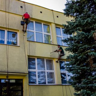 Od kilku dni możemy zauważyć na murach naszej szkoły specjalistów zajmujących się gruntownym odświeżeniem elewacji budynku. Z pomocą fachowego sprzętu alpinistycznego, przyjaznych dla środowiska środków czyszczących i nowoczesnych myjek ciśnieniowych nasza szkoła odzyskuje blask....