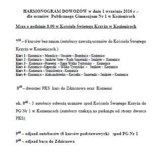 HARMONOGRAM DOWOZÓW w dniu 1 września 2016 r .- dla uczniów Publicznego Gimnazjum Nr 1 w Kozienicach Msza o godzinie 8.00 w Kościele Świętego Krzyża w Kozienicach 740 – 6 kursów bez...