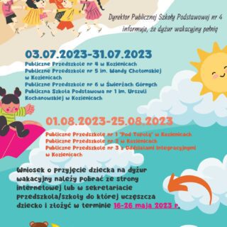 Do pobrania: Zarządzenie Burmistrza Gminy Kozienice -> pobierz Wniosek o przyjęcie dziecka na dyżur wakacyjny – przedszkole -> pobierz
