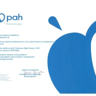 Nasza placówka otrzymała podziękowanie z Polskiej Akcji Humanitarnej za udział w tegorocznej edycji Obchodów „ Światowego Dnia Wody z PAH”. Celem akcji było podnoszenie świadomości nt. globalnych wyzwań wodnych oraz zaangażowanie do działania na...