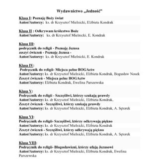 Podręczniki do religii dla szkoły podstawowej na rok szkolny 2022/2023 Wydawnictwo „Jedność” Klasa I: Poznaję Boży świat Autor/Autorzy: ks. dr Krzysztof Mielnicki, Elżbieta Kondrak Klasa II : Odkrywam królestwo Boże Autor/Autorzy: ks....