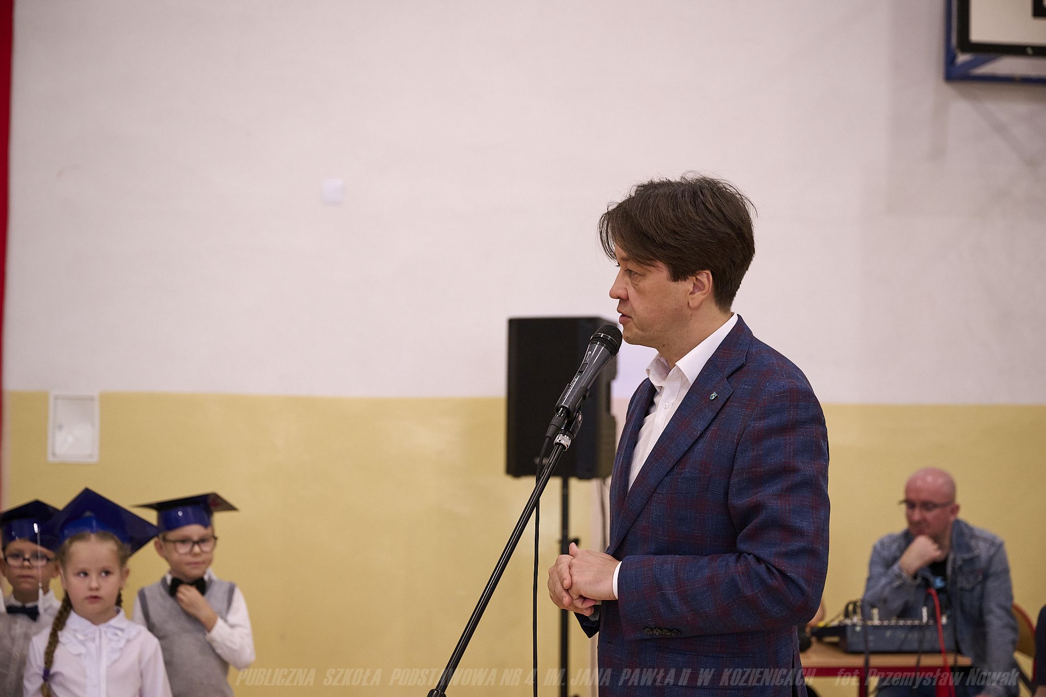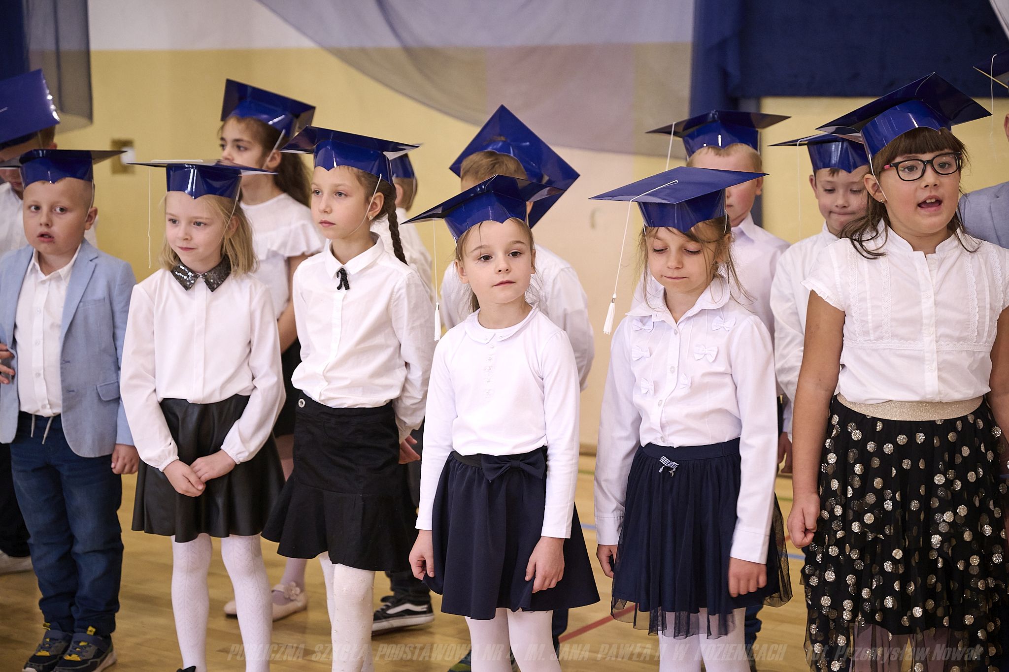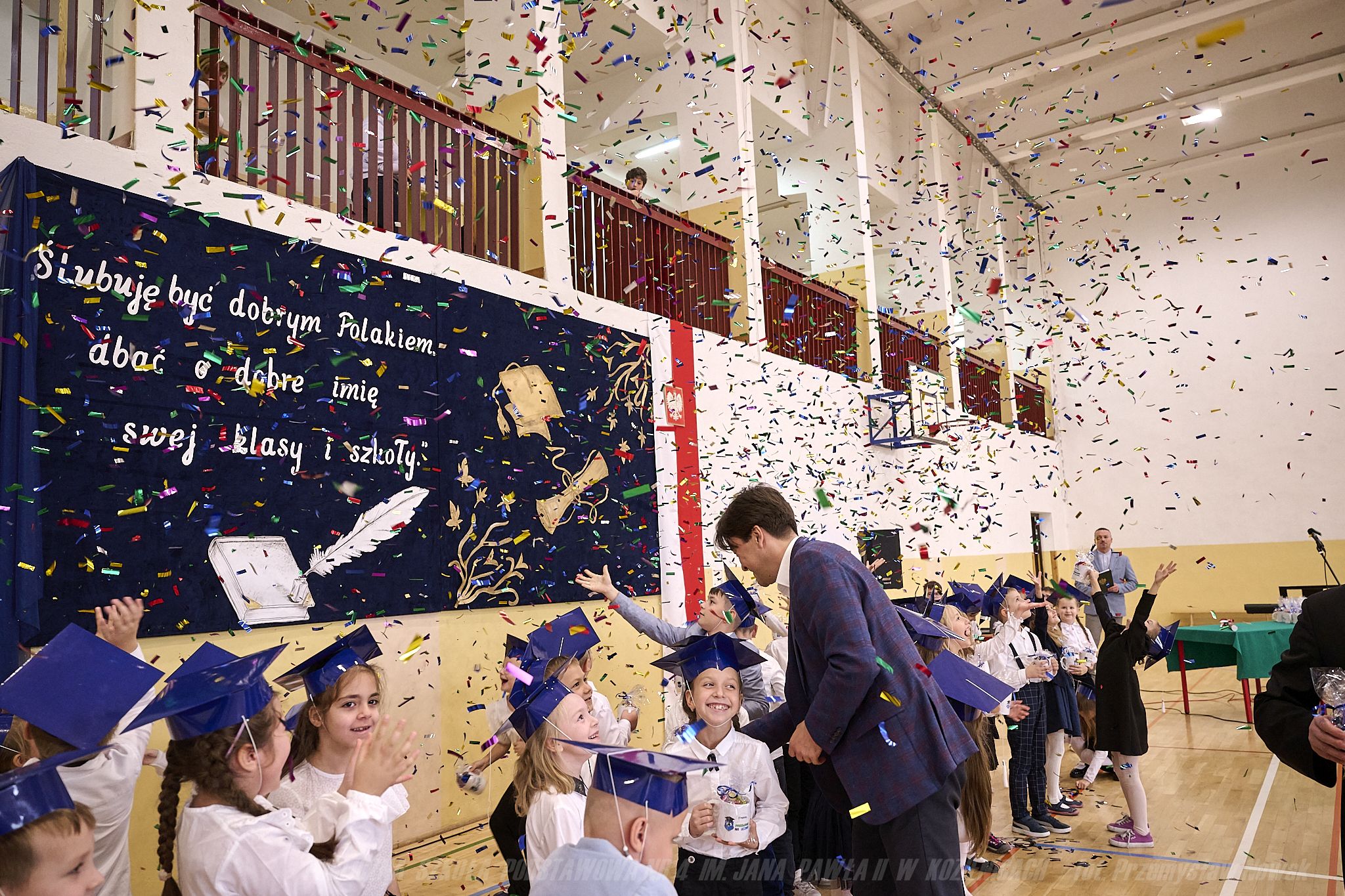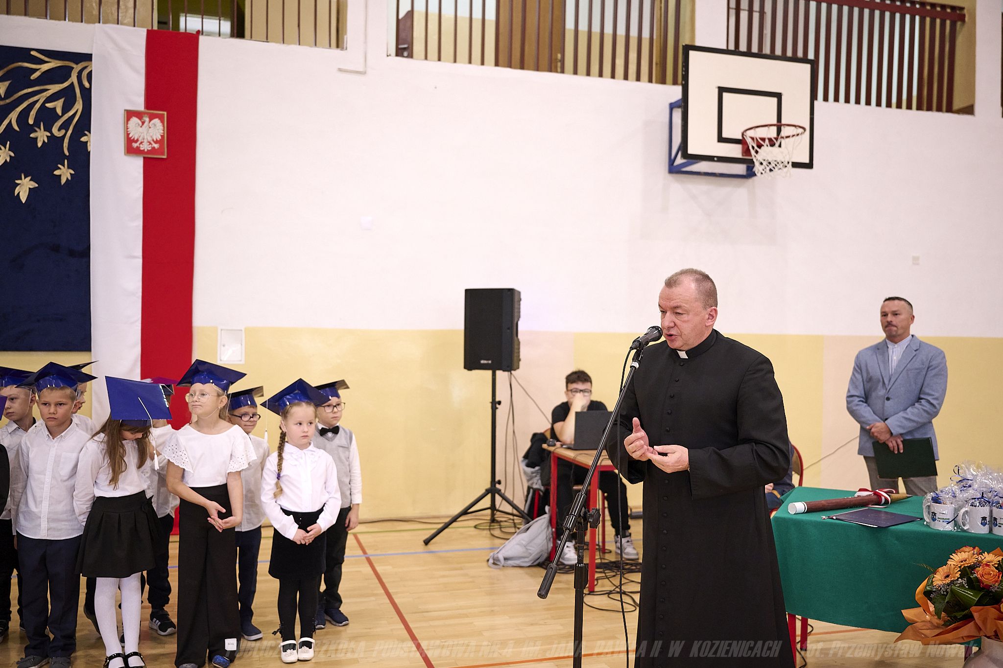W piątek 20 października 2023 r. odbyła się ważna dla pierwszoklasistów uroczystość – pasowania na ucznia. Wychowawczynie klas 1a, 1b, 1c panie: Magdalena Prygiel, Agnieszka Subocz i Małgorzata Tokarczyk tanecznym krokiem poloneza wprowadziły uczniów na salę. Uroczystość rozpoczął Dyrektor Szkoły Pan Andrzej Suwała, który przywitał przybyłych gości: Pana Piotra Kozłowskiego – Burmistrza Gminy Kozienice, Pana Łukasza Słyka – Przewodniczącego Rady Rodziców, księdza Dariusza Sałka – proboszcza parafii pw. Świętego Krzyża w Kozienicach oraz licznie zgromadzonych Rodziców.