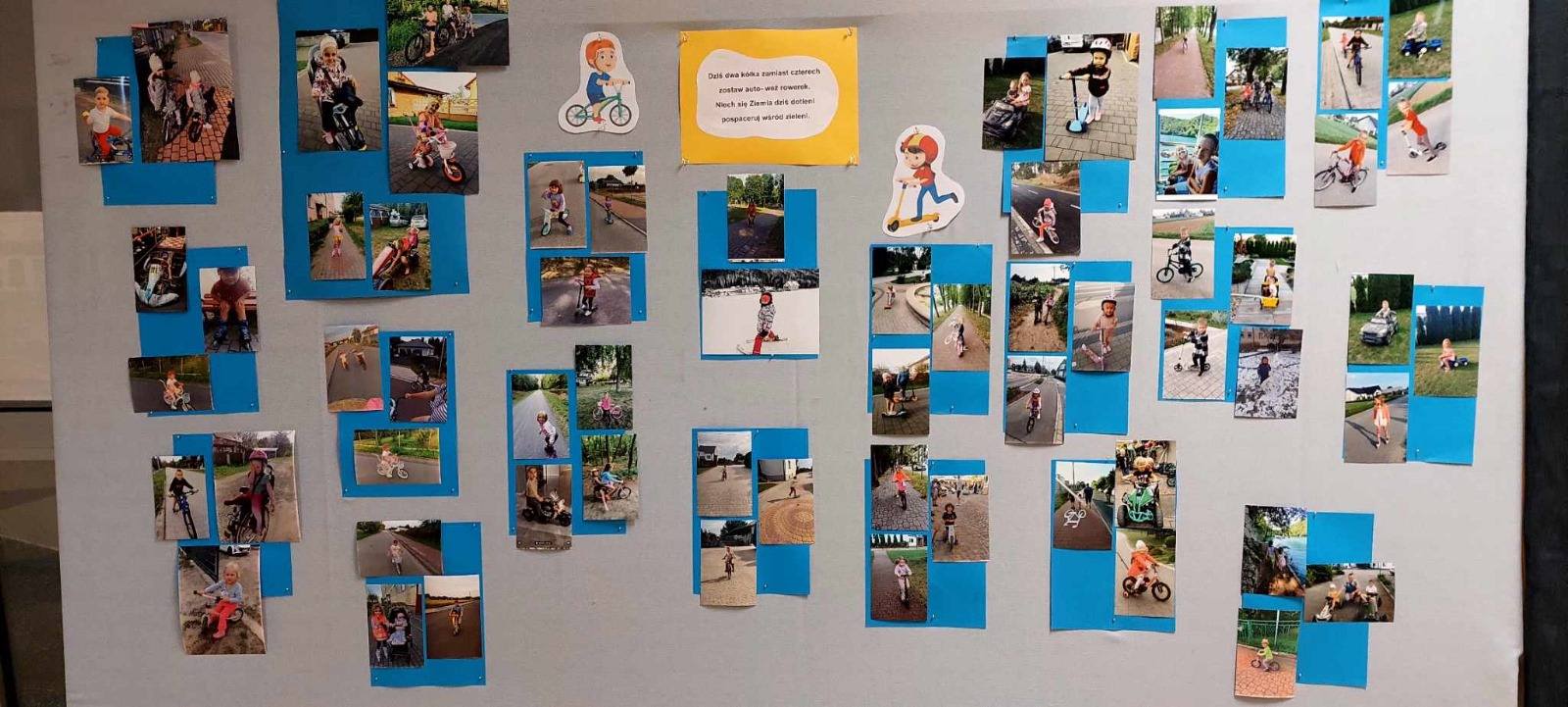 Rodzice przynieśli zdjęcia przedstawiające dzieci podczas przejażdżek na hulajnogach, rolkach i rowerach. Powstał bardzo ciekawy kolaż. Prace plastyczne i kolaż można podziwiać na korytarzu przedszkolnym.