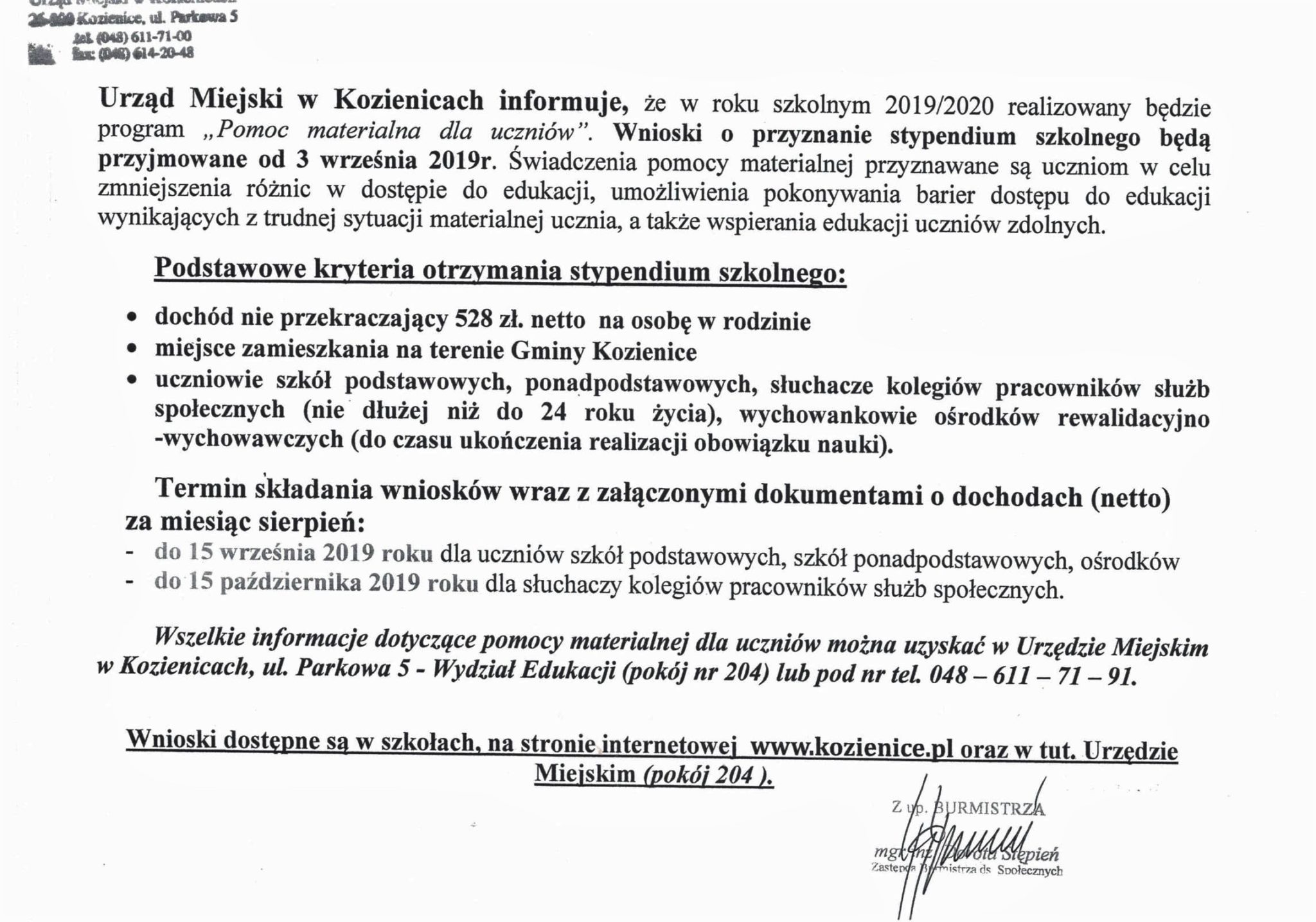 Pomoc materialna dla uczniów przez admin · 29 sierpnia 2019 Urząd Miejski informuje, że w roku szkolnym 2019/2020 realizowany będzie program „Pomoc materialna dla uczniów”. Wnioski o przyznanie stypendium szkolnego będą przyjmowane od 3 września