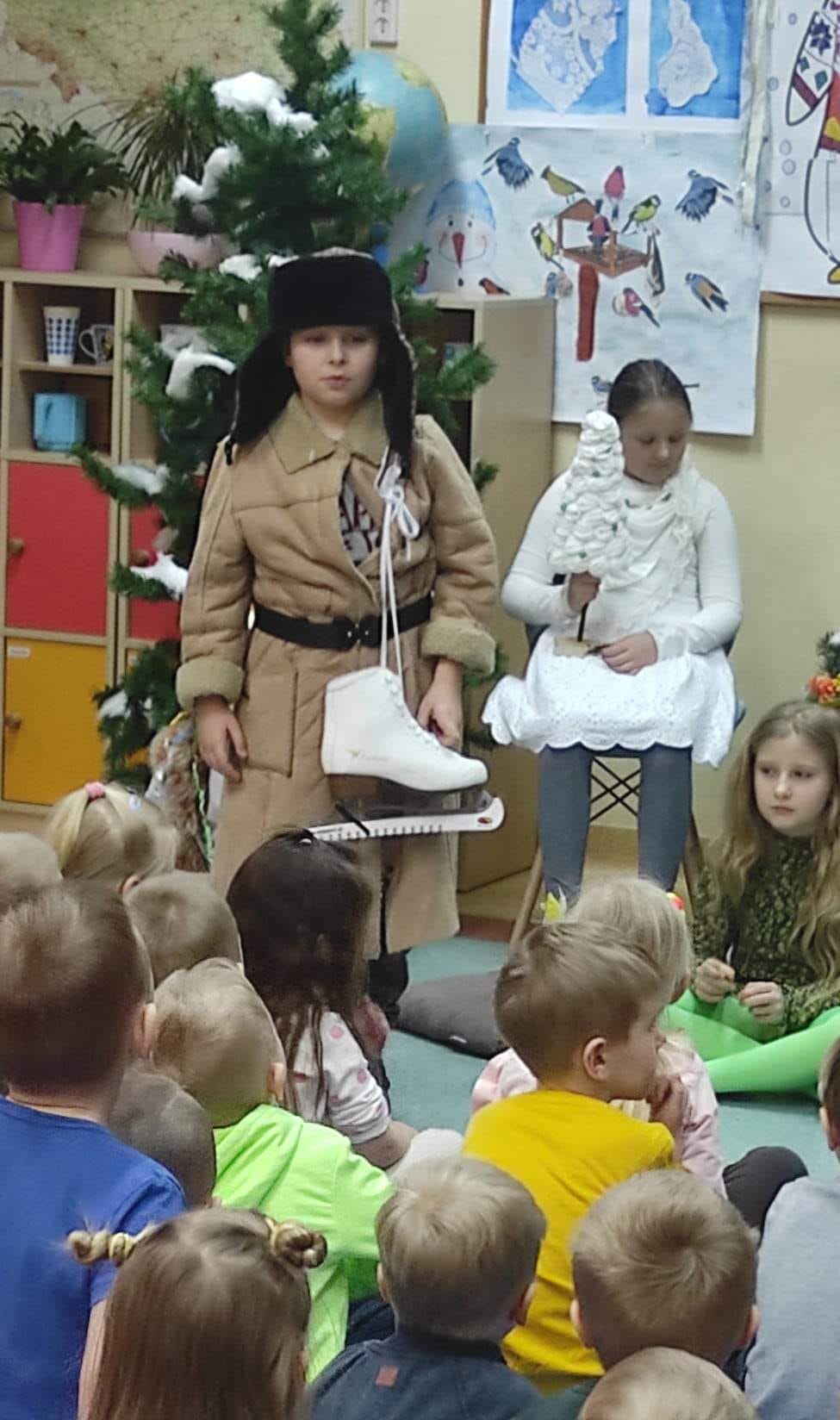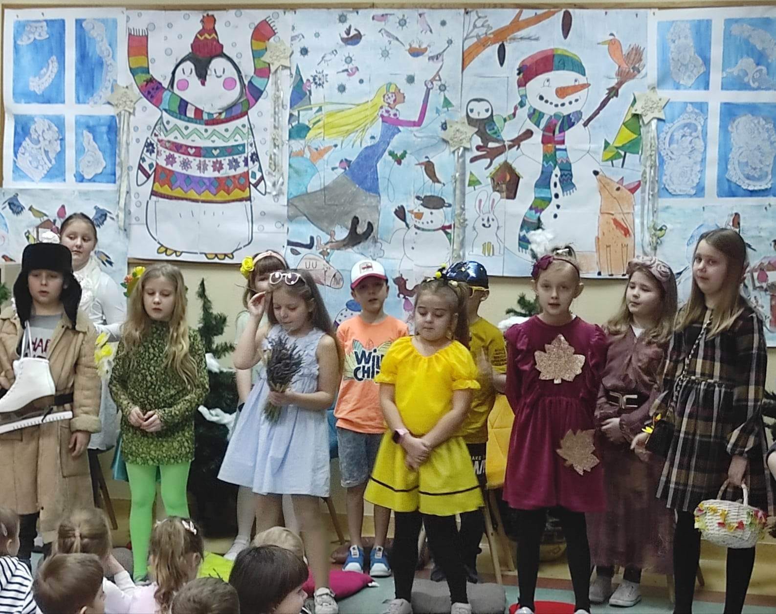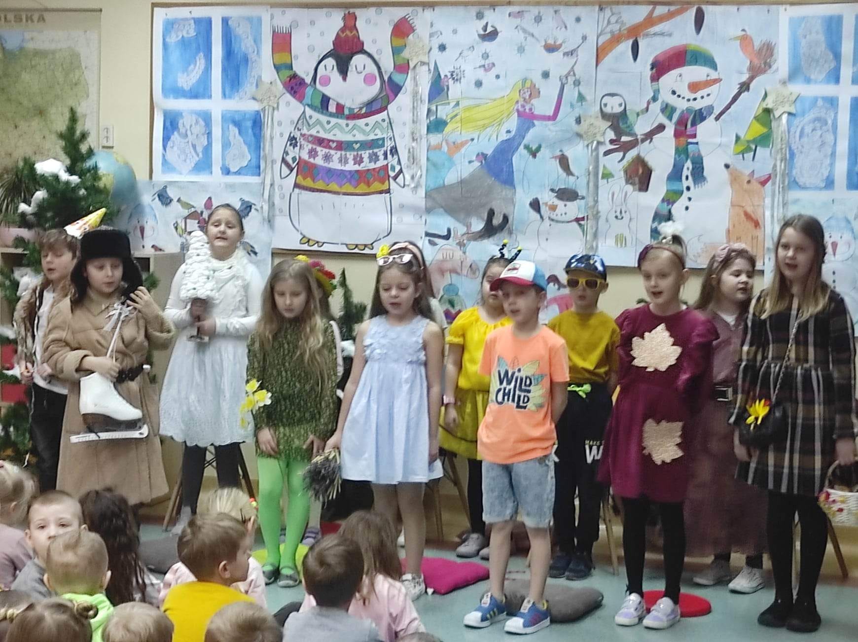 W dniu 26 stycznia uczniowie klasy 2a, przygotowani przez wychowawczynię wystąpili przed koleżankami i kolegami z oddziałów przedszkolnych z montażem słowno – muzycznym ,, Pory roku i miesiące”. Drugoklasiści poprzez stroje, dekorację, teksty oraz piosenki przywołali pory roku i miesiące. Publiczność wzięła aktywny udział, odpowiadając na zagadki i pytania związane z przedstawieniem. Dzięki nim utrwaliła charakterystyczne symbole i zwiastuny poszczególnych pór roku i miesięcy. Zdolności aktorskie starszych koleżanek i kolegów spodobały się gościom, którzy nagrodzili występ gromkimi brawami. Przedszkolaki po przedstawieniu wyszły pełne wrażeń, z uśmiechem na twarzy.