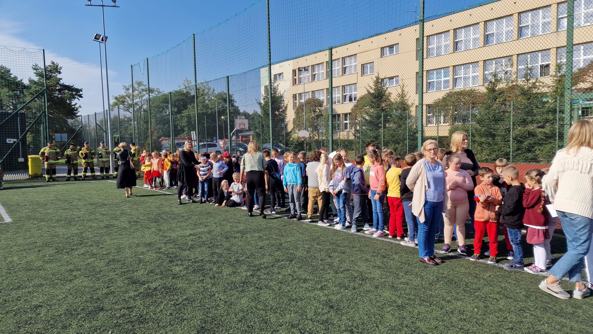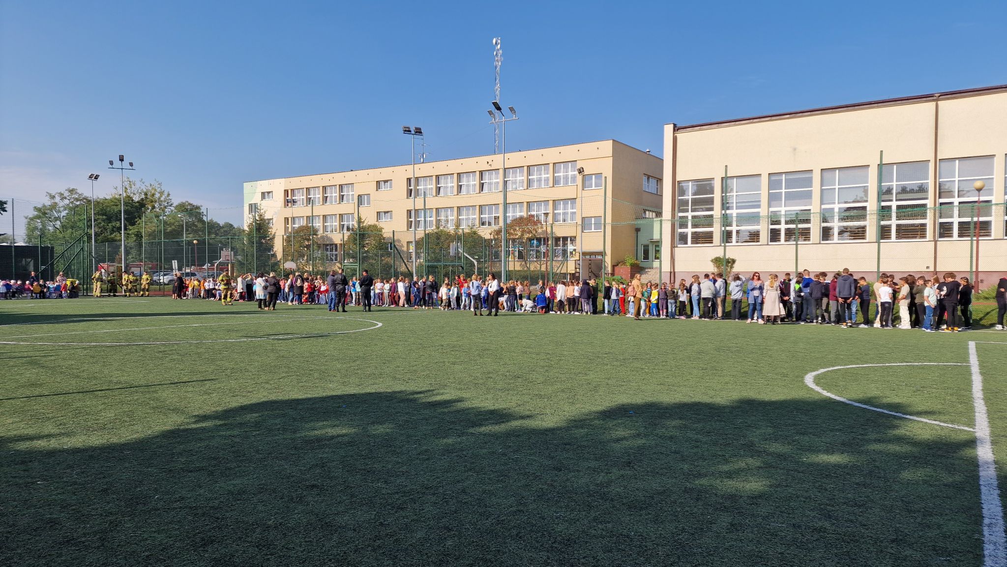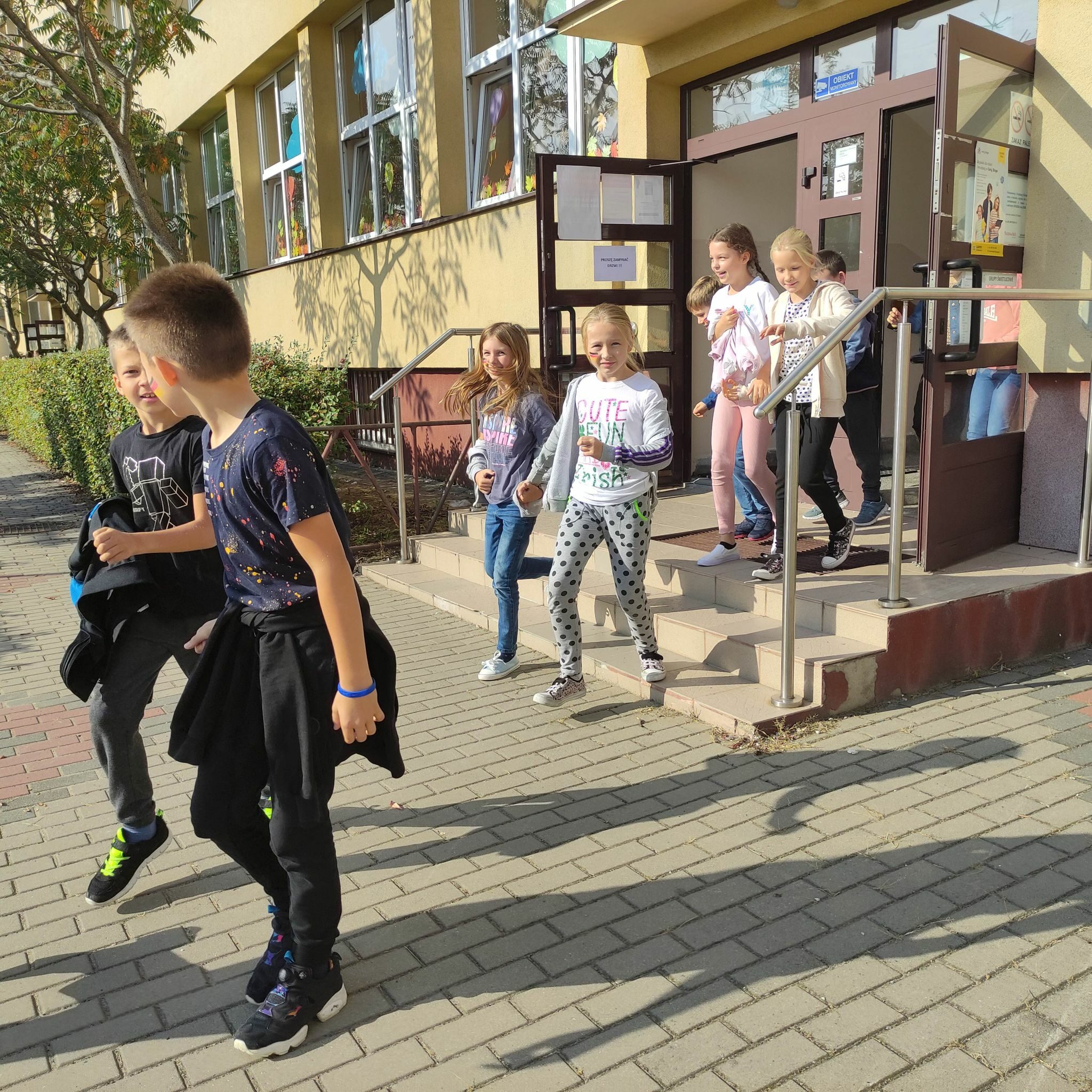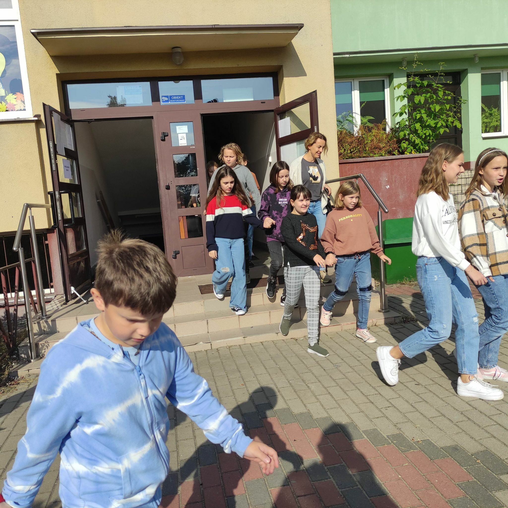 Uczniowie i nauczyciele, zachowując środki bezpieczeństwa, szybko i sprawnie opuścili budynek szkoły. Wszyscy w spokoju i bez paniki wykonali zadanie próbnego alarmu.